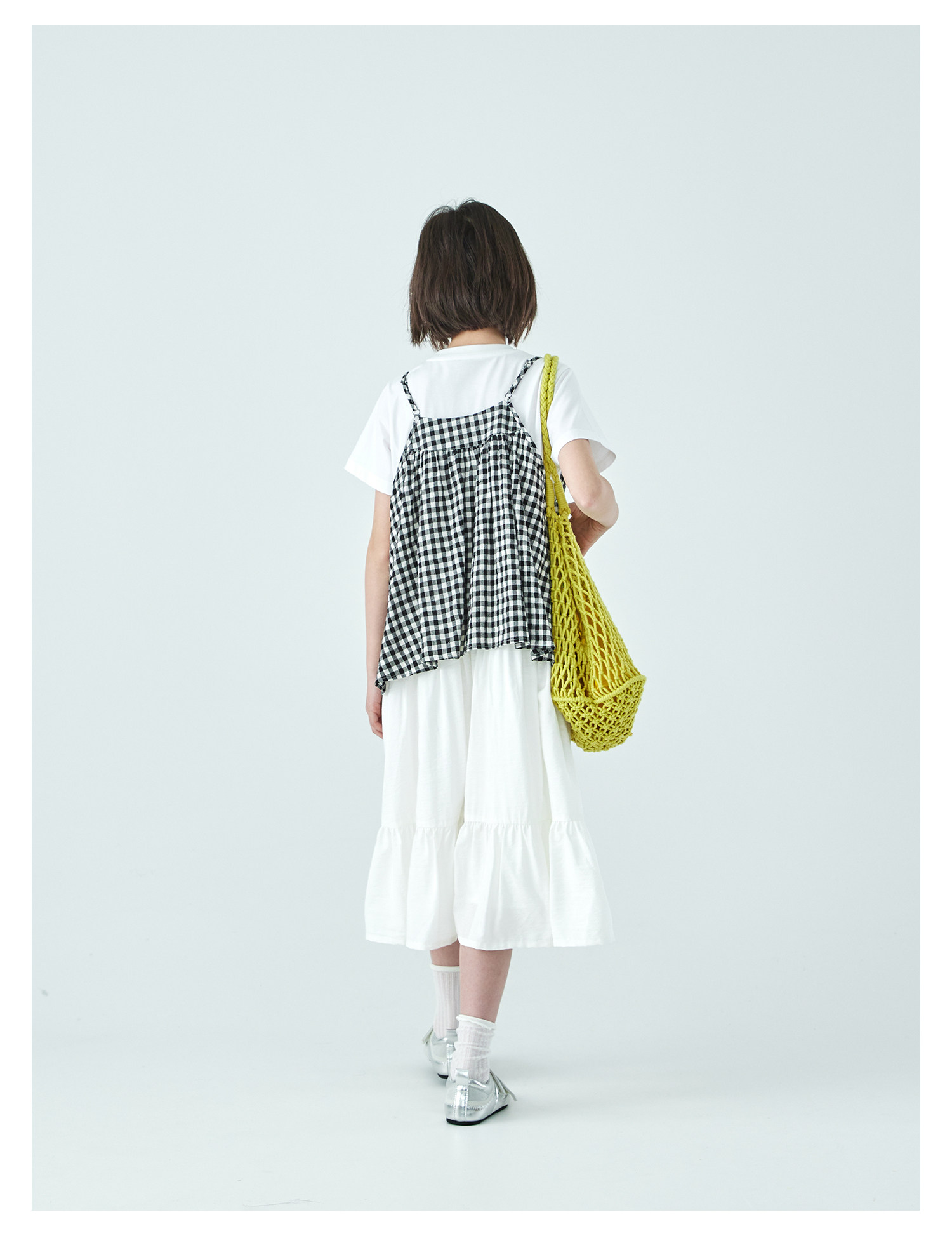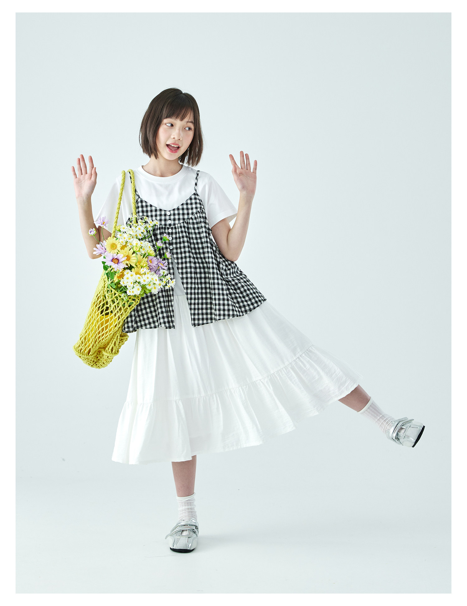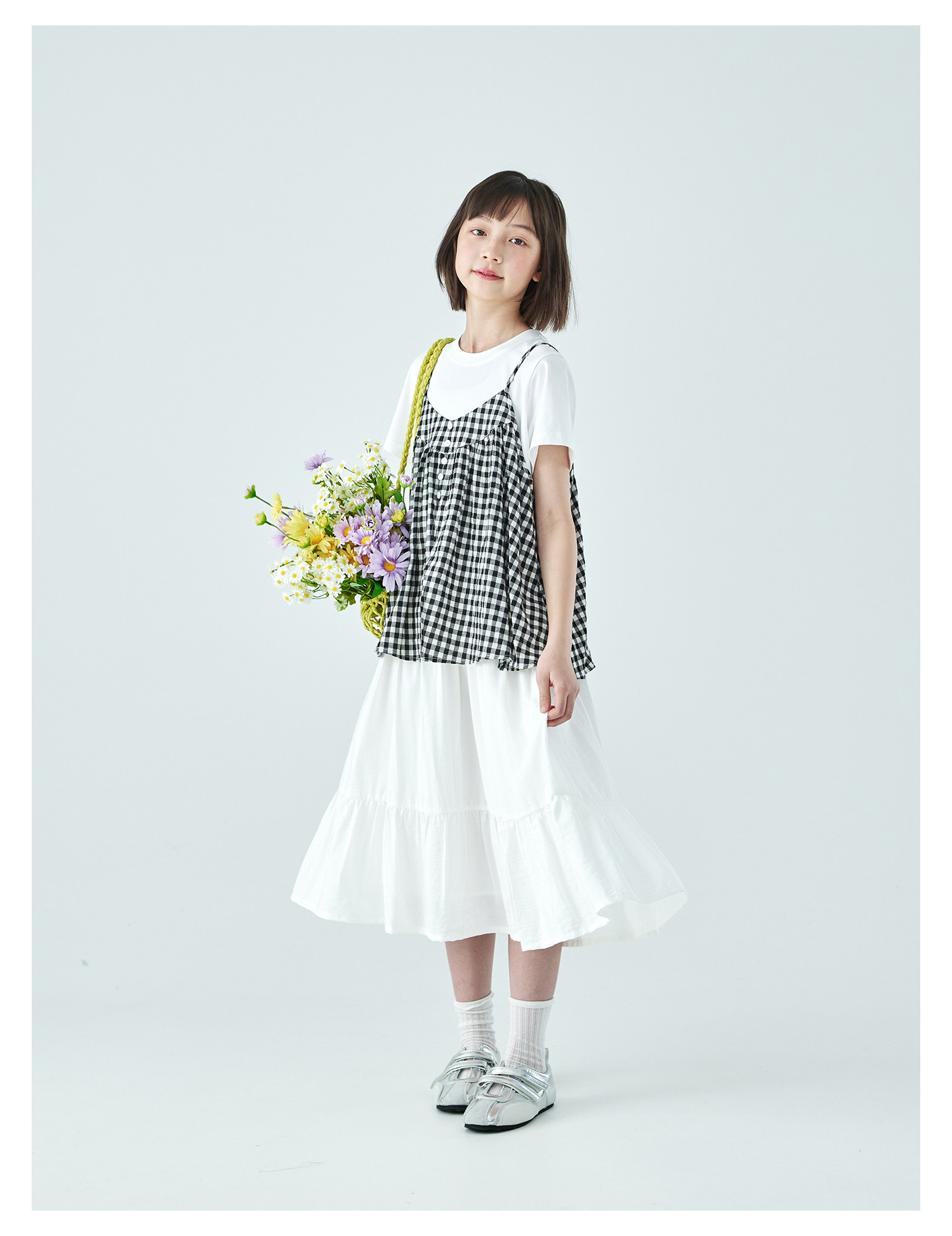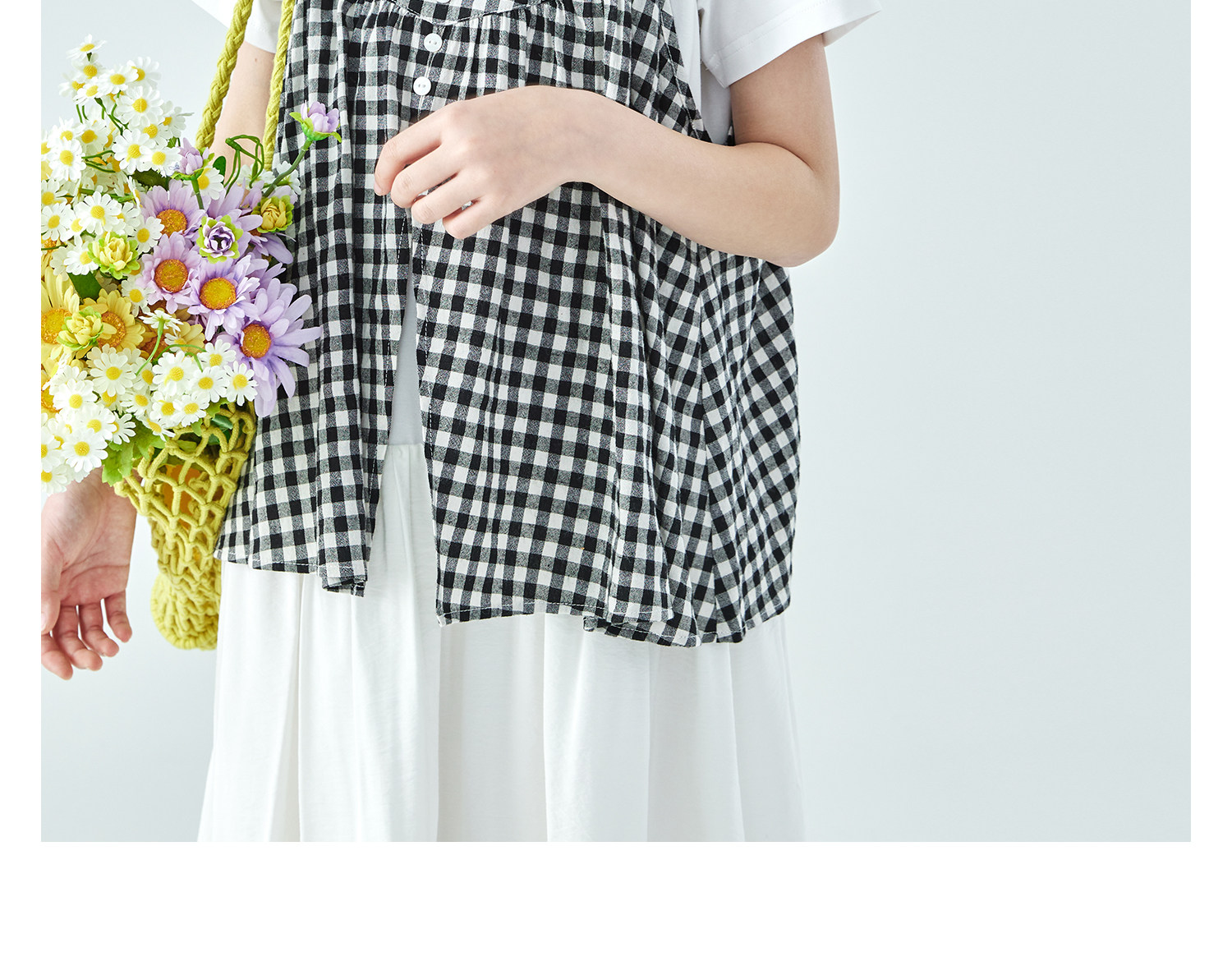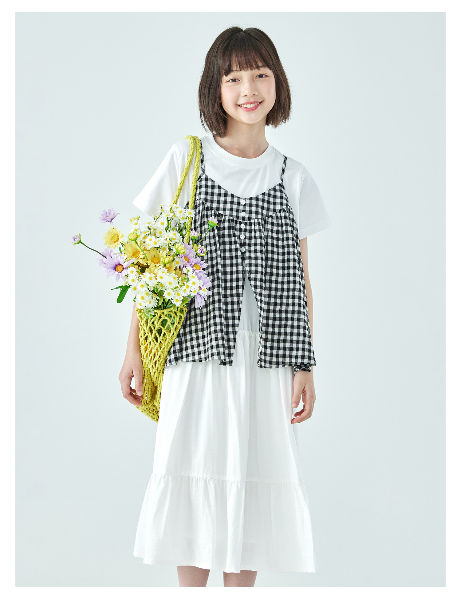 棵初26年夏新款亲子中大女童黑白格纹吊带短袖T恤连衣裙两件套装