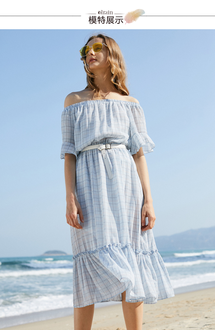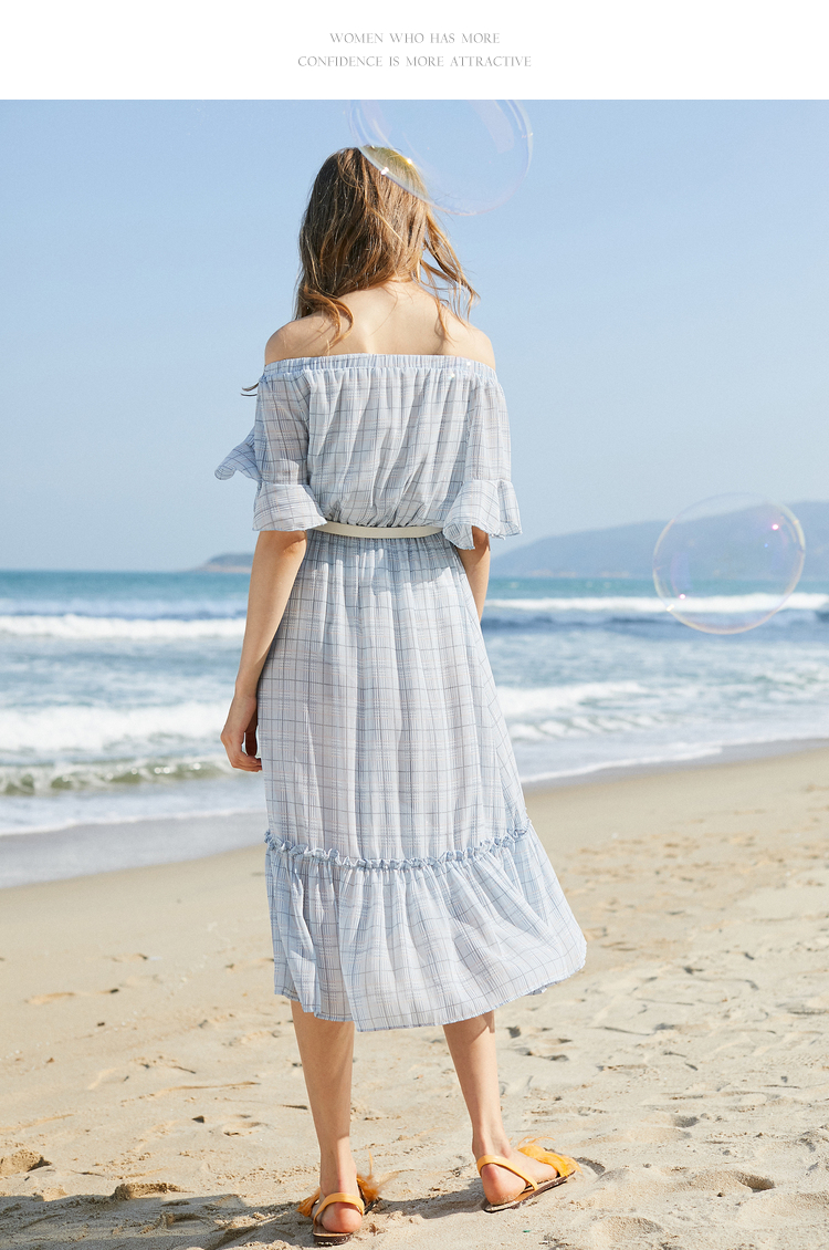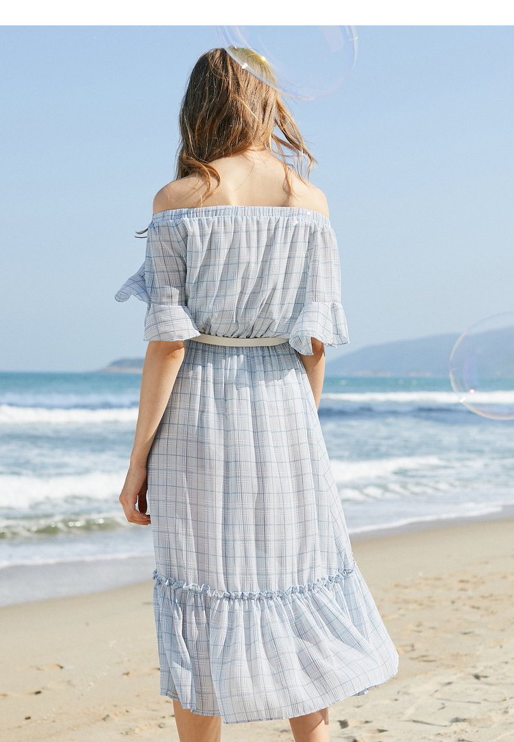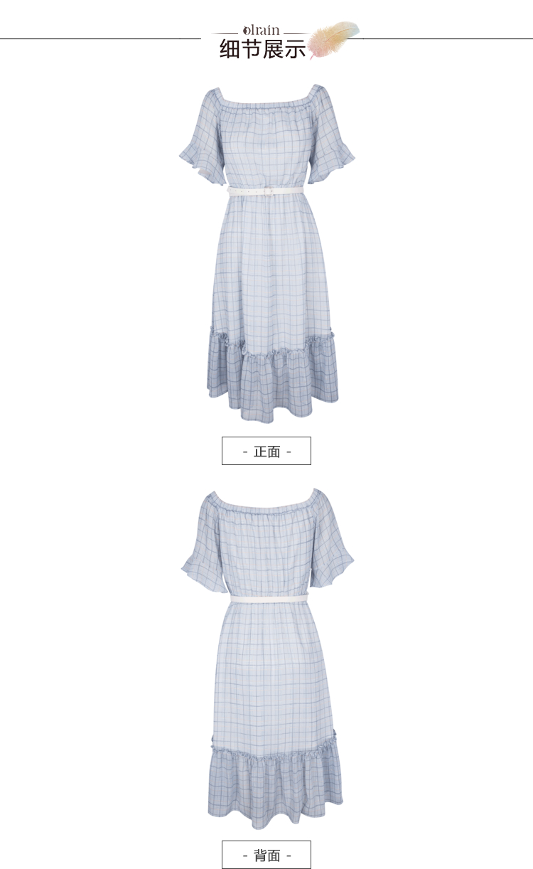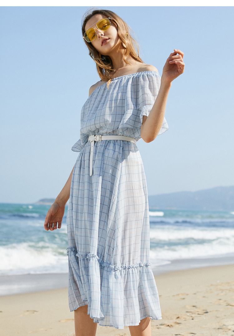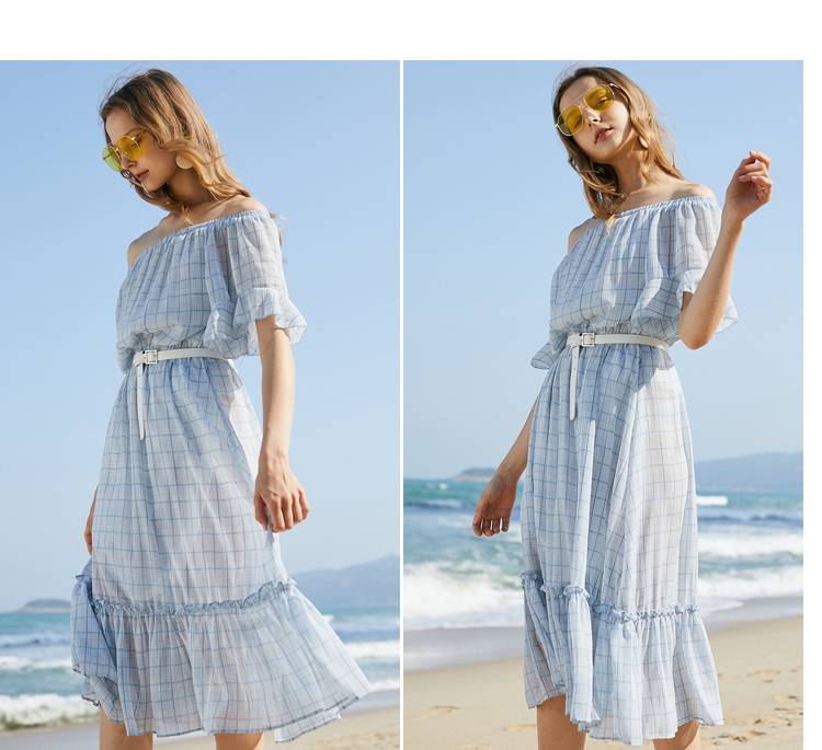 2018夏荷叶边喇叭袖一字肩格子雪纺连衣裙女中长