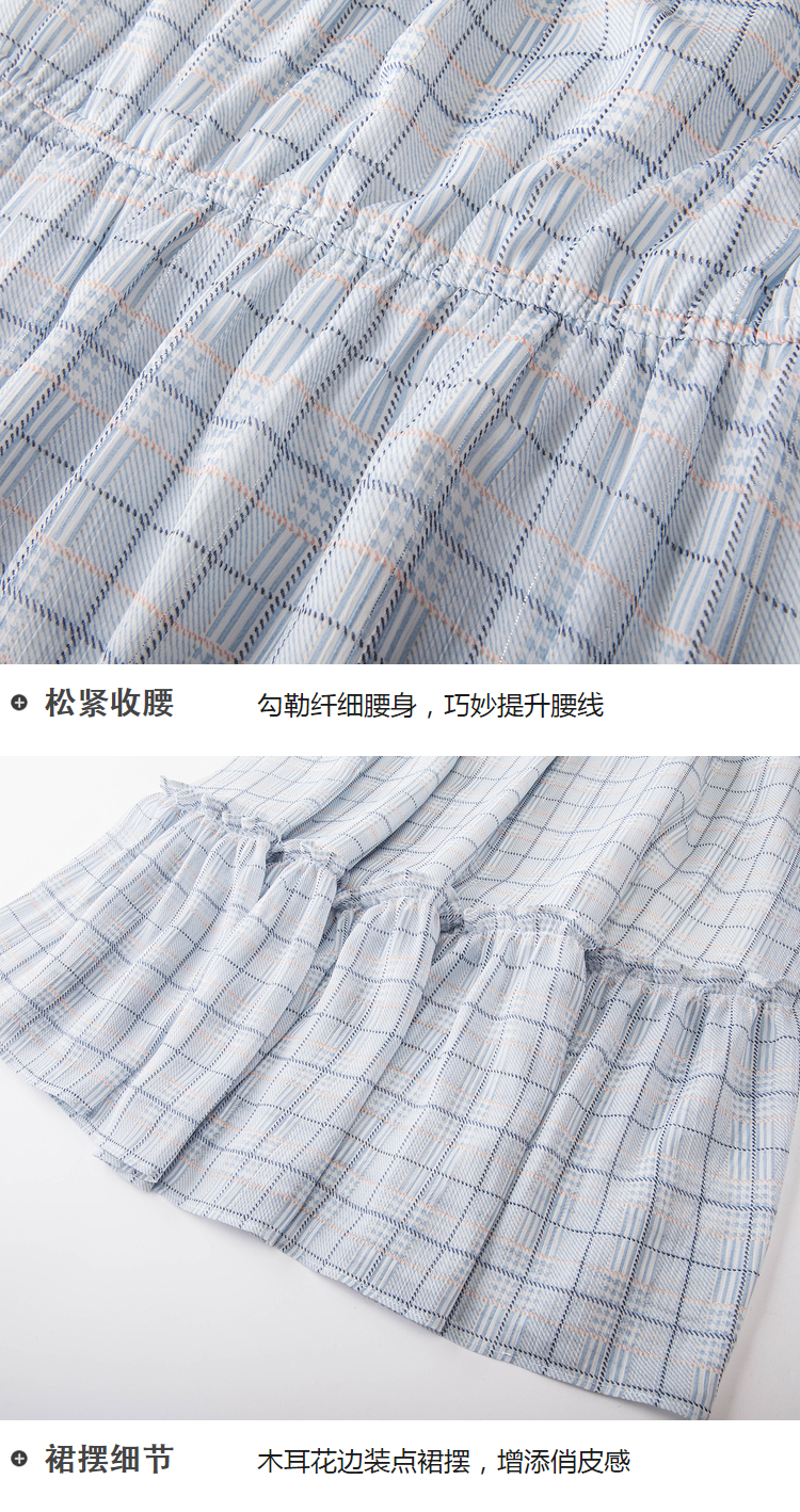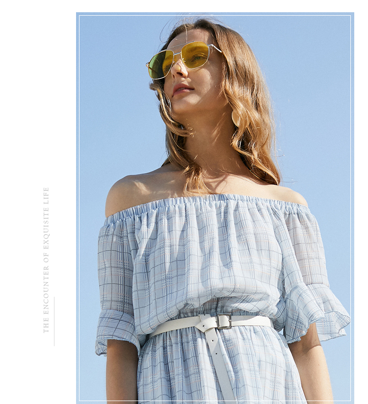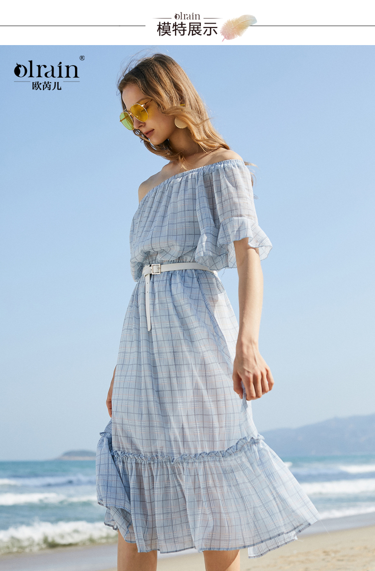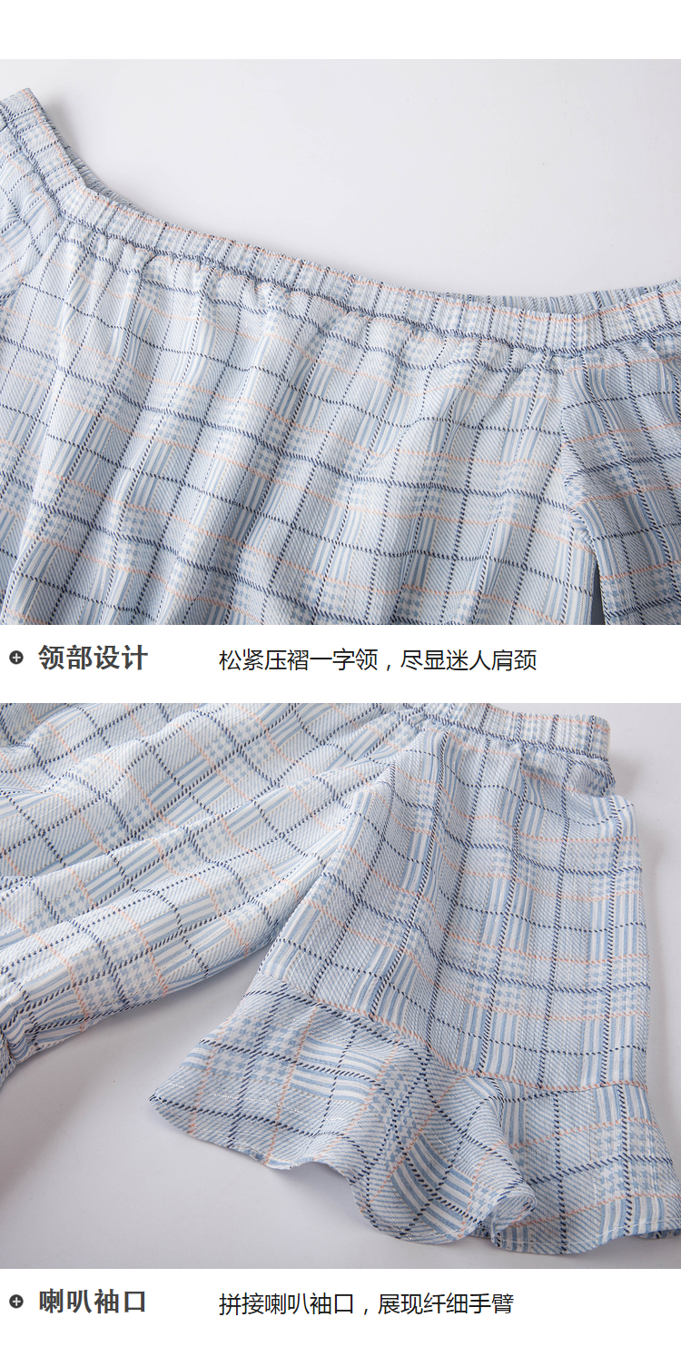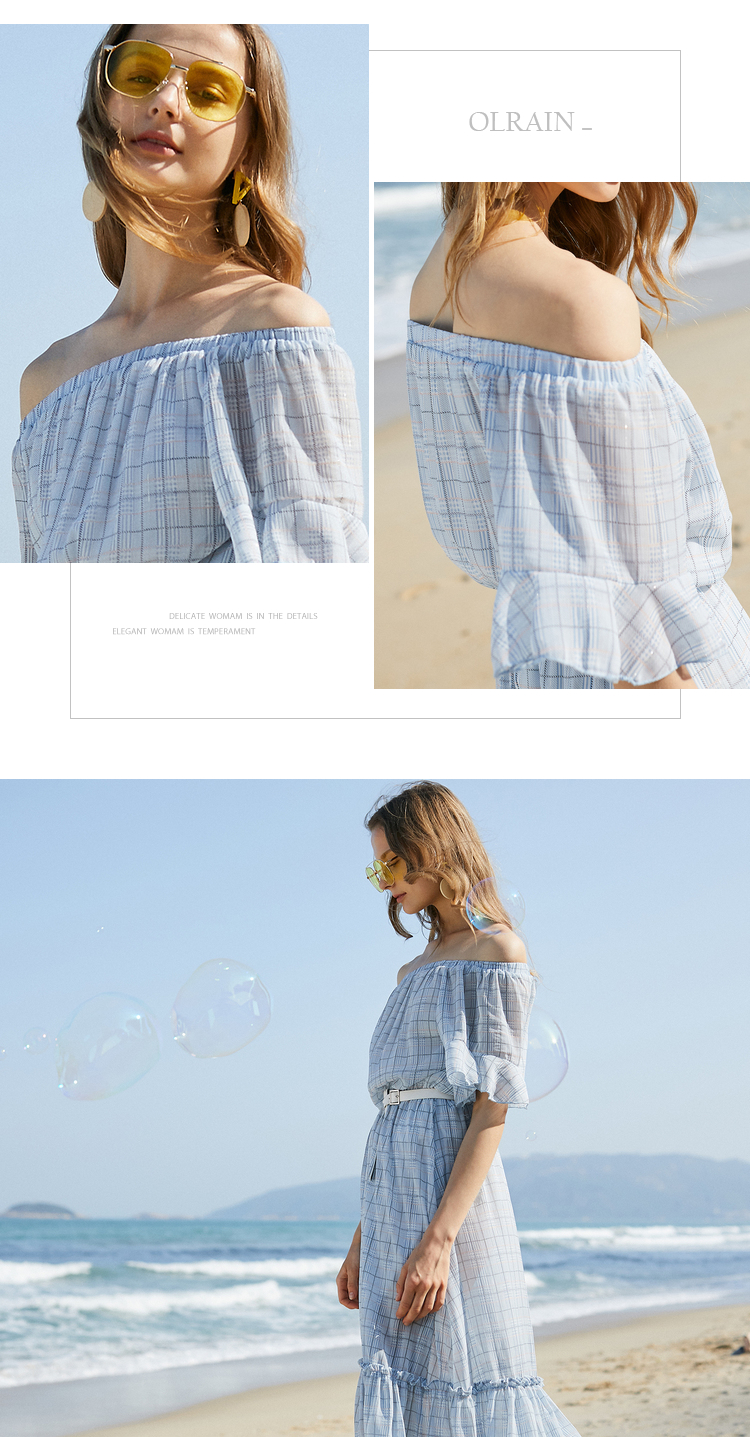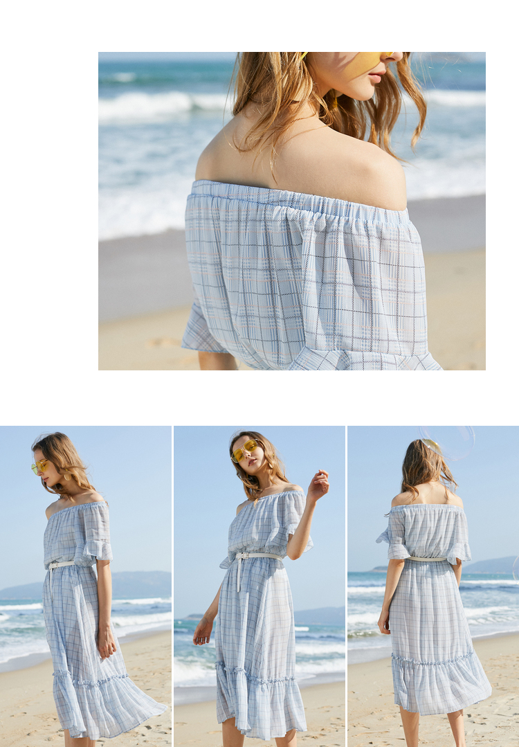 2018夏荷叶边喇叭袖一字肩格子雪纺连衣裙女中长