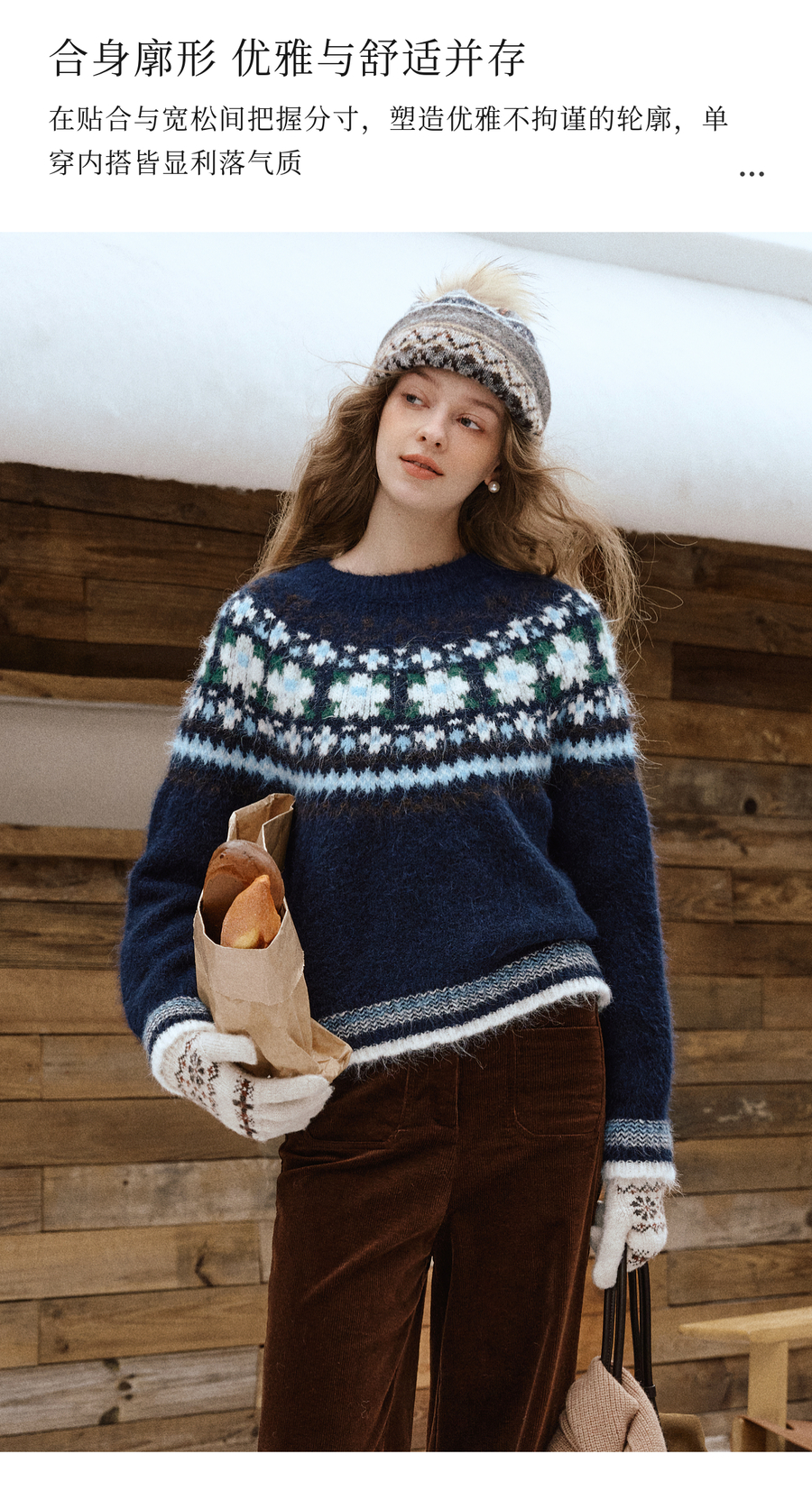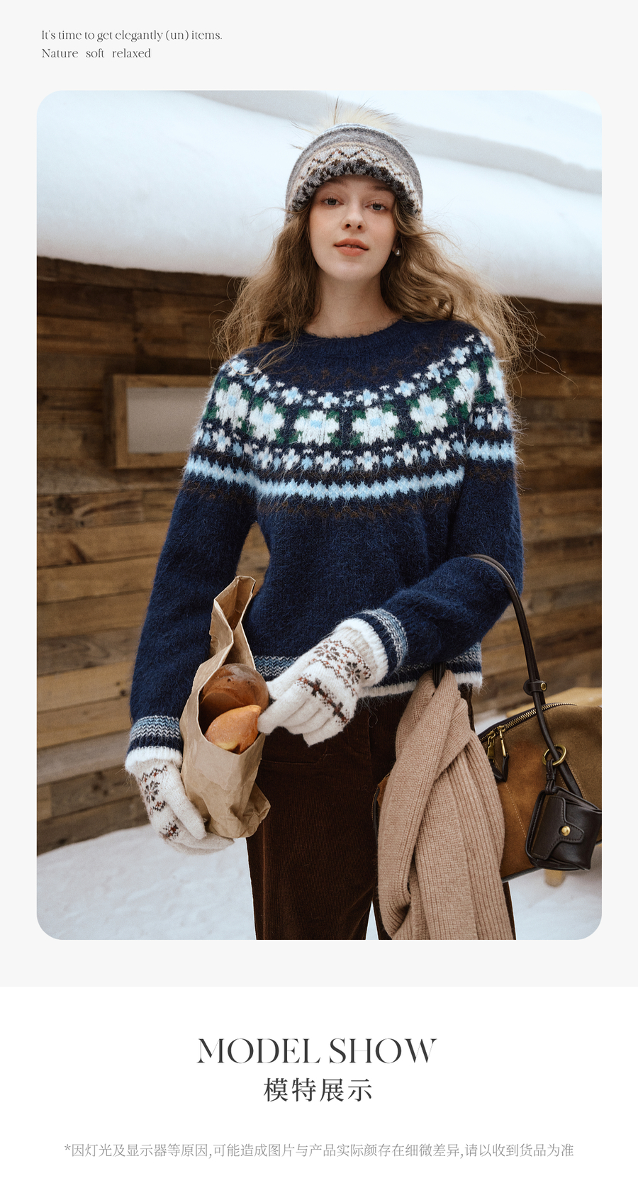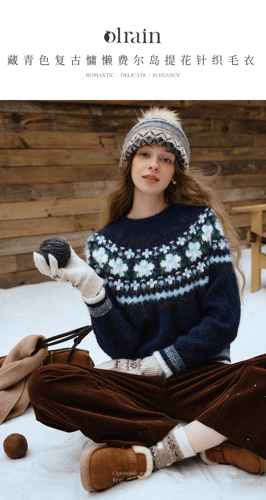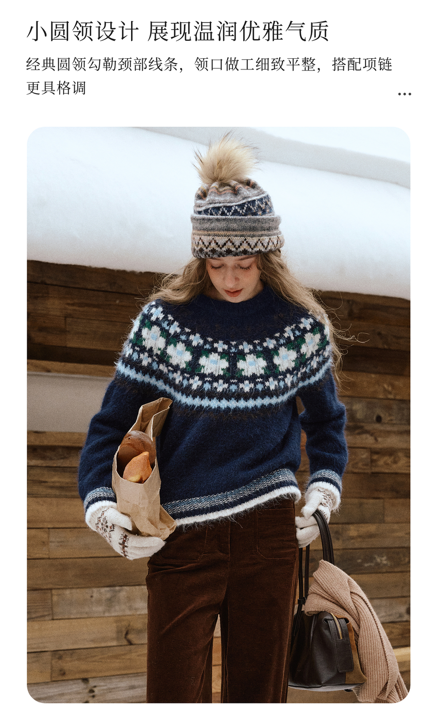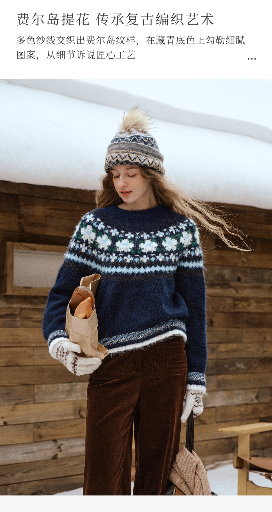 费尔岛藏青色提花圆领羊毛针织衫女2025冬季新款休闲减龄套头毛衣