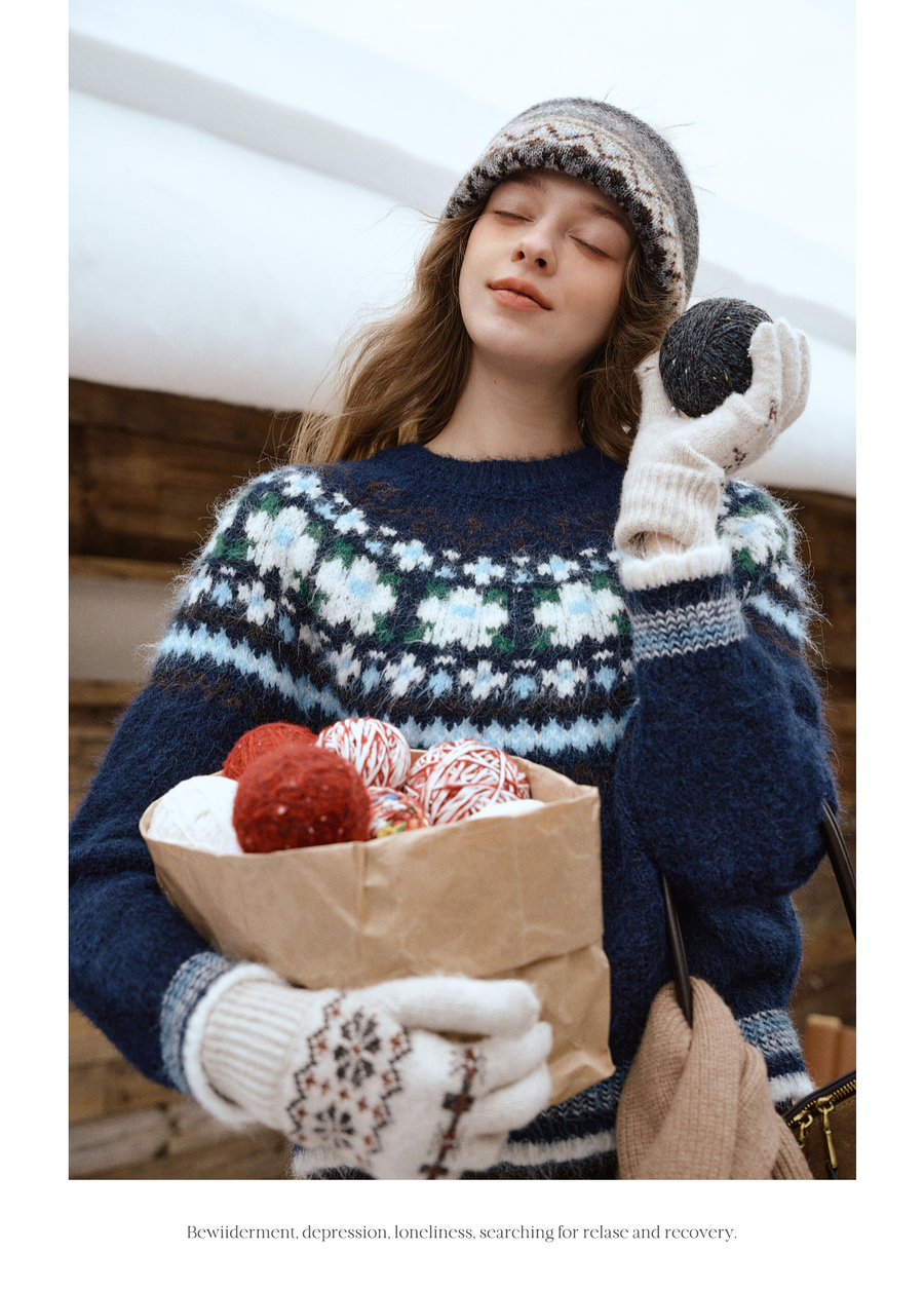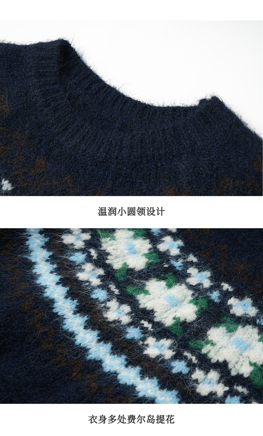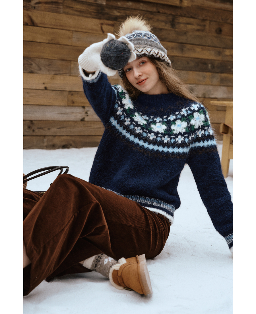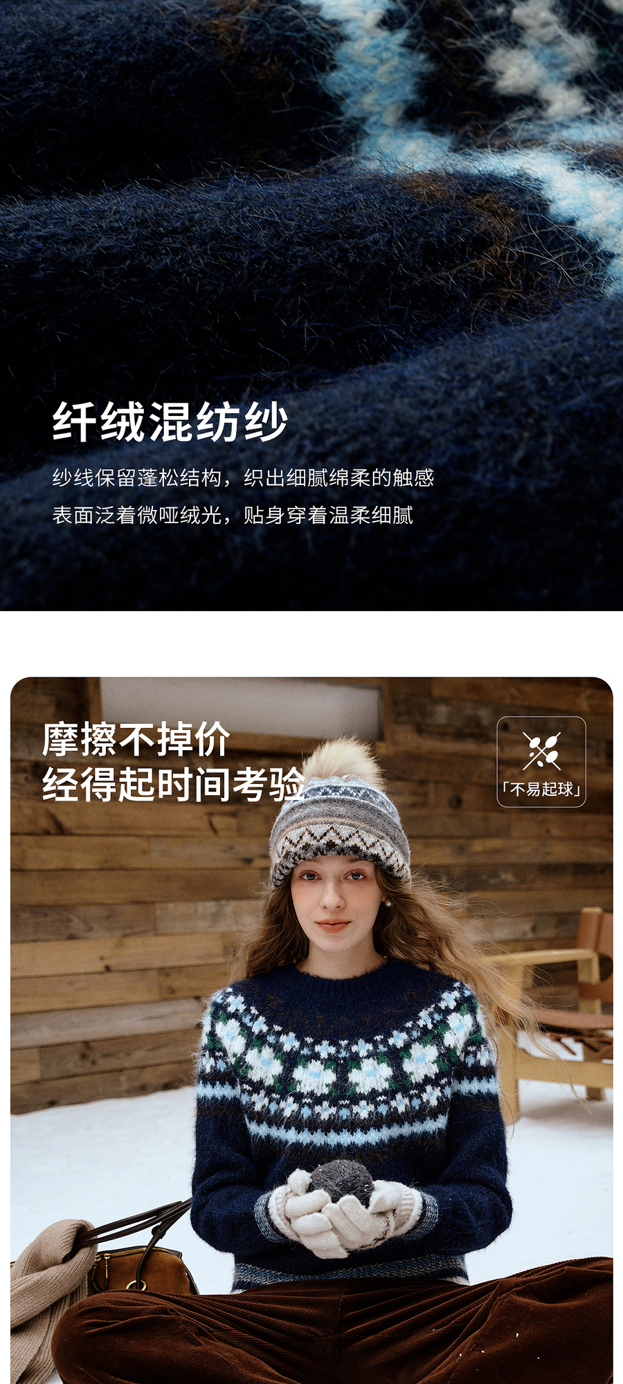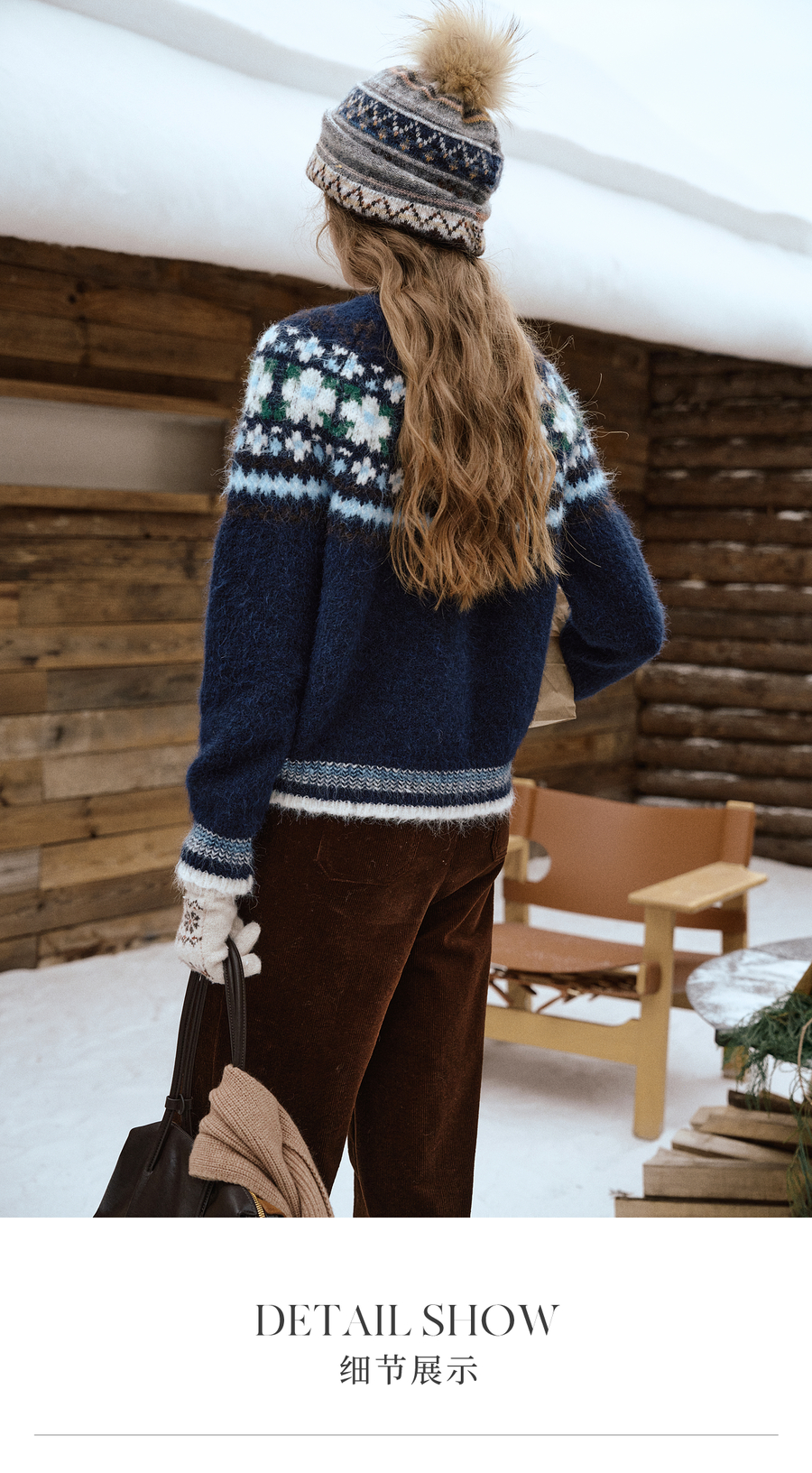 费尔岛藏青色提花圆领羊毛针织衫女2025冬季新款休闲减龄套头毛衣