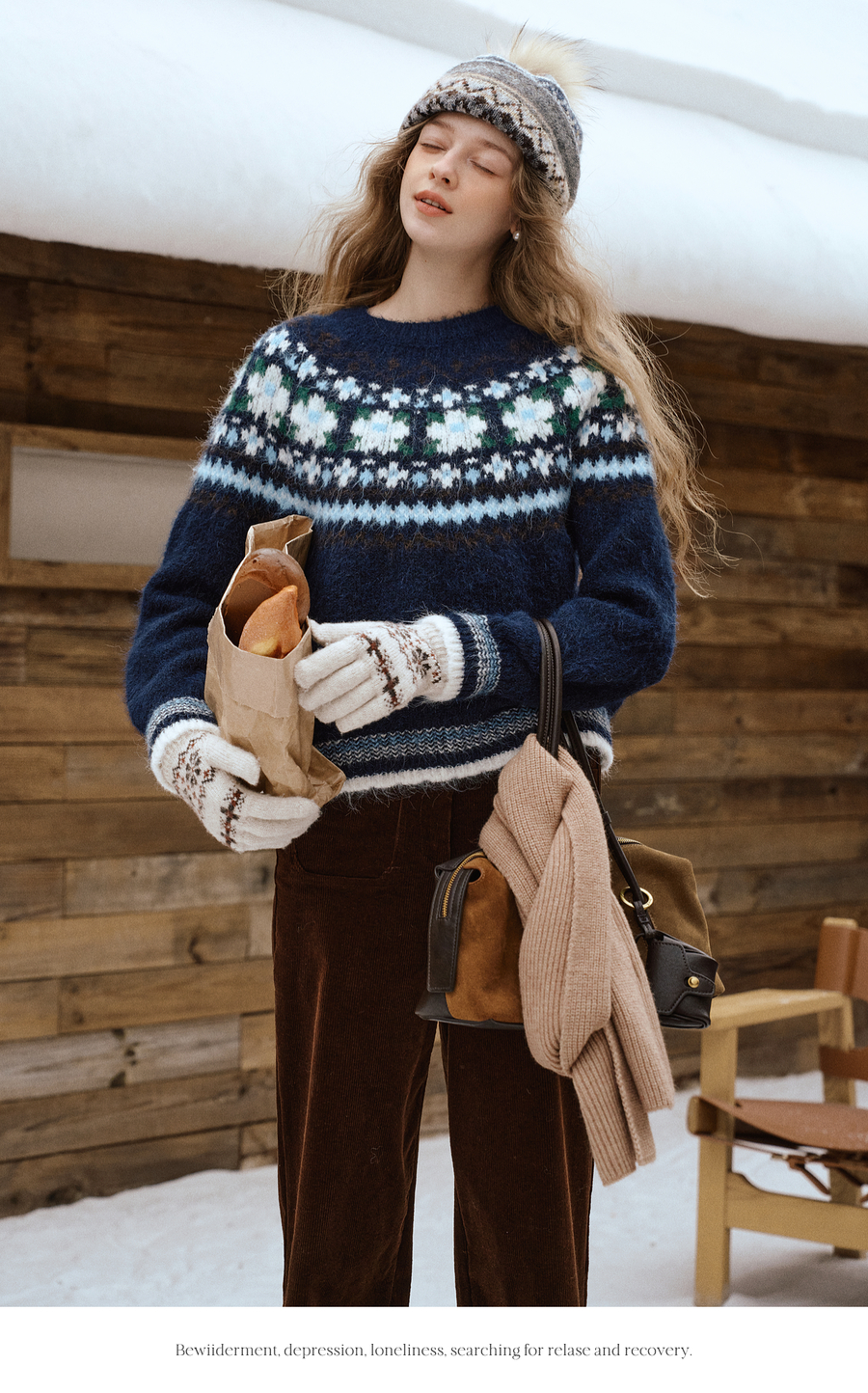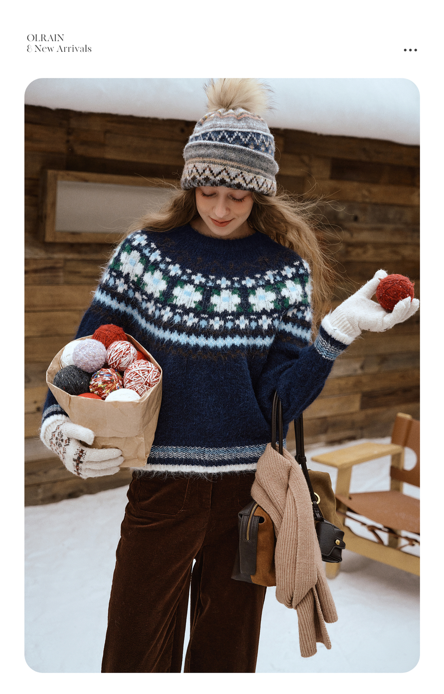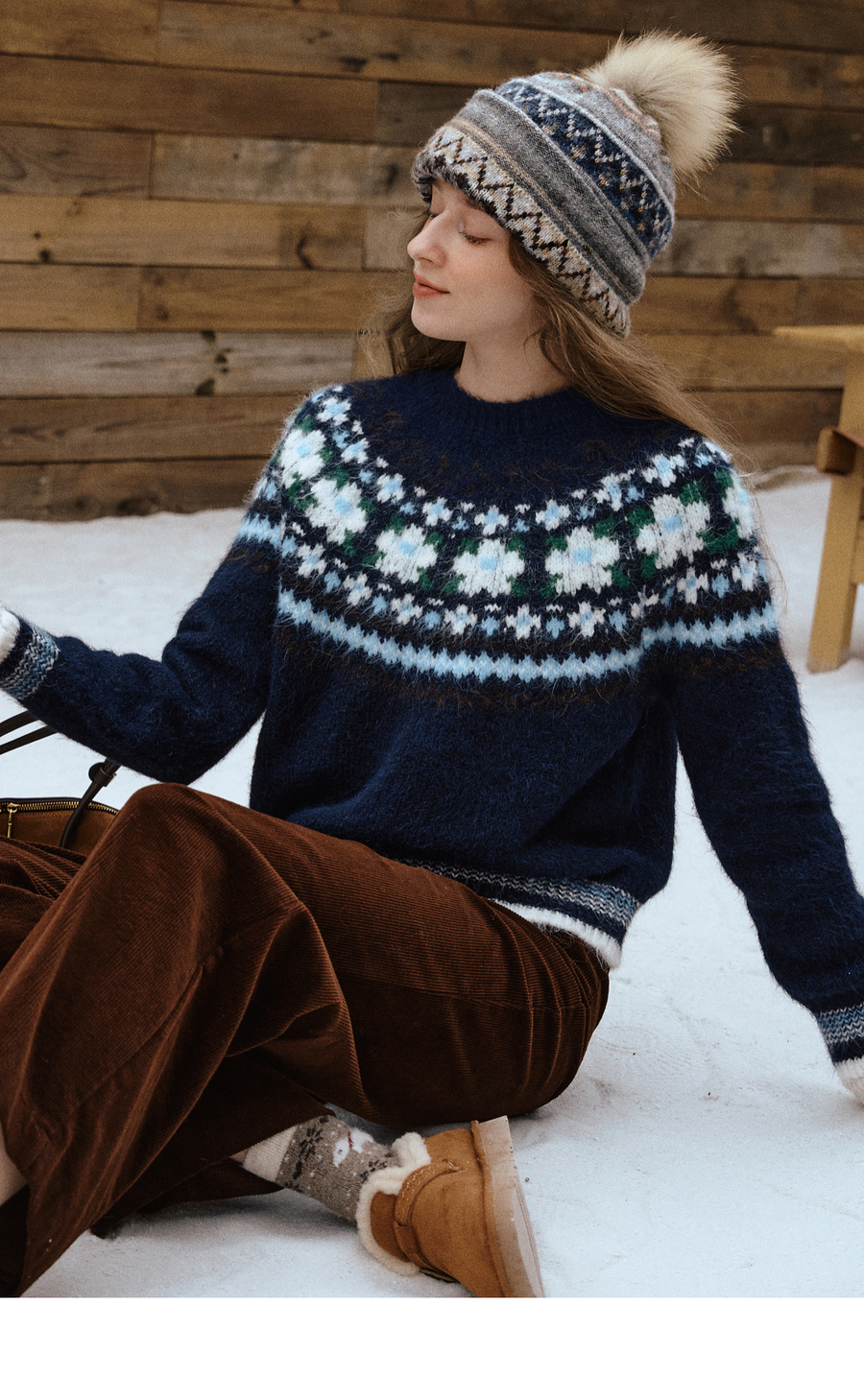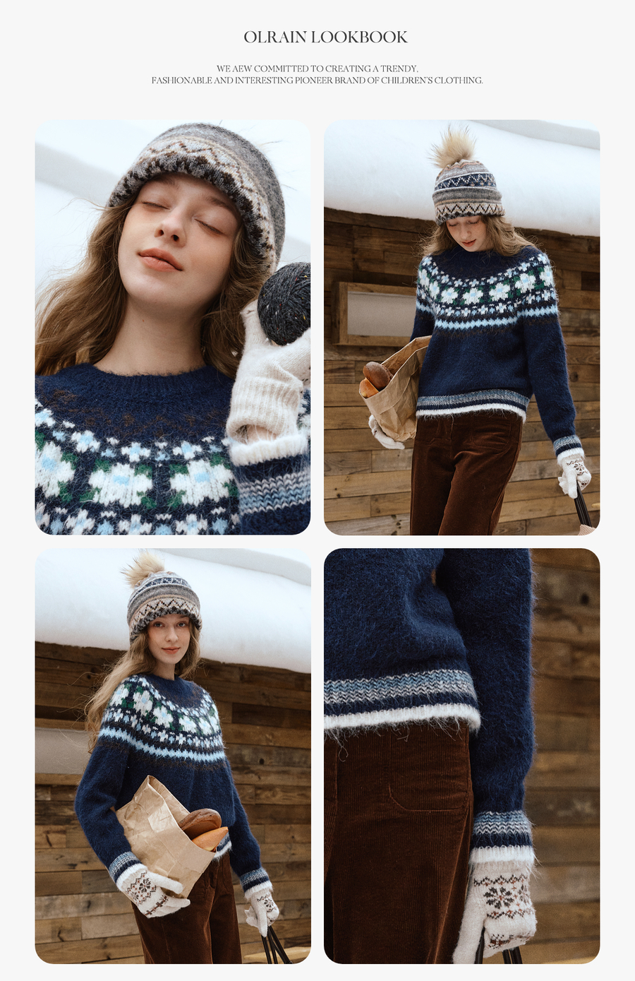 费尔岛藏青色提花圆领羊毛针织衫女2025冬季新款休闲减龄套头毛衣
