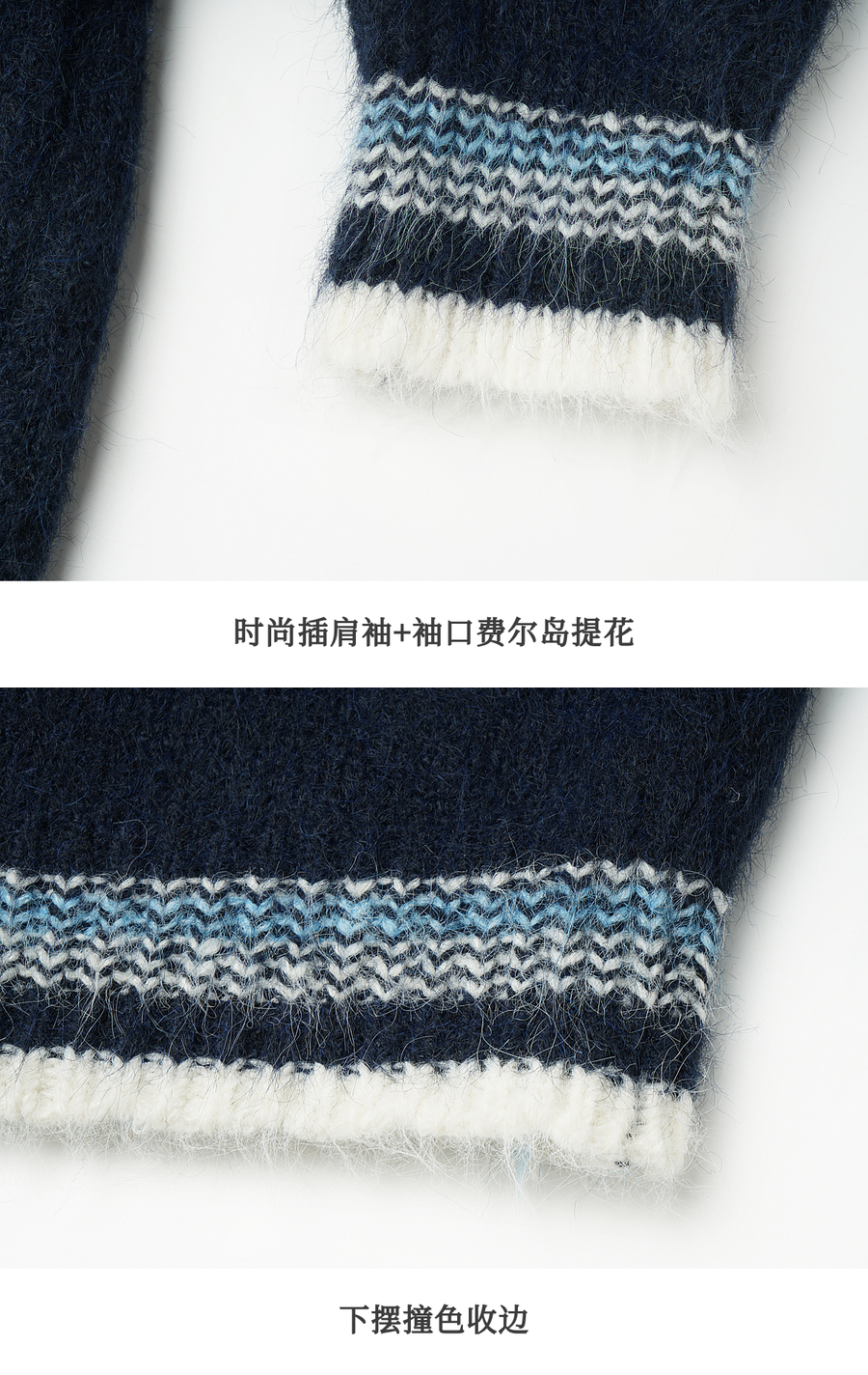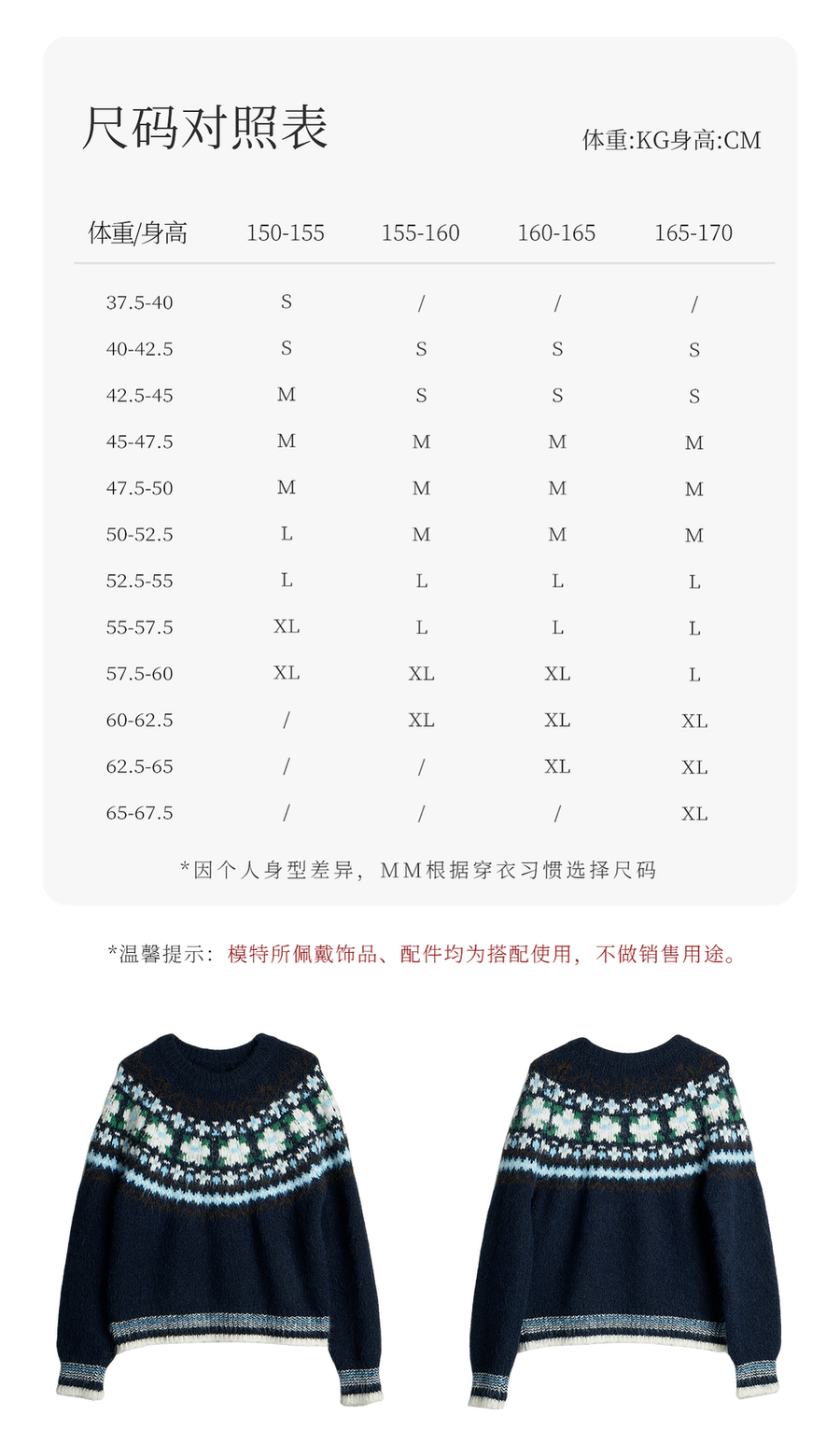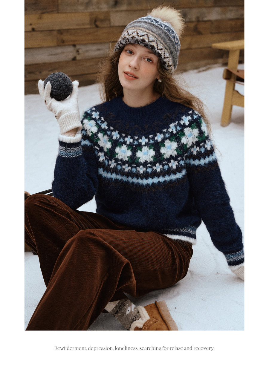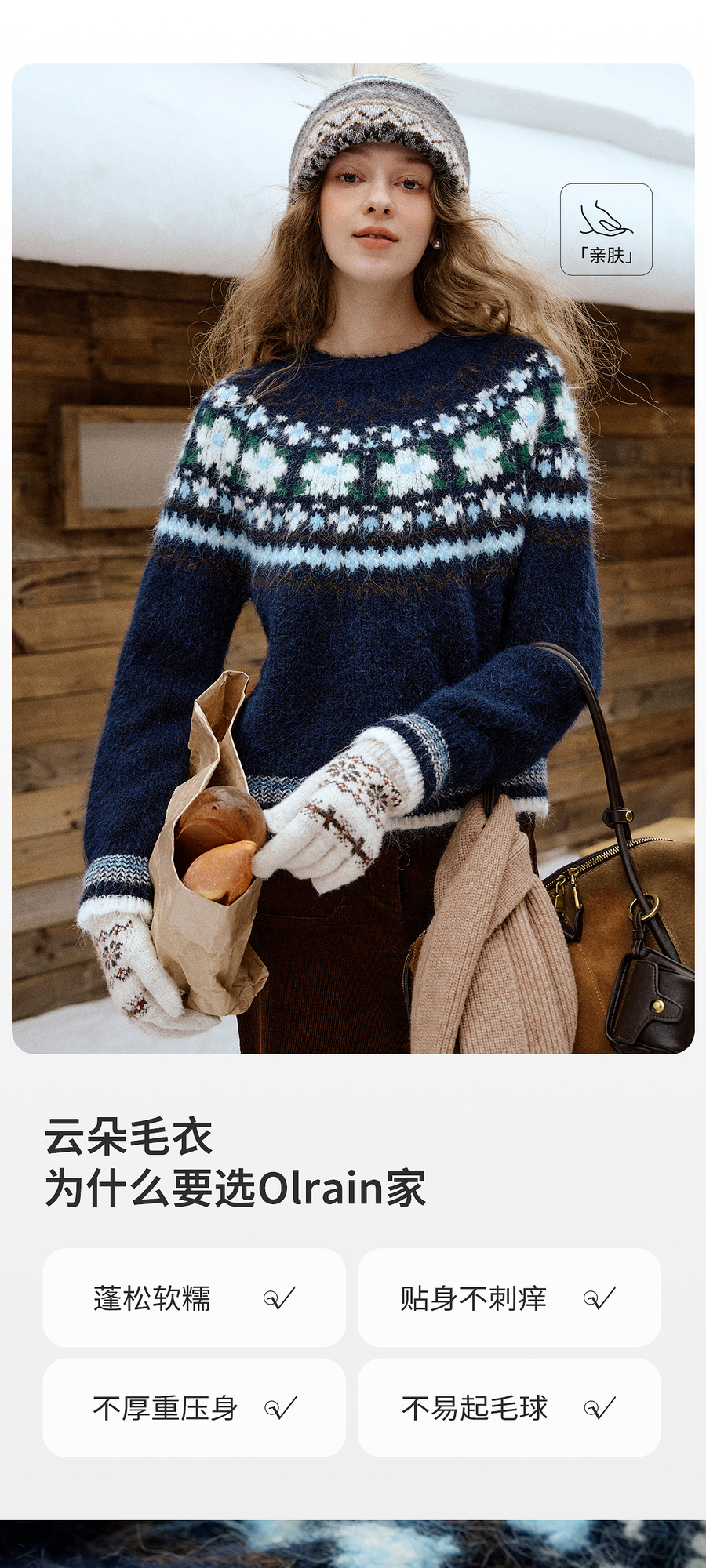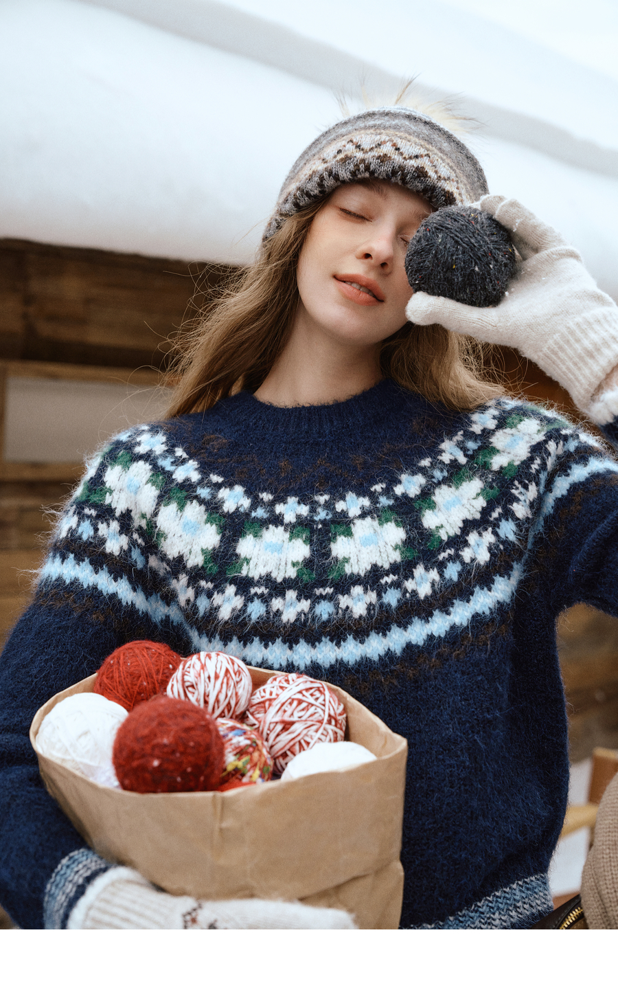 费尔岛藏青色提花圆领羊毛针织衫女2025冬季新款休闲减龄套头毛衣