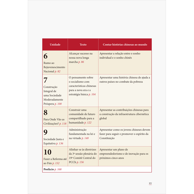 《葡萄牙语读写教程》共10个单元。各单元课文选自《习近平谈治国理政》第一卷、第二卷、第三卷和《中共中央关于党的百年奋斗重大成就和历史经验的决议》的葡文版,包括10个主题:中国青年使命;和而不同;高质量发展;美丽中国;全过程人民民主;民族复兴之路;将改革进行到底;文明走向何方;公平正义的社会;以史为鉴,开创未来。