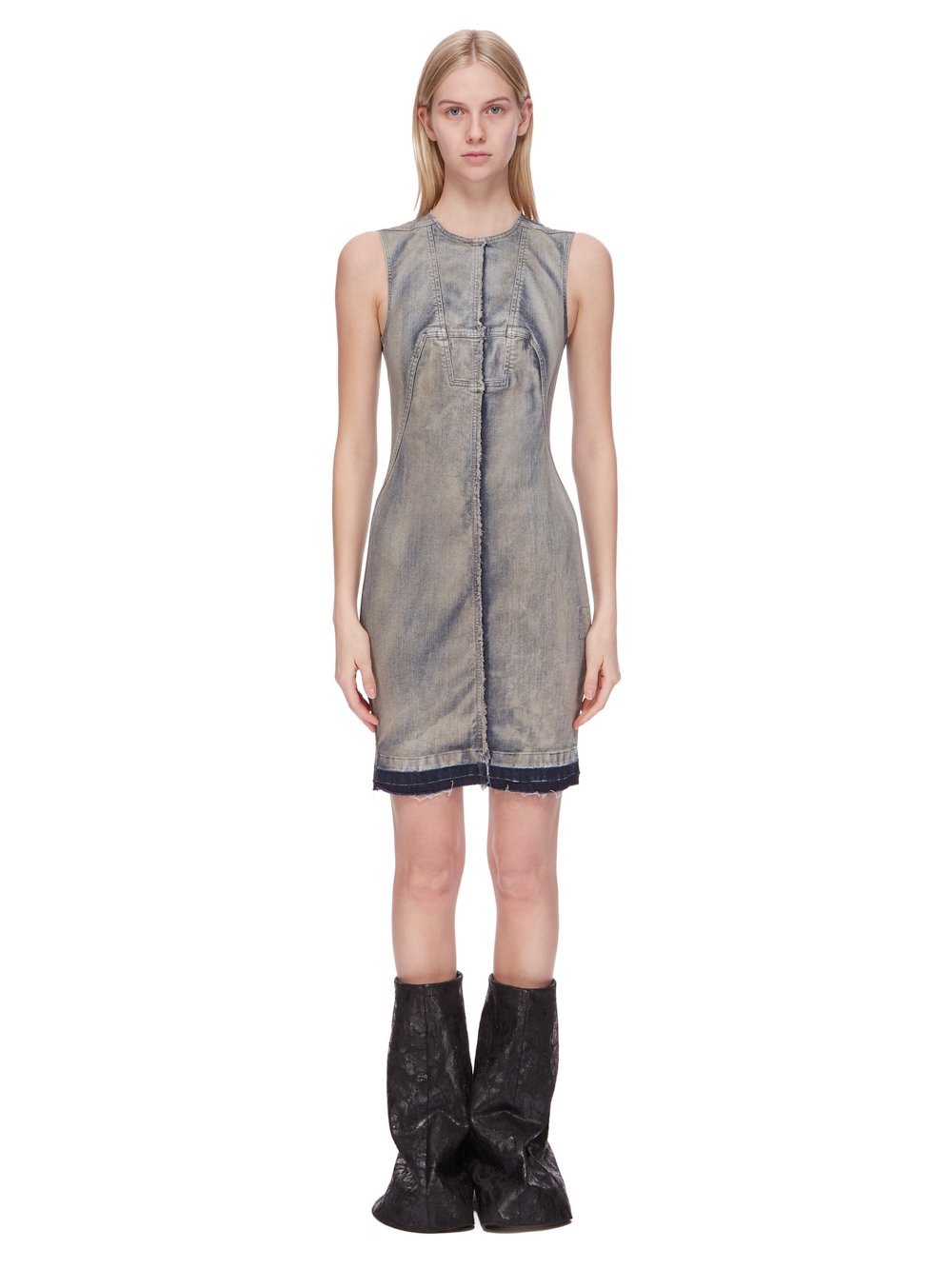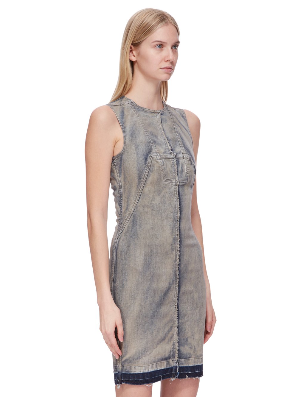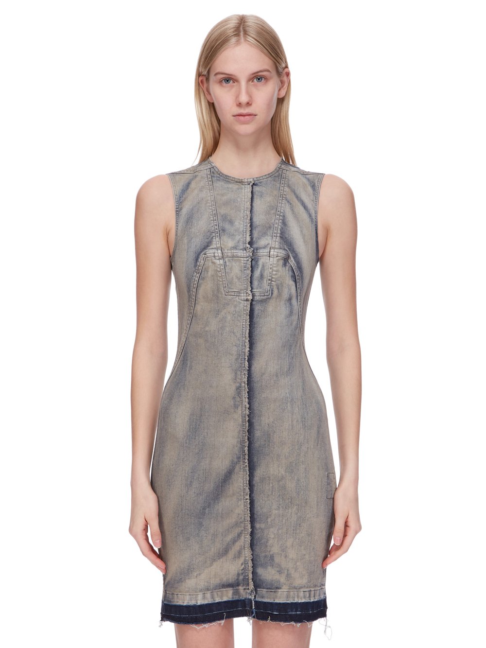 这件碎片牛仔连衣裙长到大腿中段,紧身。