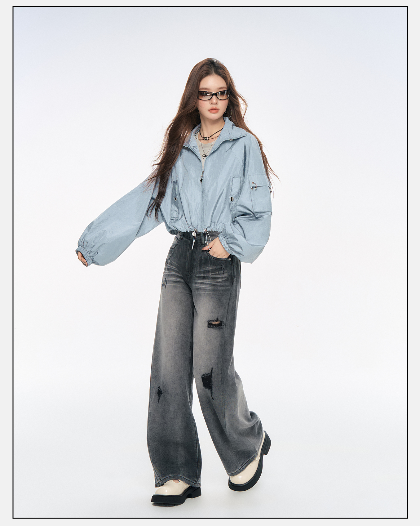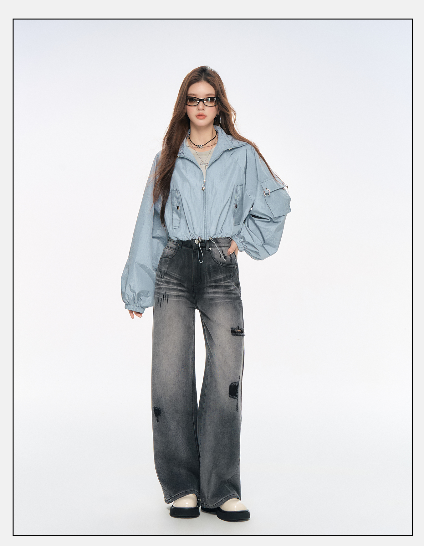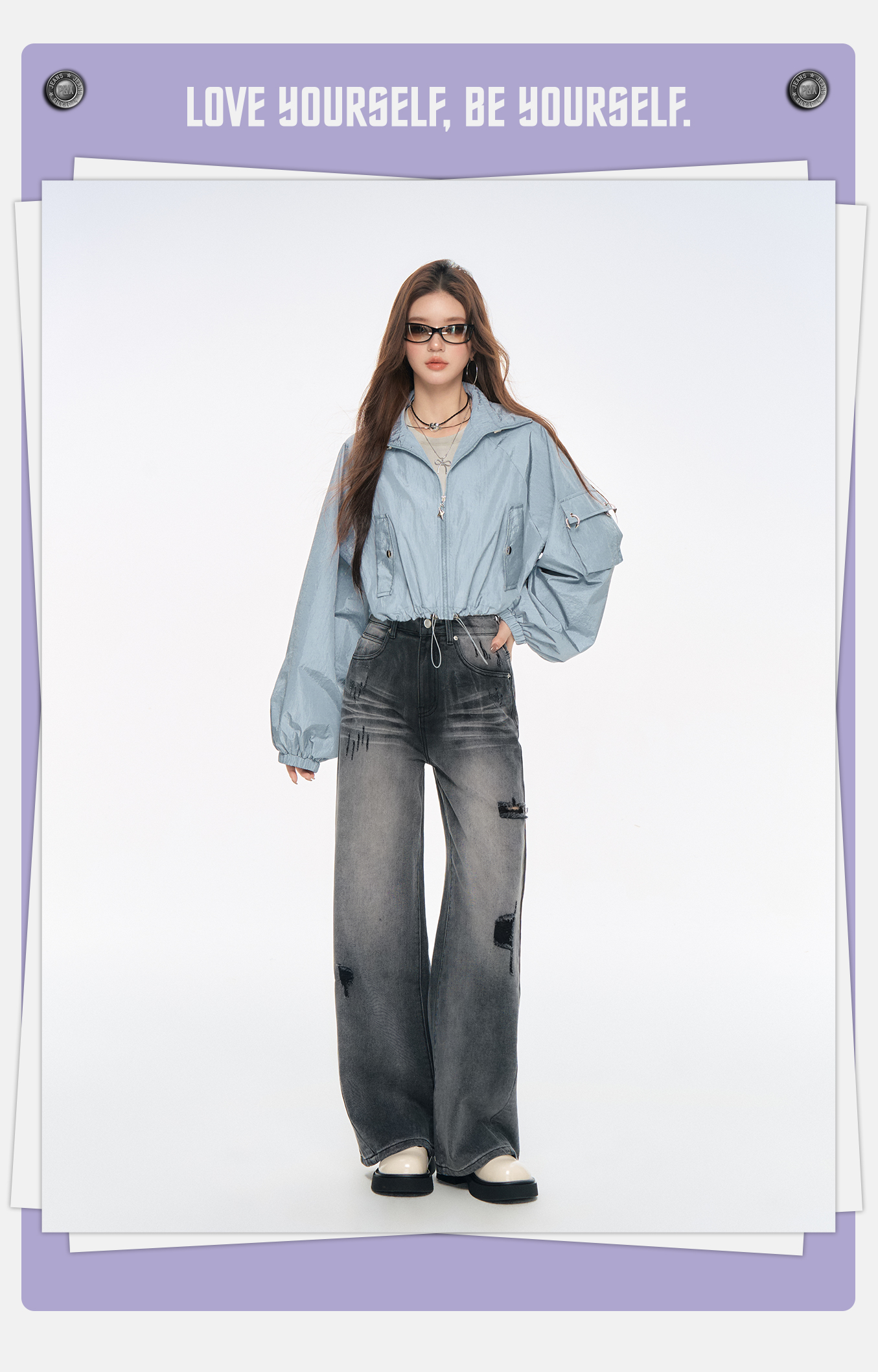 P&X设计师女装2025秋季做旧高街宽松阔腿牛仔长裤 825310254 黑色
