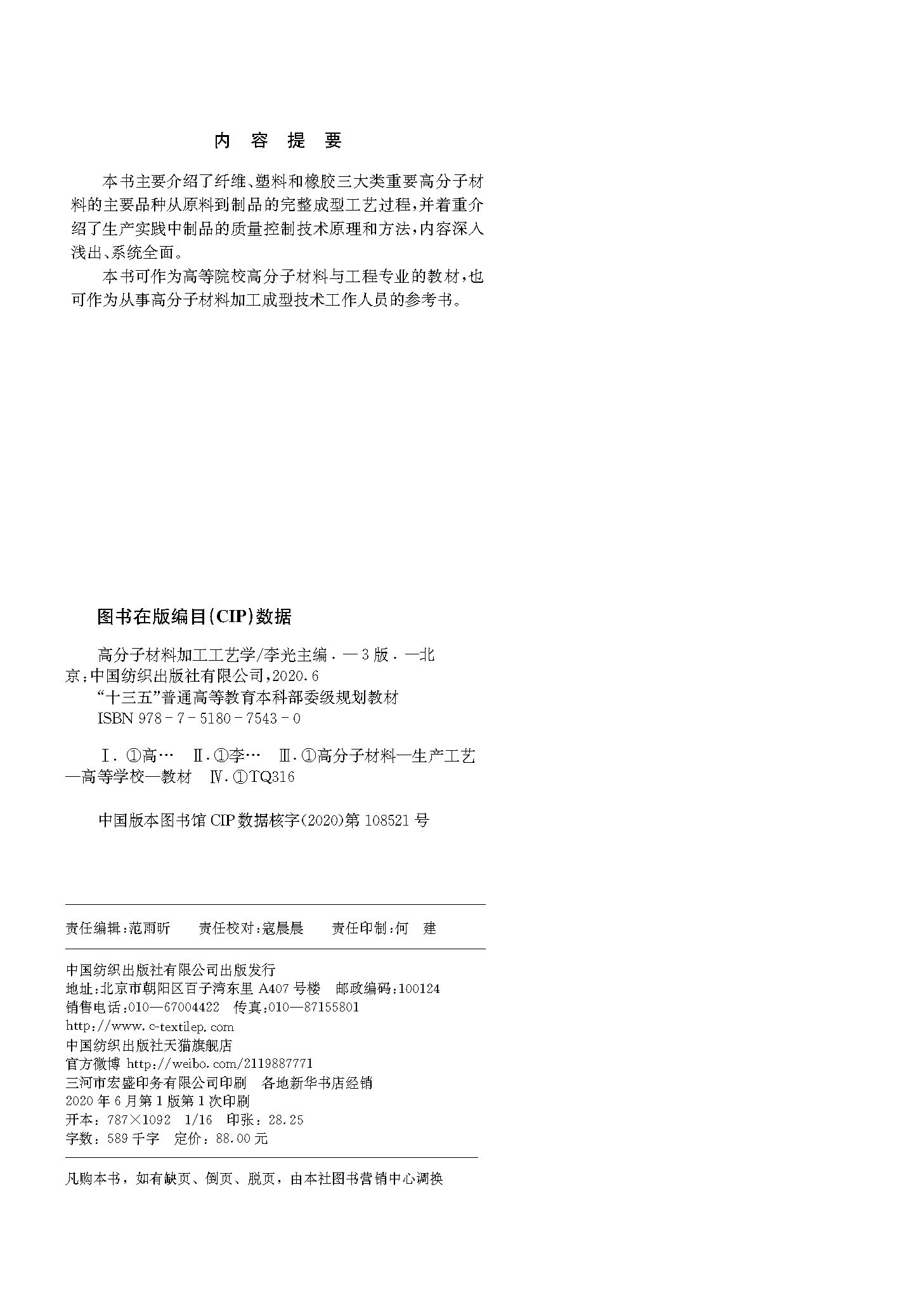 2020新书 高分子材料加工工艺学 第3版三版 李光 生产实践质量控制技术原理方法 高分子辞了技术 材料加工过成型技术工作人员参考