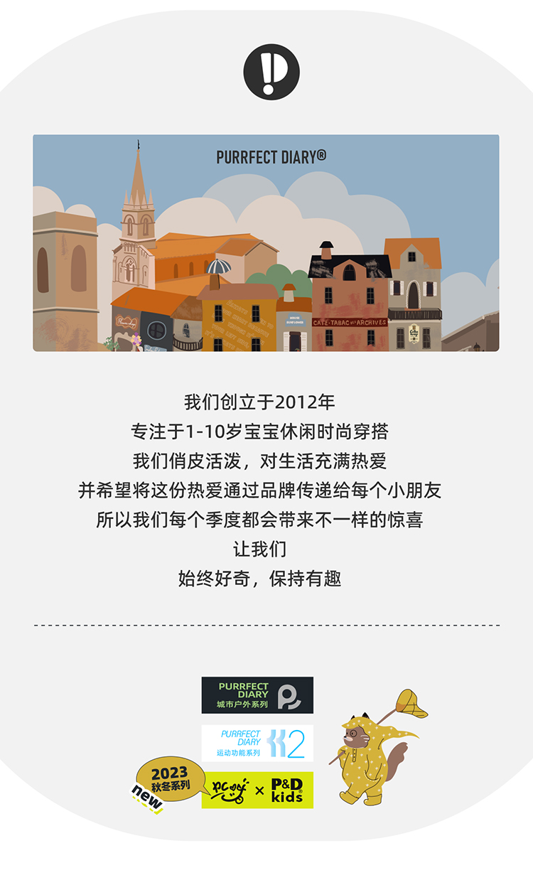 - Purrfect-Diary专注于贴近自然随性的穿着概念,轻奢平价的童装文化传播,在产品设计上更加注重婴童穿着的舒适性、安全性、更出众的国际化品牌,将欧美的育婴文化在中国进行深入的传播与推广。