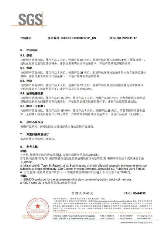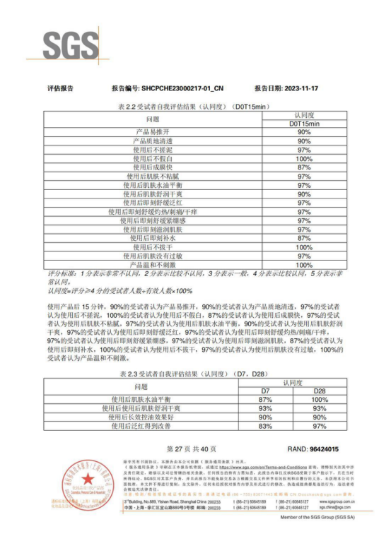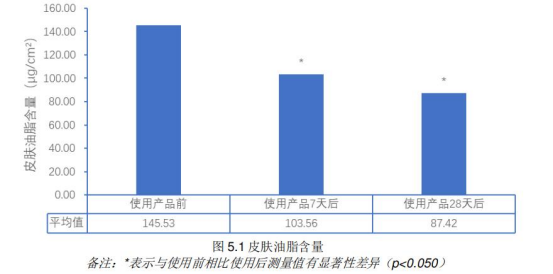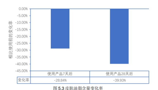 SGS人体功效测试 四周力证: 舒缓!控油!保湿! 人体测试--控油功效SGS功效实测使用防晒霜7天、28天后皮肤油脂含量变化与使用产品前相比 使用产品7天后前额评估区域的皮肤油脂含量显著性减少28.84% 使用产品28天后 前额评估区域的皮肤油脂含量显著性减少39.93%