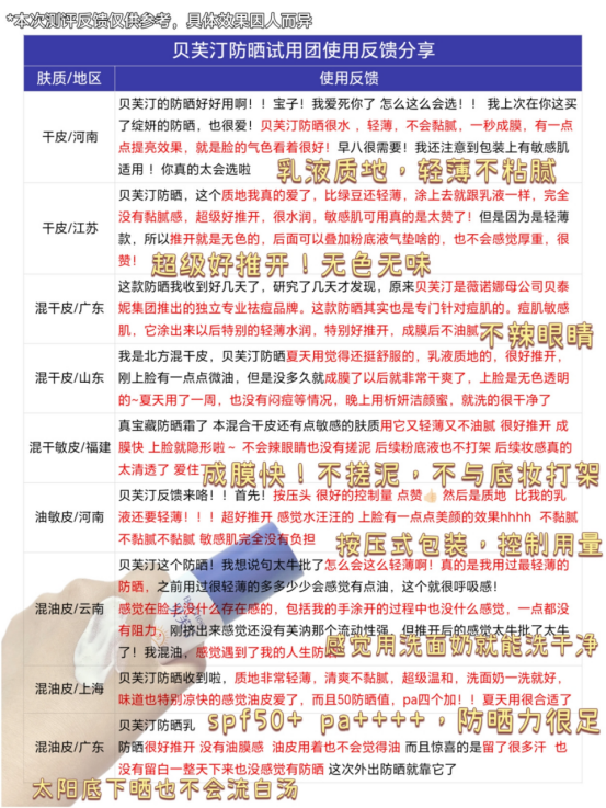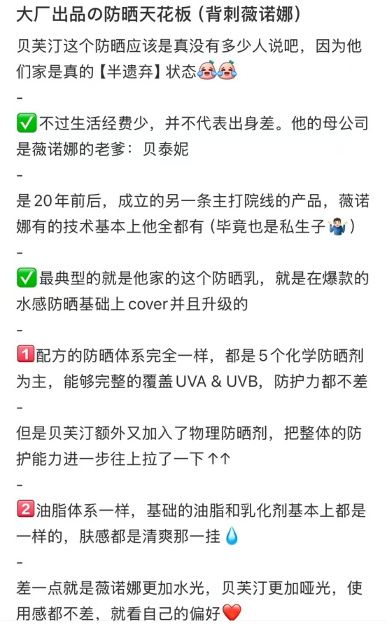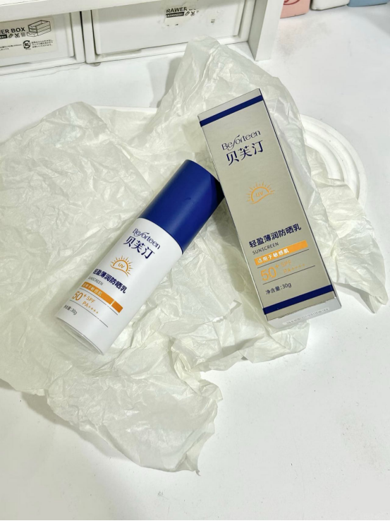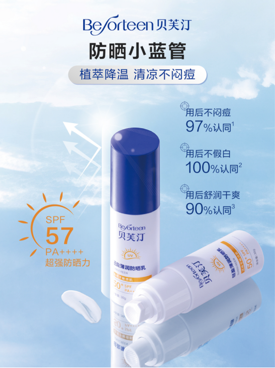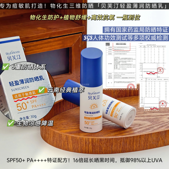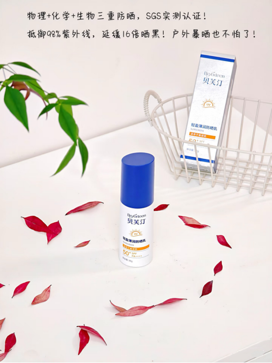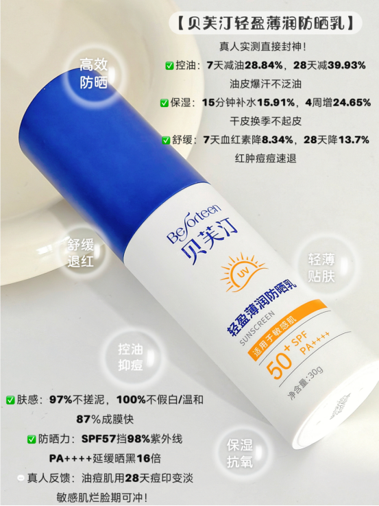 🔵贝芙汀采用物化生三维结合防晒物理+化学+生物的三合一 物化防晒剂协同作用,反射和吸收紫外线 温和透气、轻薄不假白、延展性好 生物余甘子进阶抗光损, 实现全波段防护 其他植萃进一步控油保湿舒缓