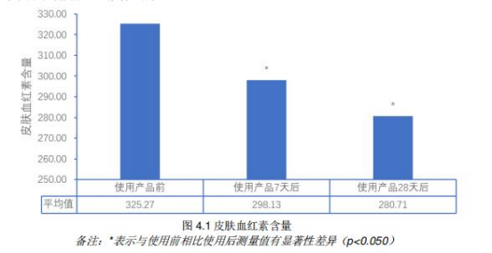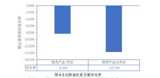 人体测试--舒缓功效 SGS功效实测 使用防晒霜7天、28天后皮肤血红素含量变化与使用产品前相比 使用产品7天后脸颊评估区域的皮肤血红素含量显著性减少8.34% 使用产品28天后脸颊评估区域的皮肤血红素含量显著性减少13.70% 数据源于SGS贝芙汀轻盈薄润防晒乳 SPF50+,PA++++30人28天的人体测试报告
