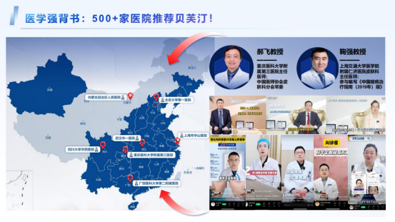 再来好好介绍一下贝关汀 上市大厂贝泰妮集团旗下 历经4年打磨、专为痘肌研发 贝泰妮集团 薇诺娜同厂同源 一线化妆品大厂背后基本都是医疗/药行业贝关汀的母公司贝泰妮,前身就是滇红药业药企下场做美妆,那不妥妥的降维打击吗! 权威专家团深度参与贝芙汀产品方案研发,比如,皮肤科专家一郝飞教授(重庆三院)又比如,皮肤科专家一鞠强教授(上海仁济医院) 医学强背书! •500+家医院推荐贝芙汀! •药店广覆盖!贝关汀入驻国内Top连锁,专研祛痘,店员首推品牌!