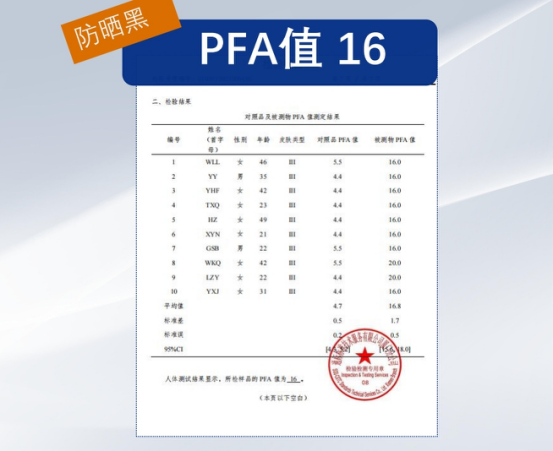 16倍 PFA评价防晒化妆品防止皮肤晒黑能力 在实际产品标注中 •PFA 值通常会转换为PA +等级 贝关汀这款防晒对应的防晒系数为PA++++