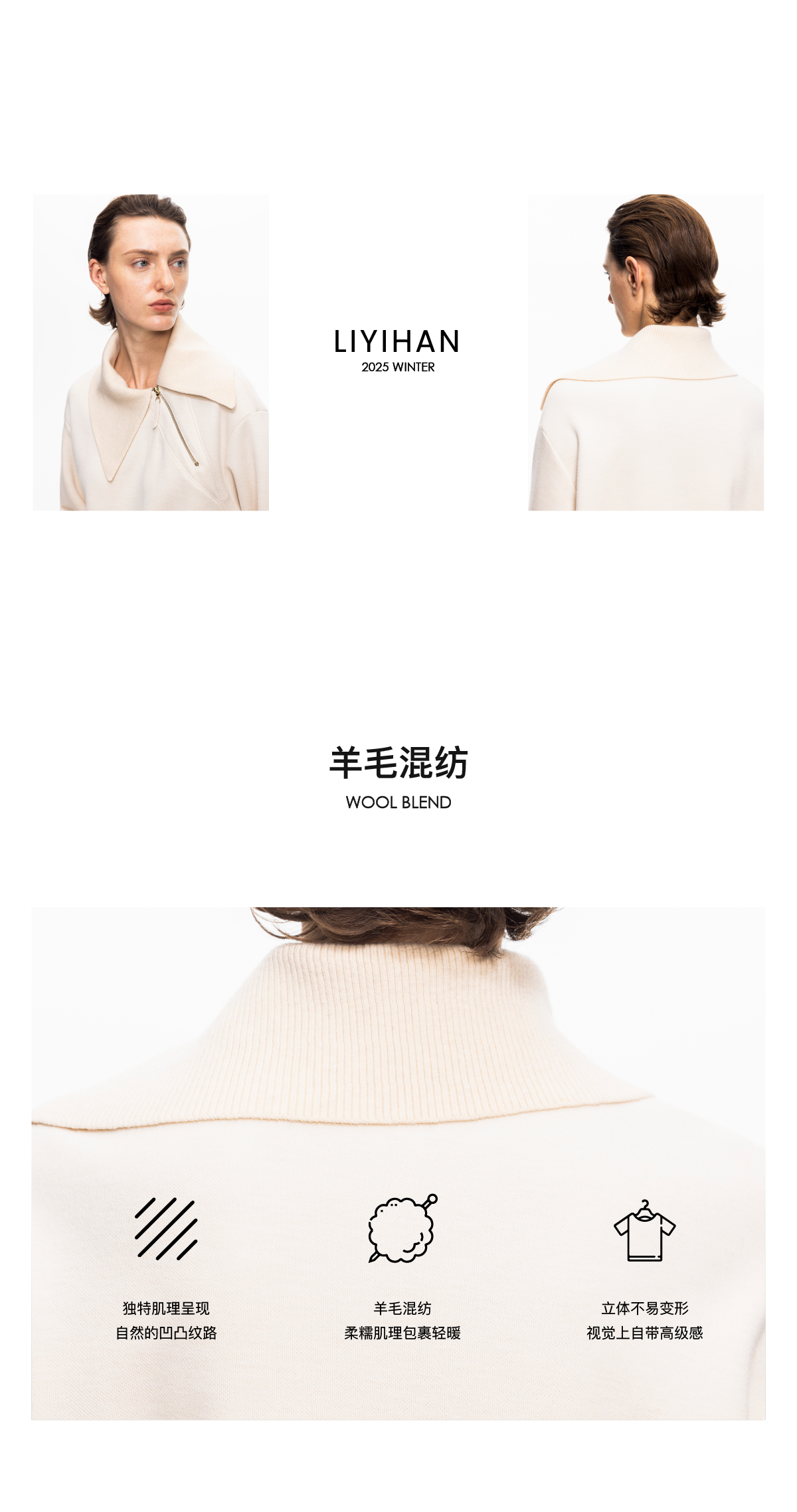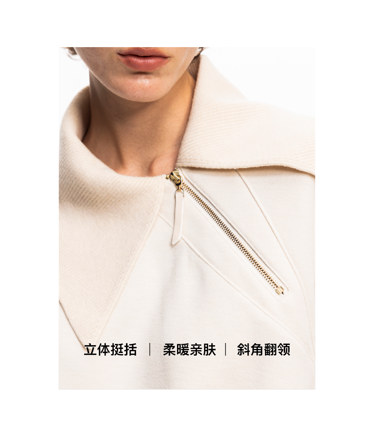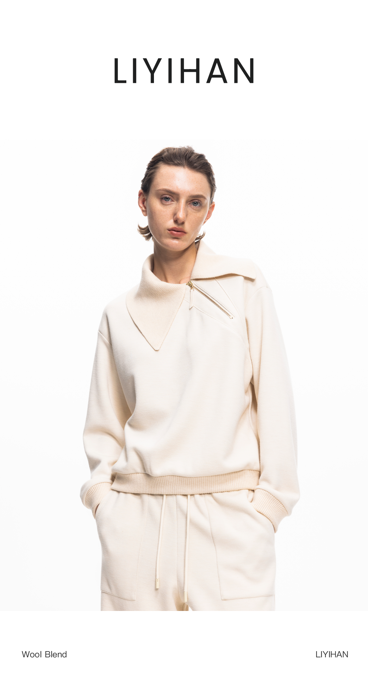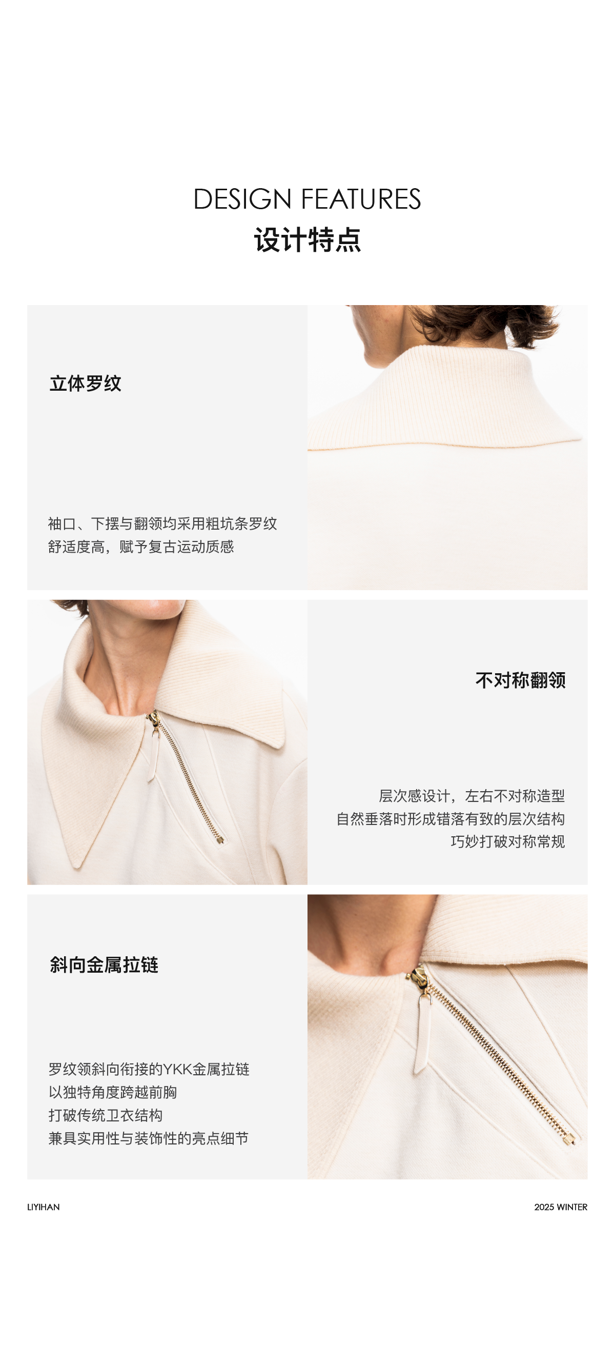 LIYIHAN 2025秋冬新款通勤简约斜翻领卫衣米白色女上衣小众设计感
