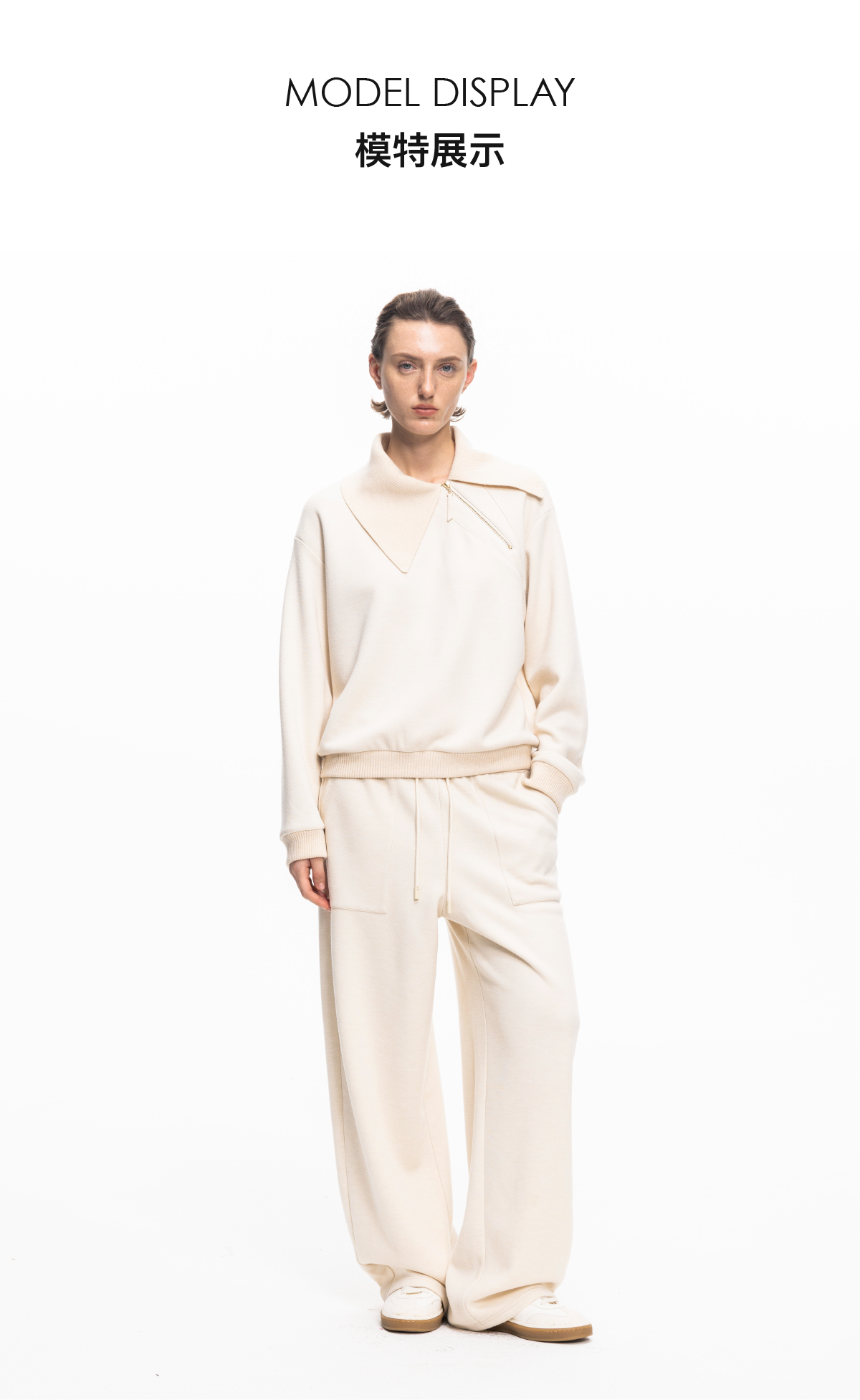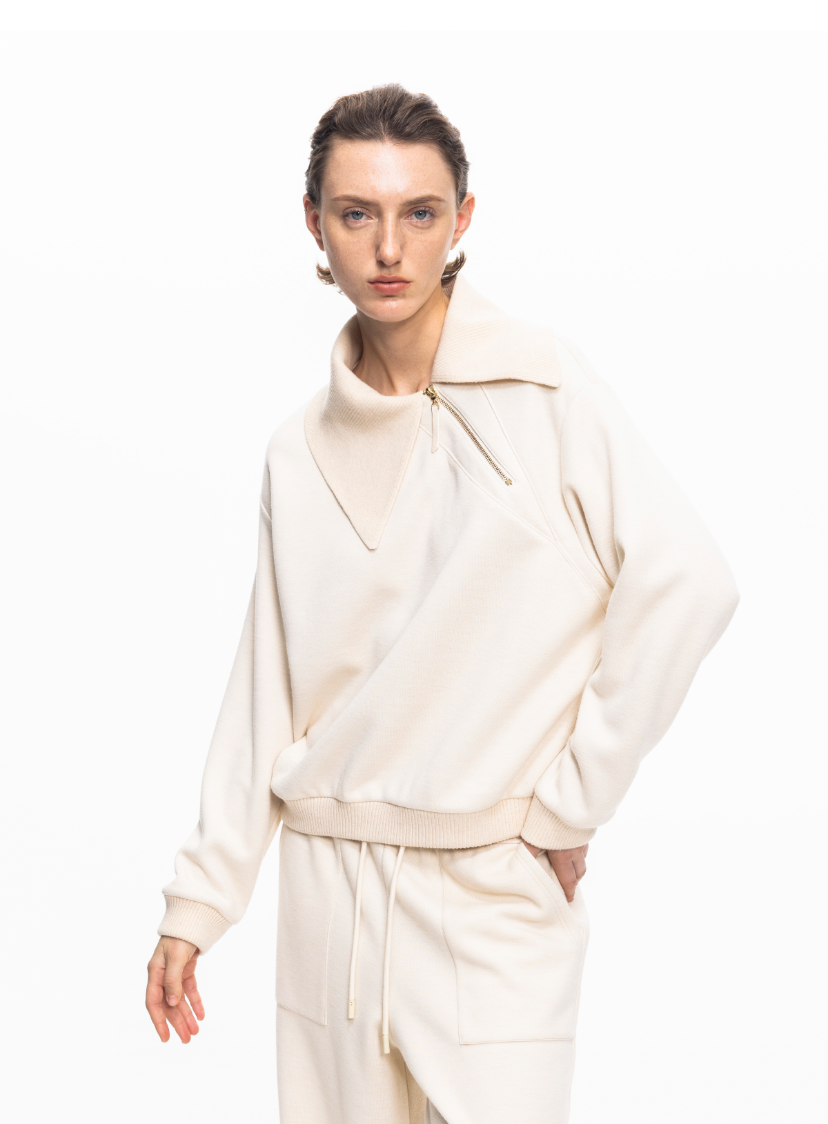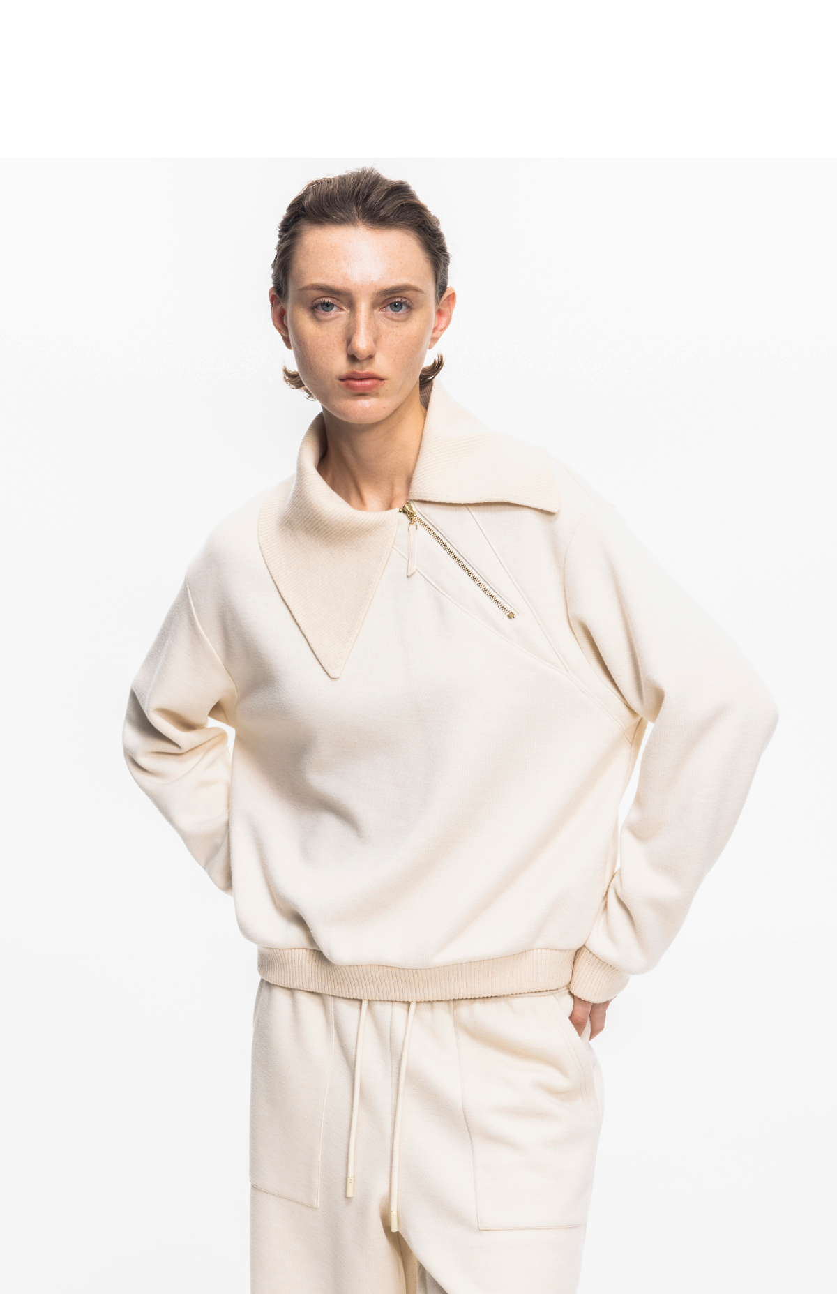 LIYIHAN 2025秋冬新款通勤简约斜翻领卫衣米白色女上衣小众设计感