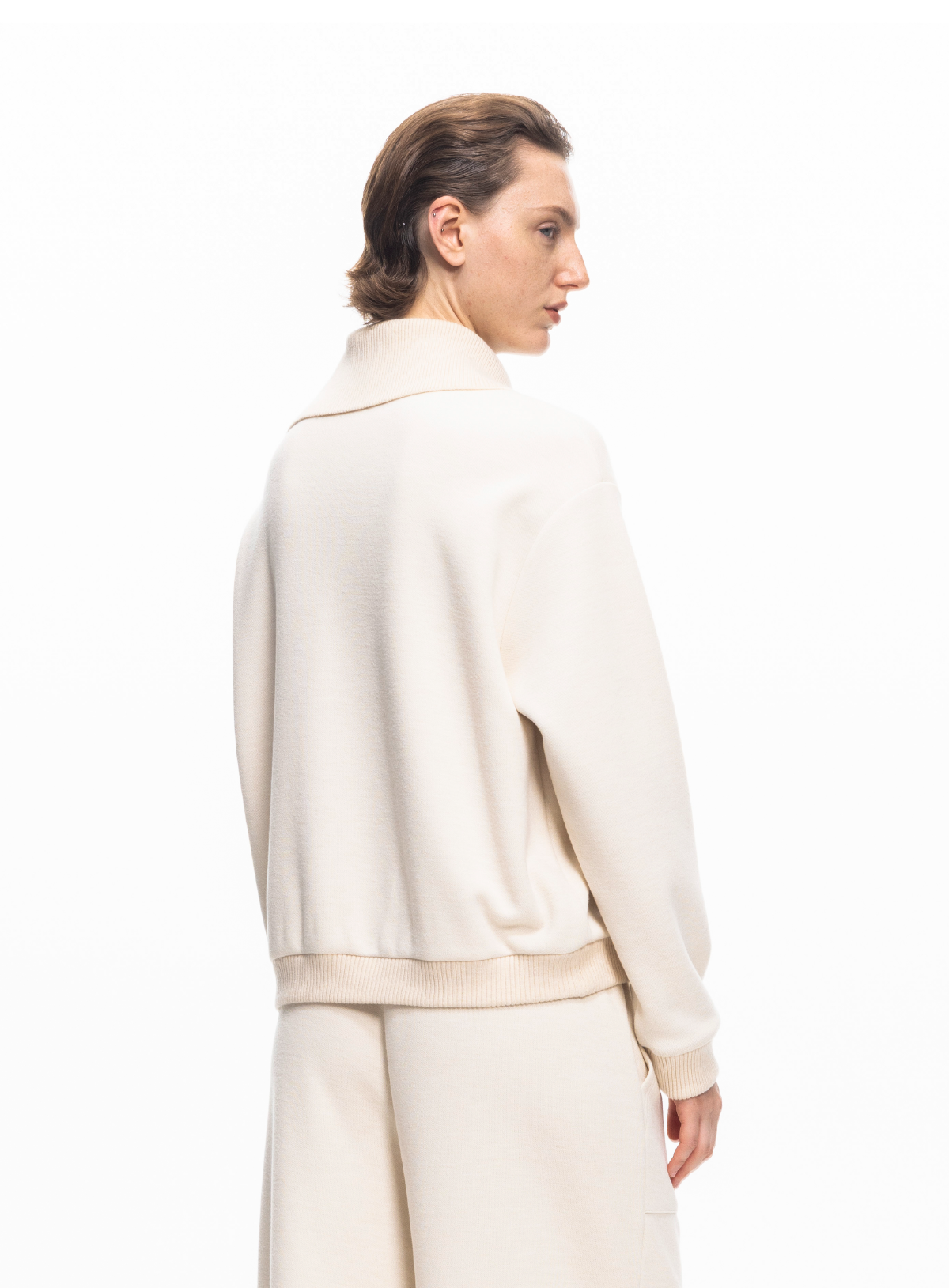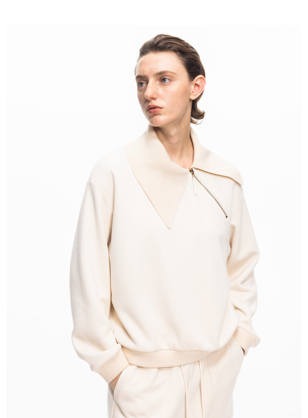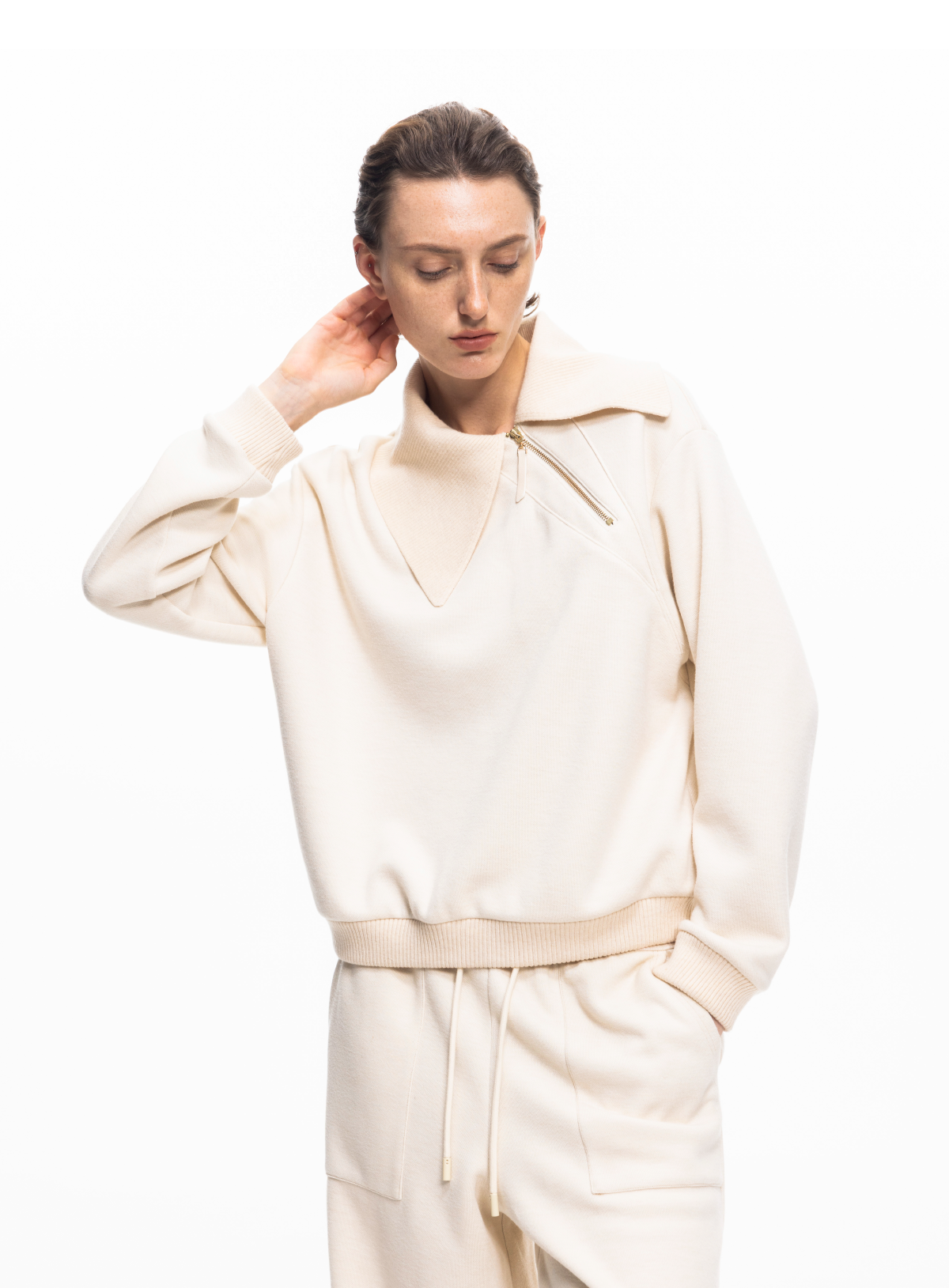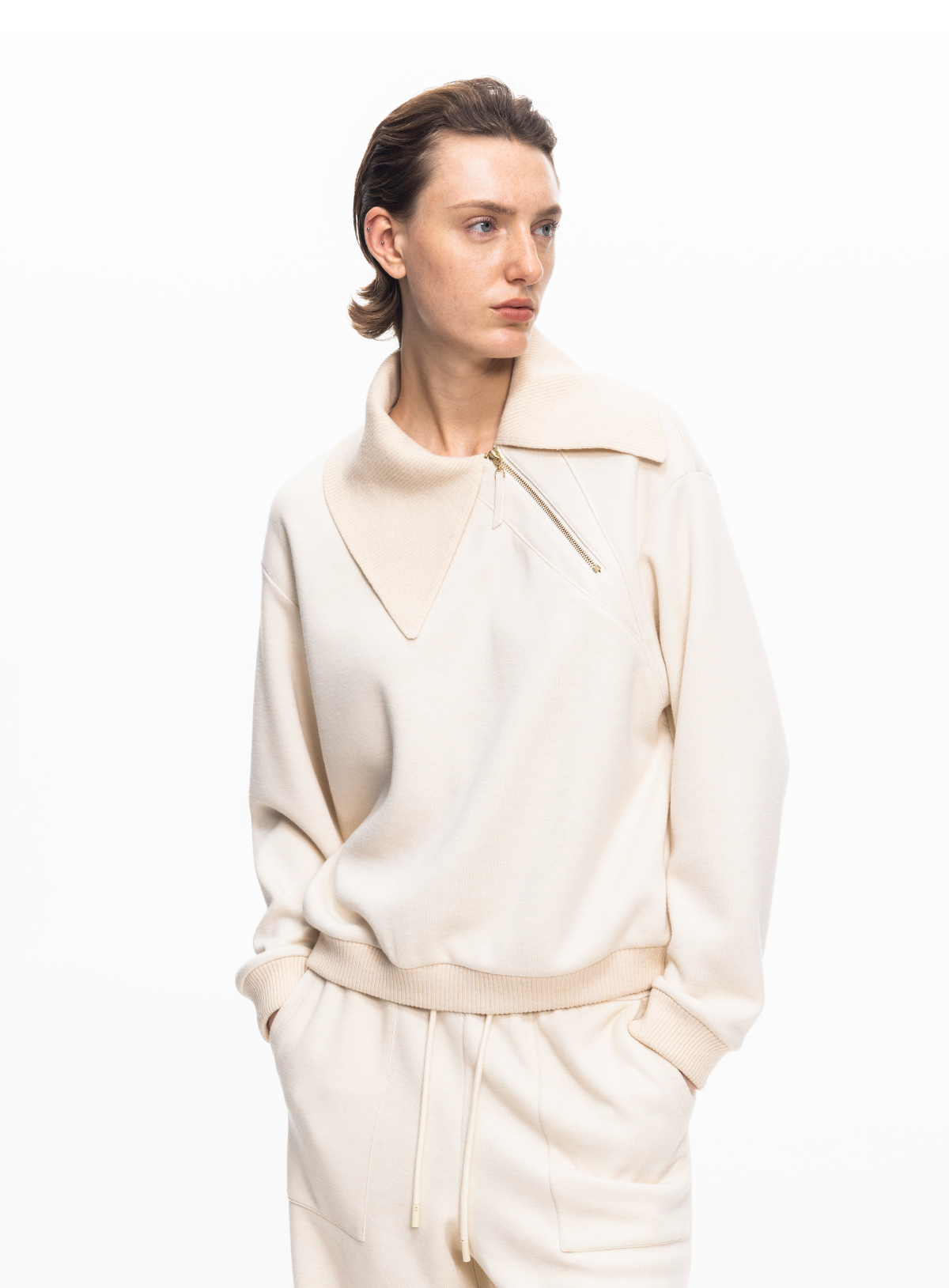 LIYIHAN 2025秋冬新款通勤简约斜翻领卫衣米白色女上衣小众设计感
