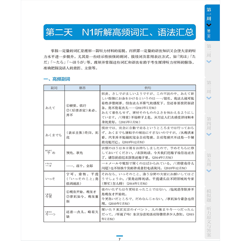 《5周突破新日语能力考试听解N1(第二版)》以周为单位,第一周重点讲解了"日语语音的特点""N1听解高频语法点汇总""五大题型的解题技巧"。第二周主要针对"课题理解题"和"重点理解题",第三周主要针对"概要理解题",第四周主要针对"即时应答题",第五周主要针对"综合理解题"。每周第一天至第六天每天的练习又具体分为基础训练和模拟练习,基础训练题为听力片段,主要训练考生记关键词、辨析语义等基础能力,模拟练习则与能考真题题型完全一致,进一步提高考生的听解综合能力。本书还随书附赠精美小册子,其中汇总了历年真题中听解的高频词汇,作者将这些词汇按照不同的场景进行分类,帮助考生扩充听解的词汇量。