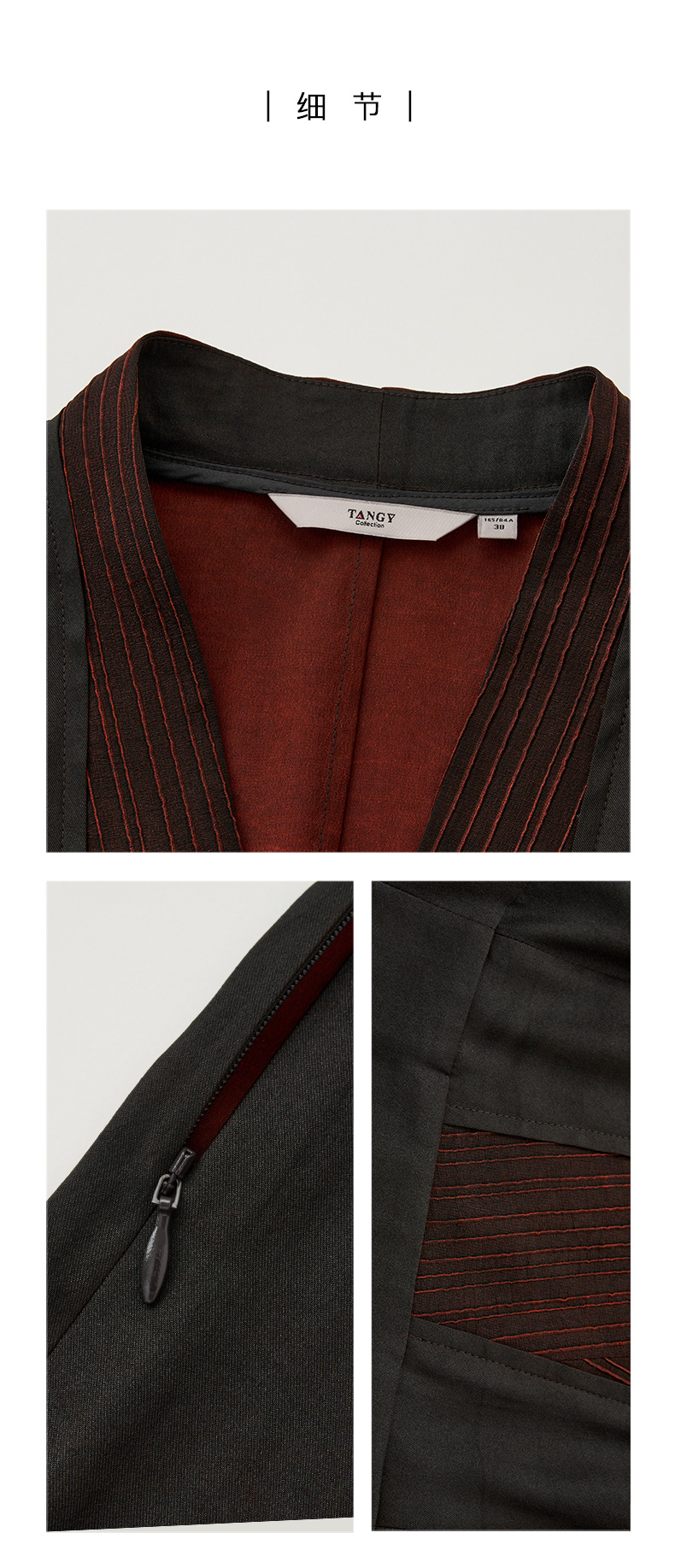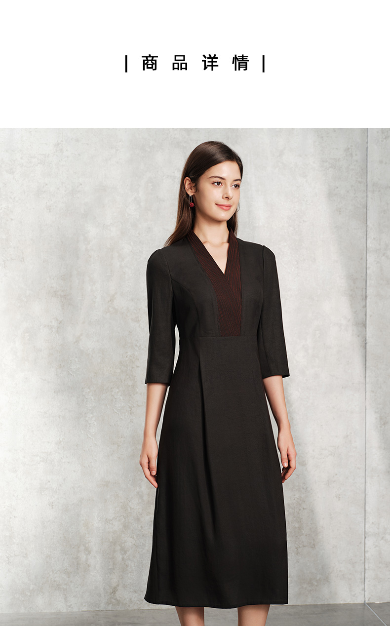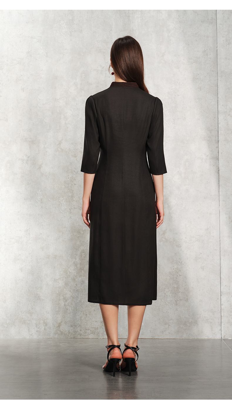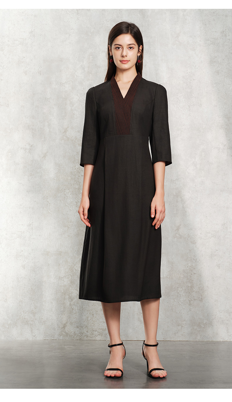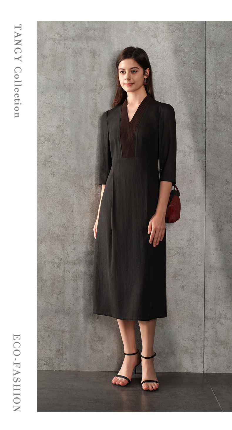 TANGY Collection天意精品2024春季新品V领七分袖莨绸香云纱中长连衣裙 L241803