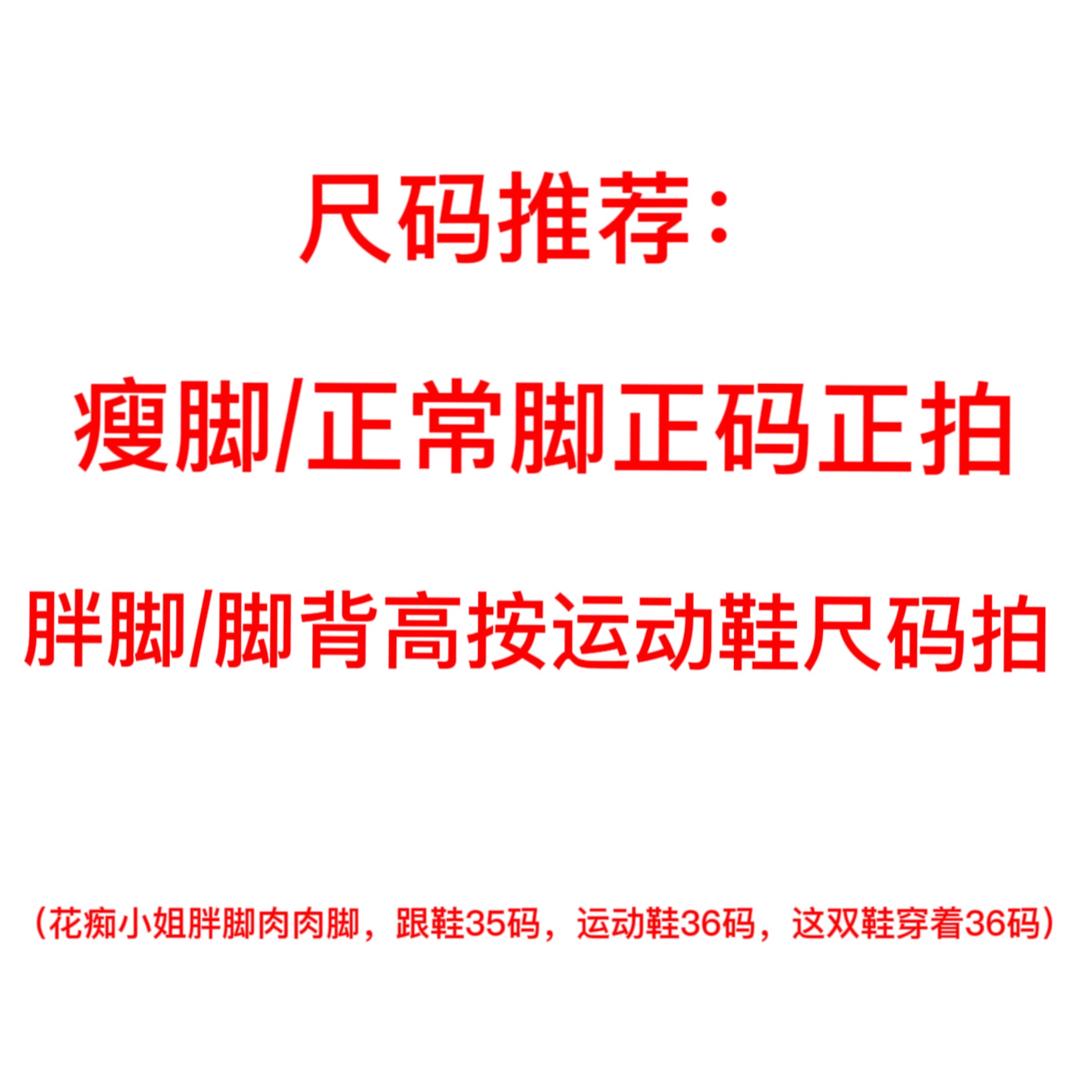 单鞋花痴小姐穿着35码,这双鞋穿着36码,因为花痴小姐是胖胖脚,所以是按运动鞋的尺码来选择的,建议脚宽、脚背高、肉肉脚的姐姐按运动鞋尺码来拍哦~