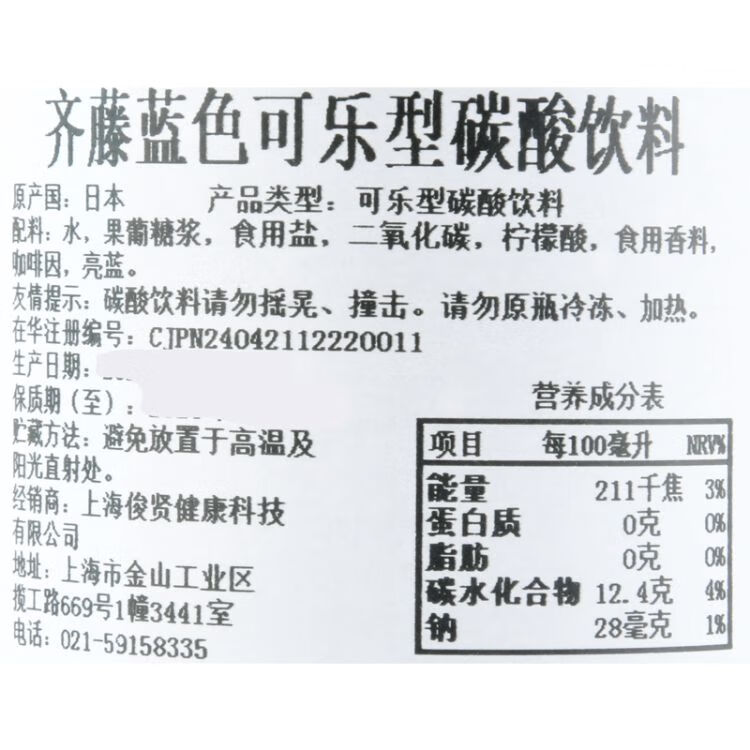 齐藤蓝色可乐碳酸饮料330ml