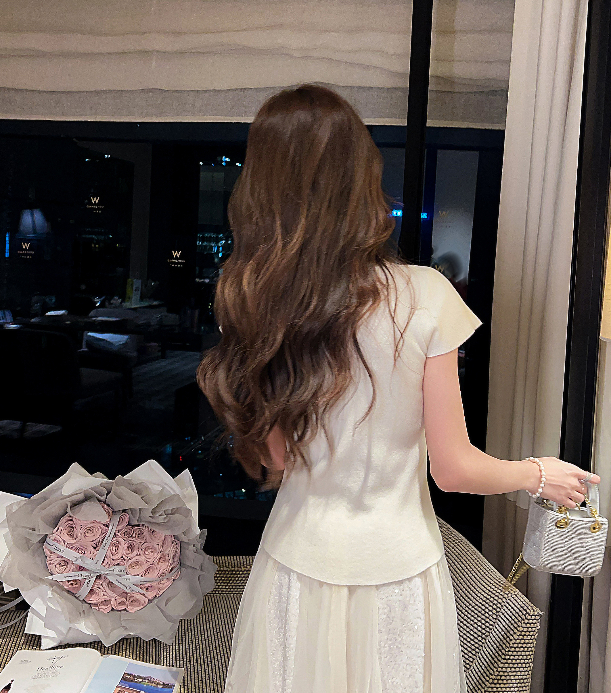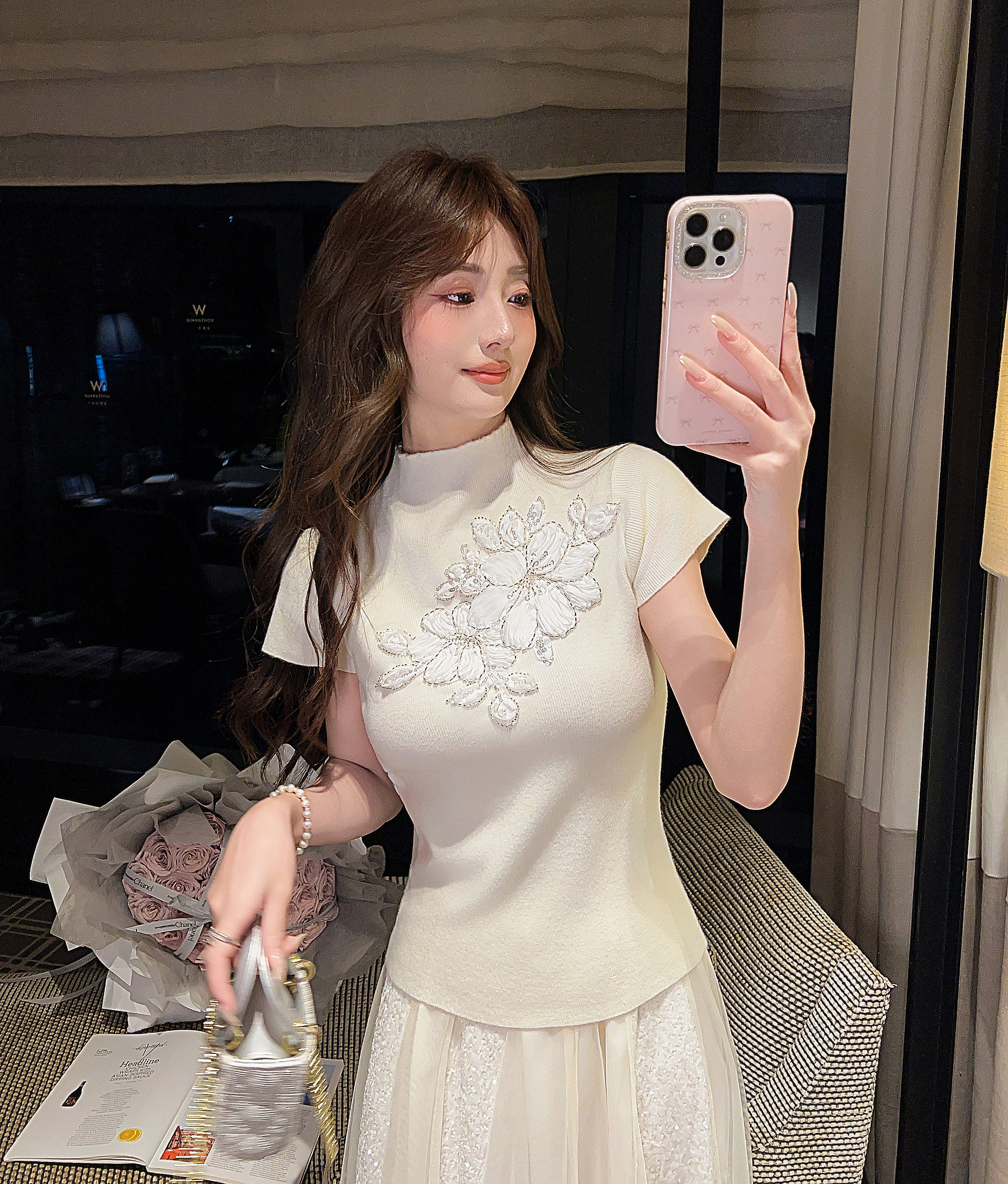张心子【手工花】绝美独特立体花半高领针织衫短袖上衣 U2602045