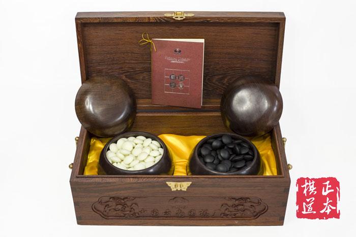 特点:鸡翅木以显著、独特的纹理著称,鸡翅木雕花外盒图案精制美观,深受文人雅士和广大围棋爱好者喜爱。鸡翅木内盒以精湛工艺加工而成,纹理独特,光滑圆润,厚实耐用。棋子由云南围棋厂工艺大师全手工打磨,整套产品呈现出尊贵高雅之气。