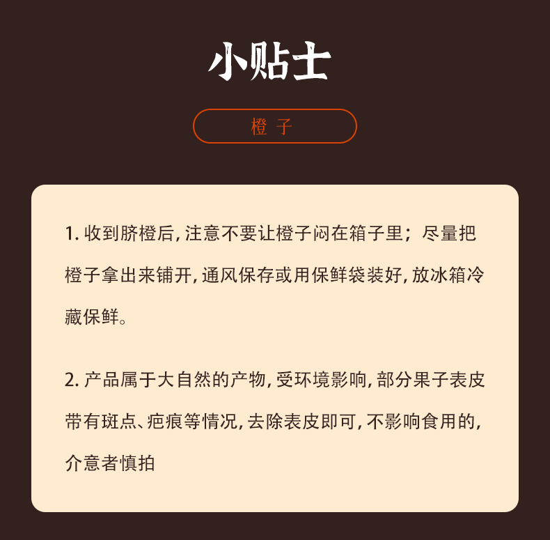 收到脐橙后,注意不要让橙子闷在箱子里;尽量把橙子拿出来铺开,通风保存或用保鲜袋装好,放冰箱冷藏保鲜。