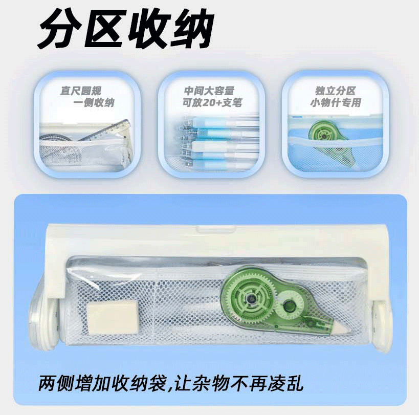 不用拉链,避免拉链久了卡顿、脱链滑链。超级大开口,比普通笔袋开头角度大一倍!拿去都非常方便。 三角稳定设计,而且不会软塌塌的。内部还有多层分袋可以分类收纳小文具。 轻松装下20多支笔和尺子橡皮等文具不在话下!
