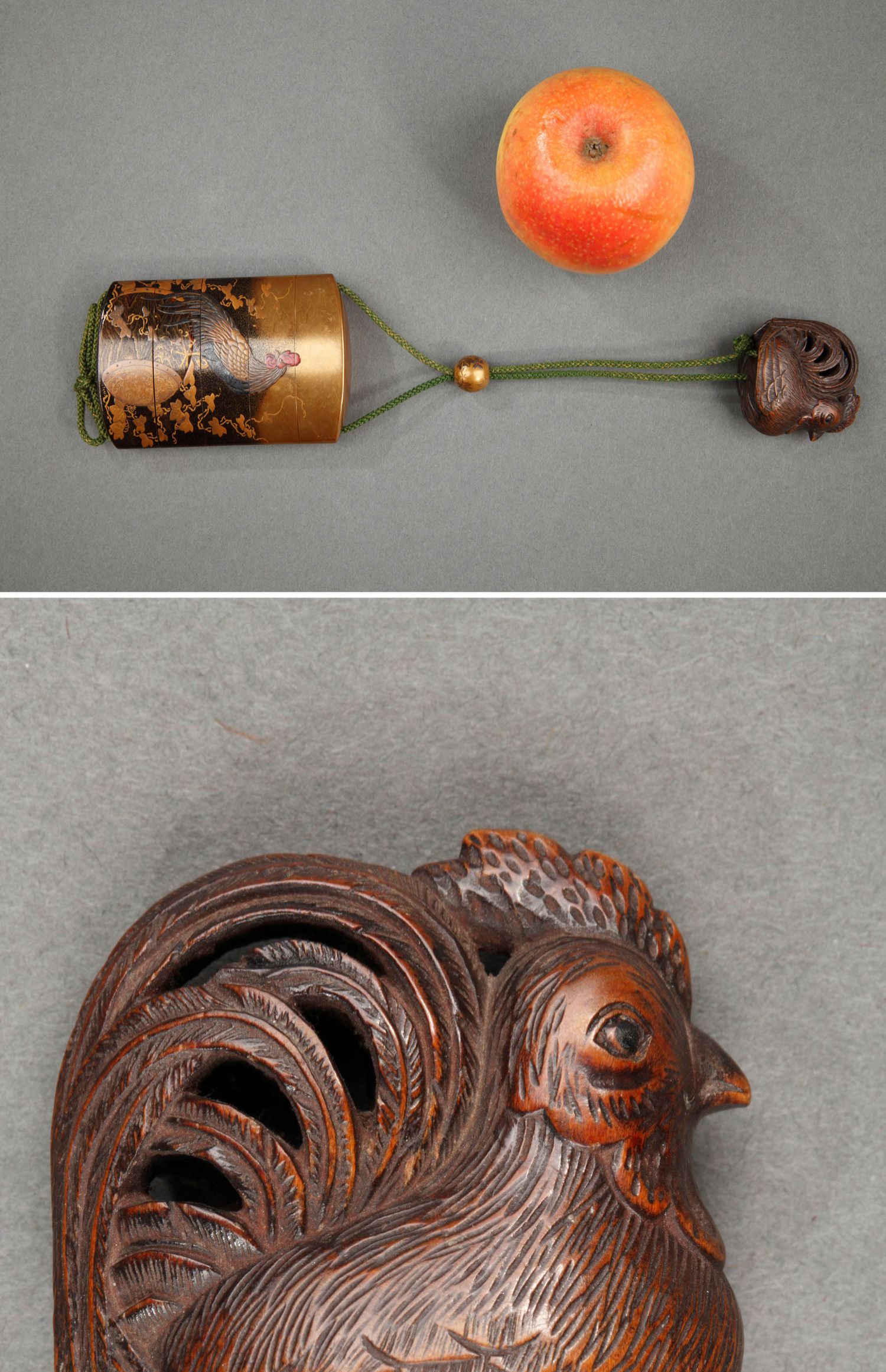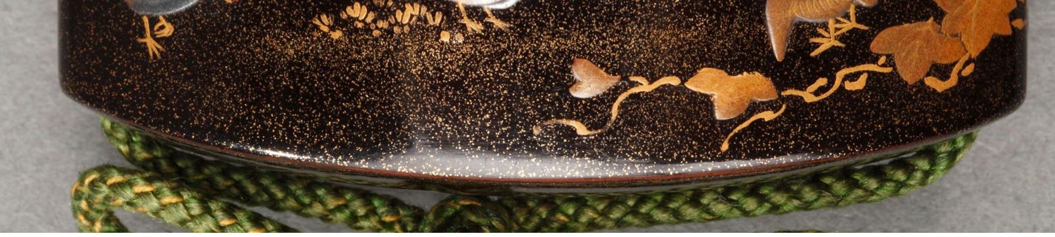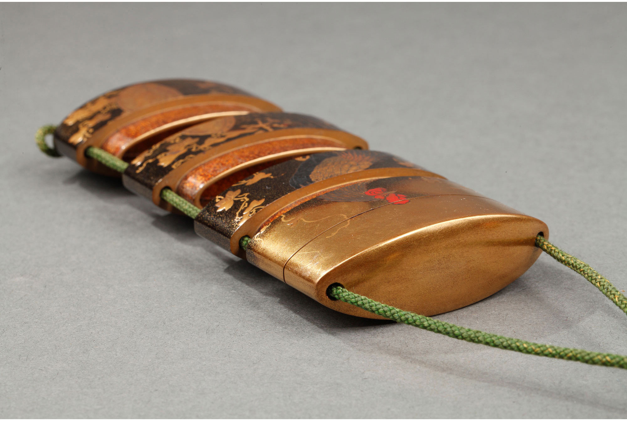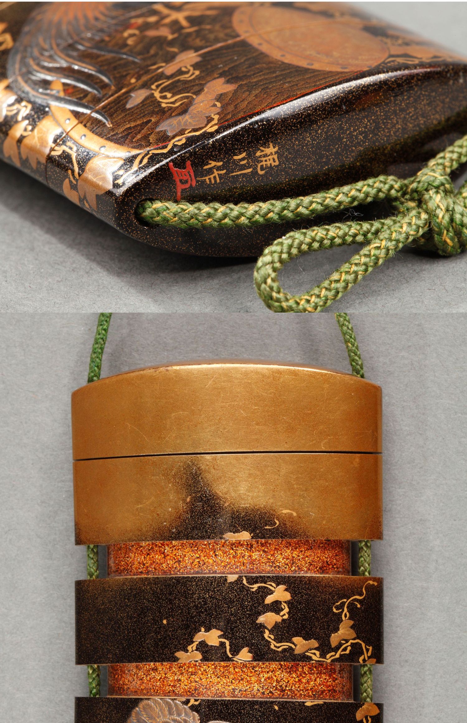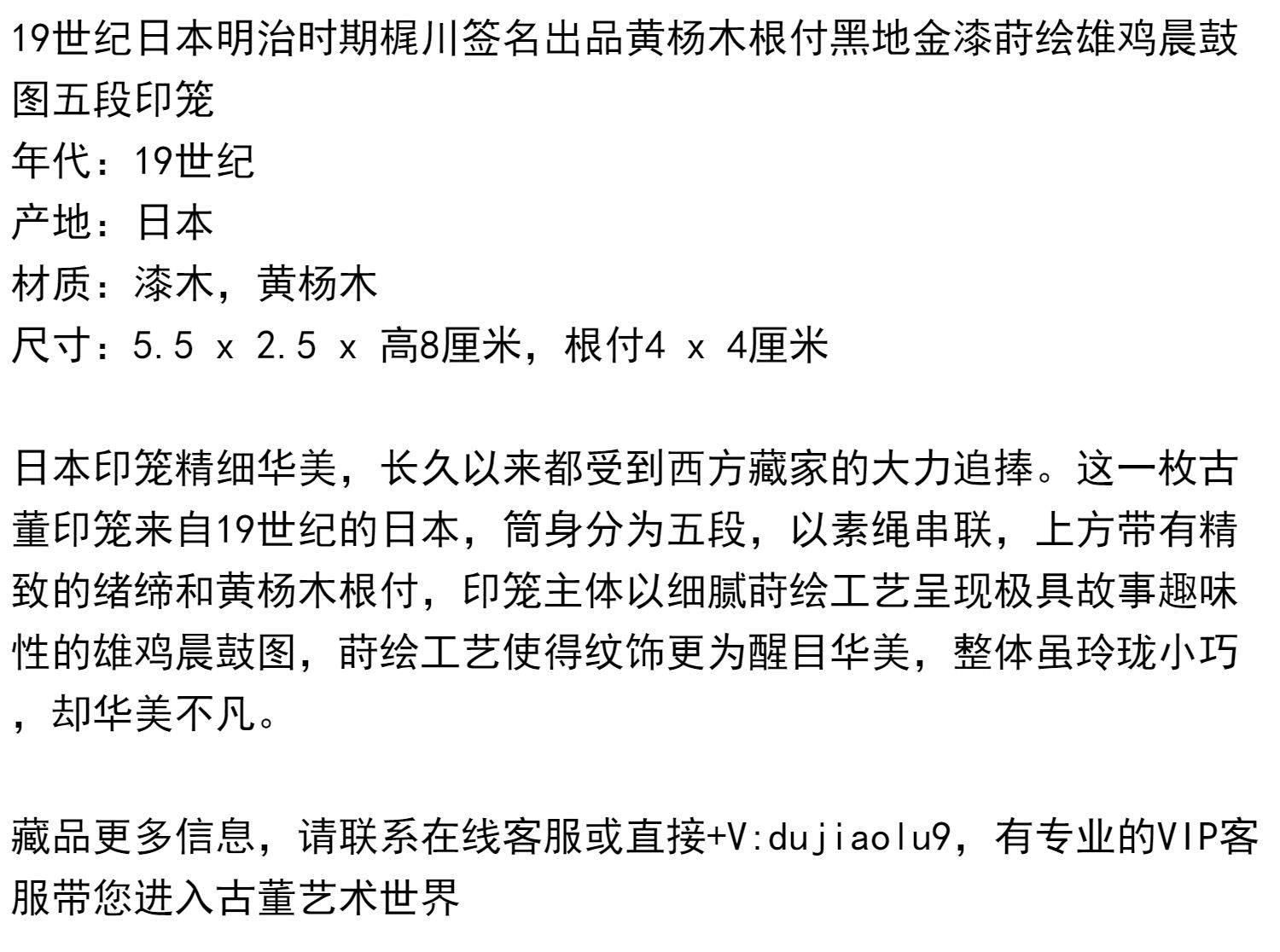 独角鹿西洋古董日本明治时期梶川签名黄杨木根付黑地金漆莳绘印笼