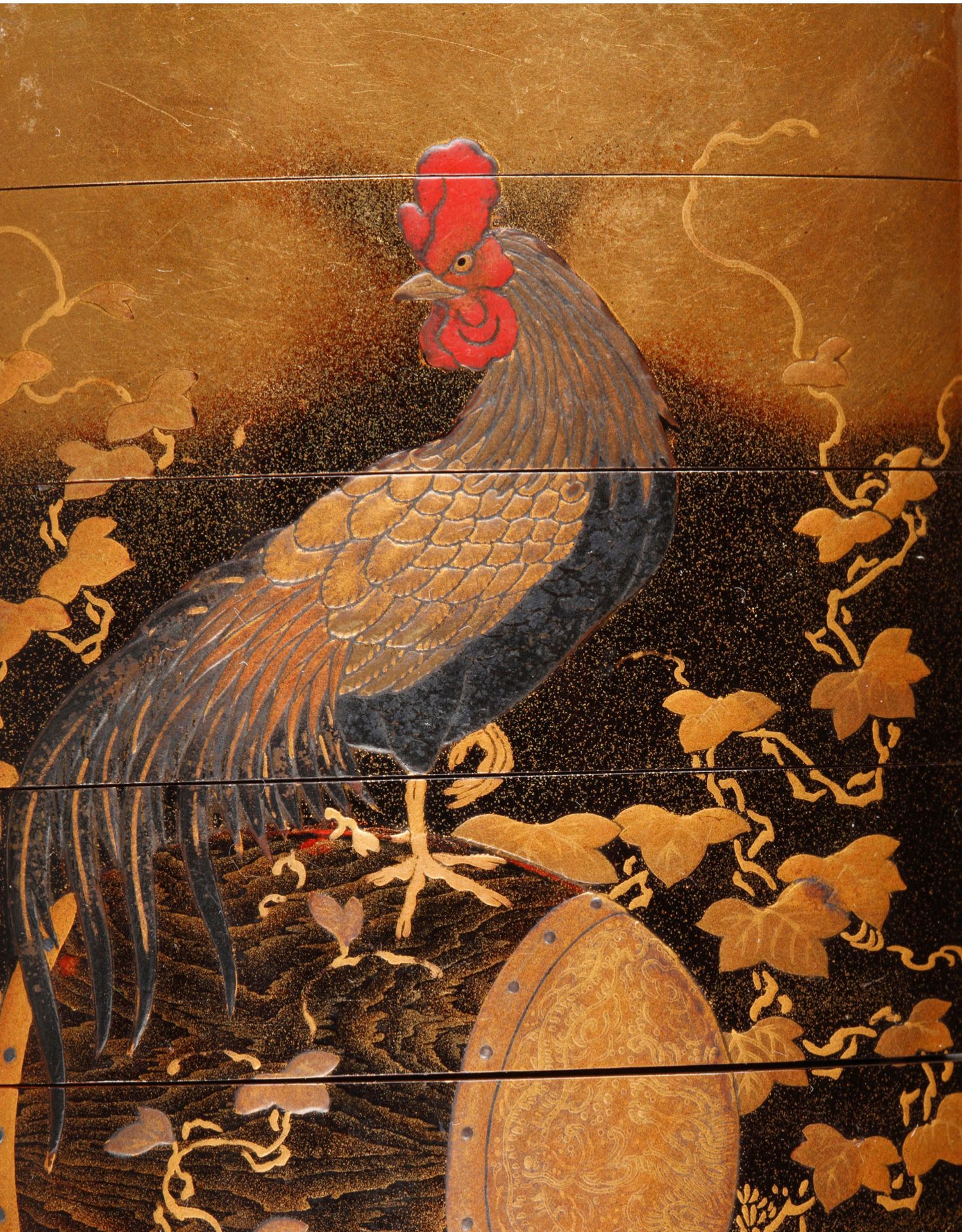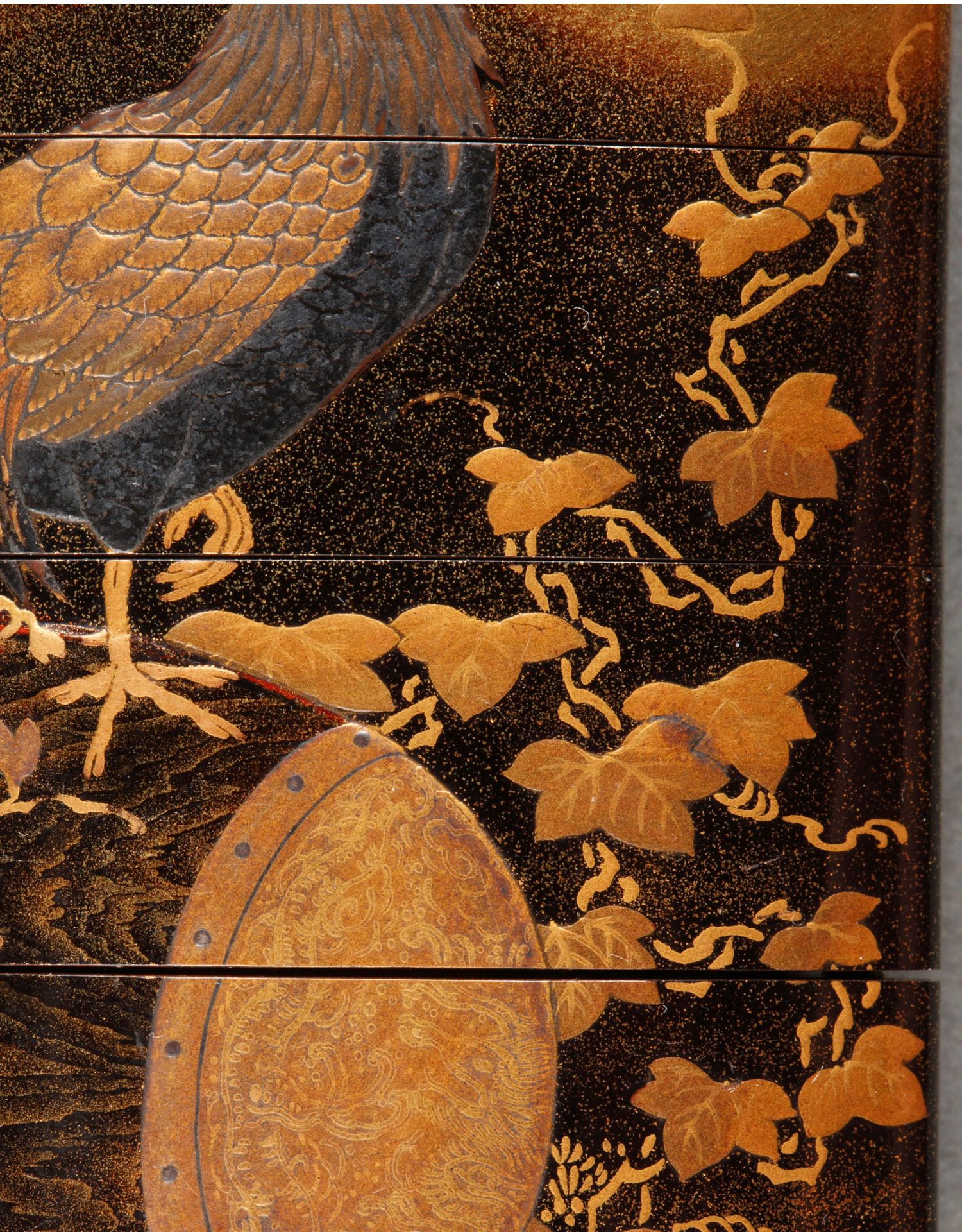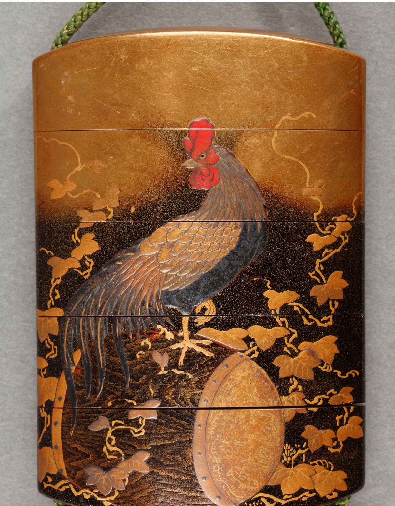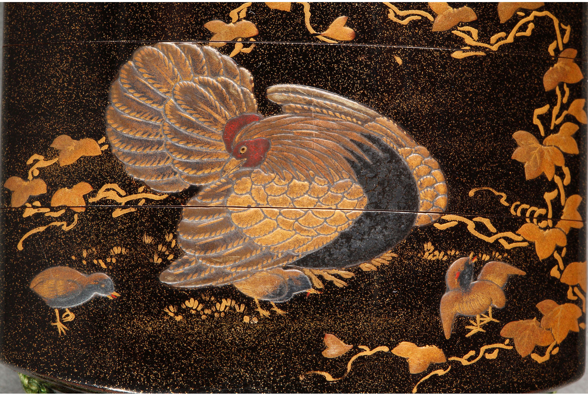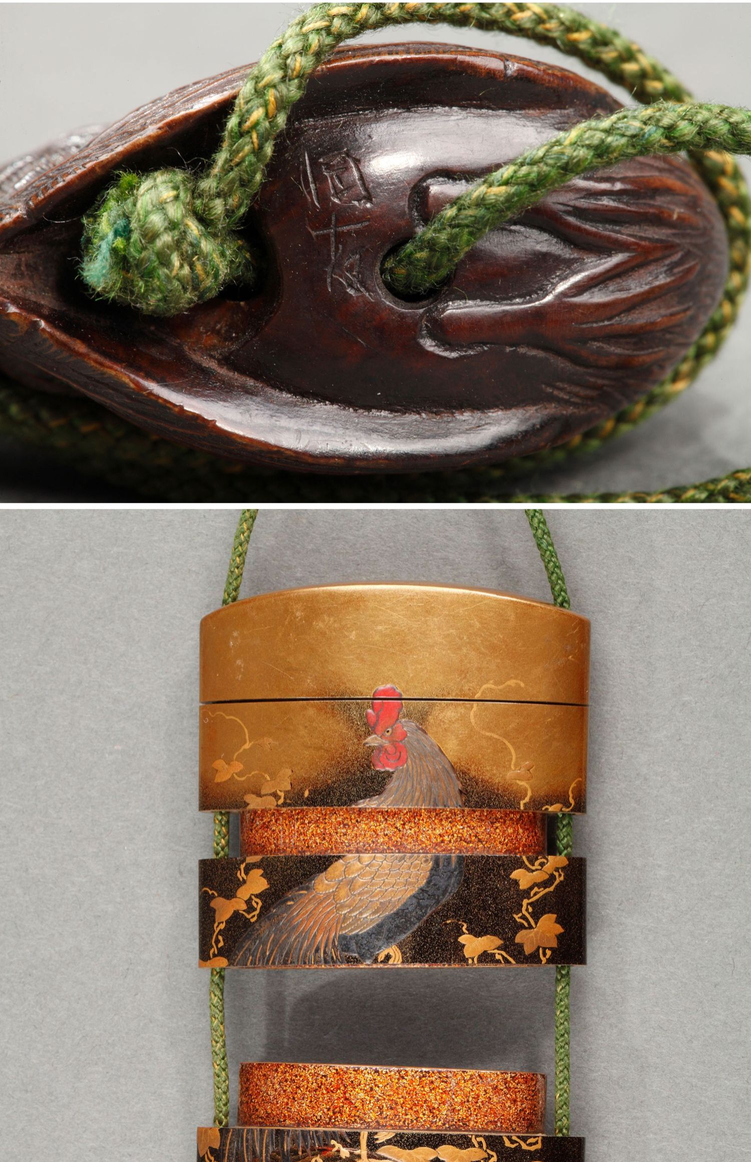独角鹿西洋古董日本明治时期梶川签名黄杨木根付黑地金漆莳绘印笼
