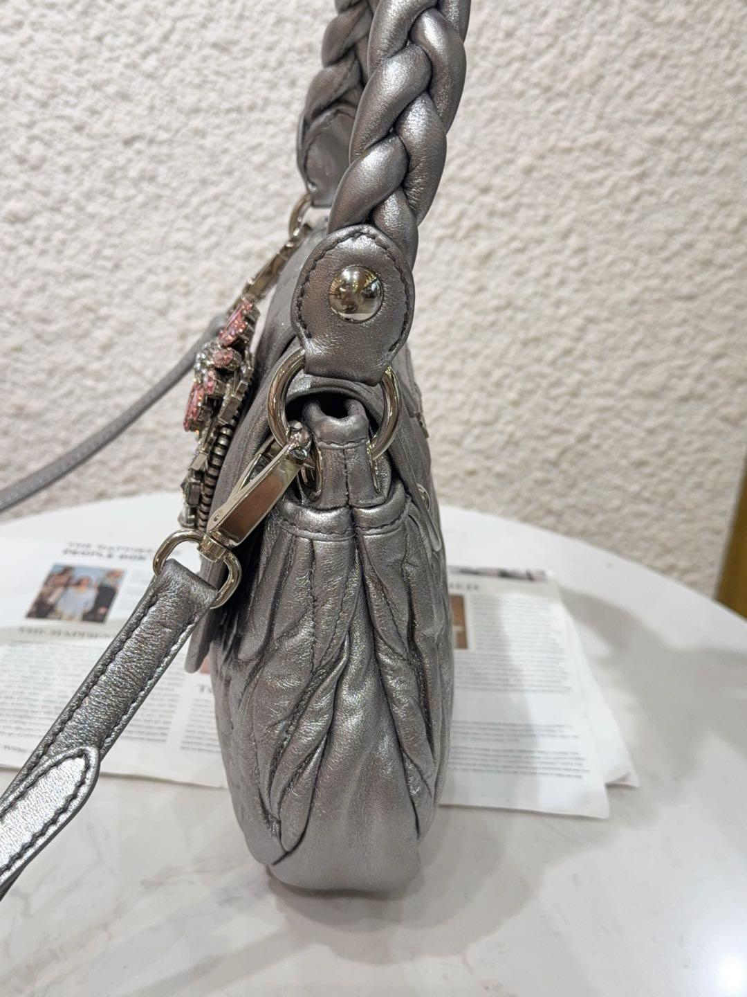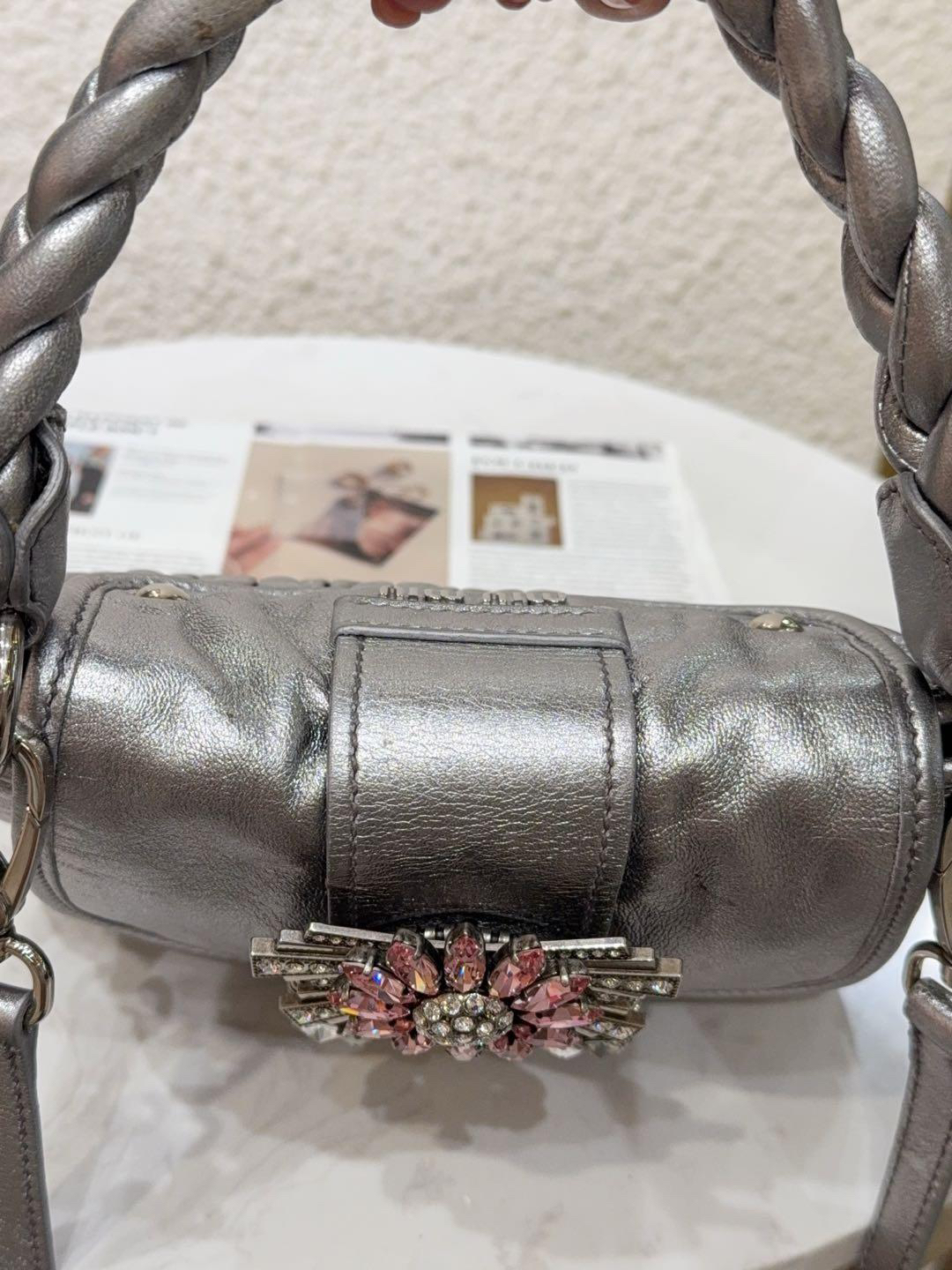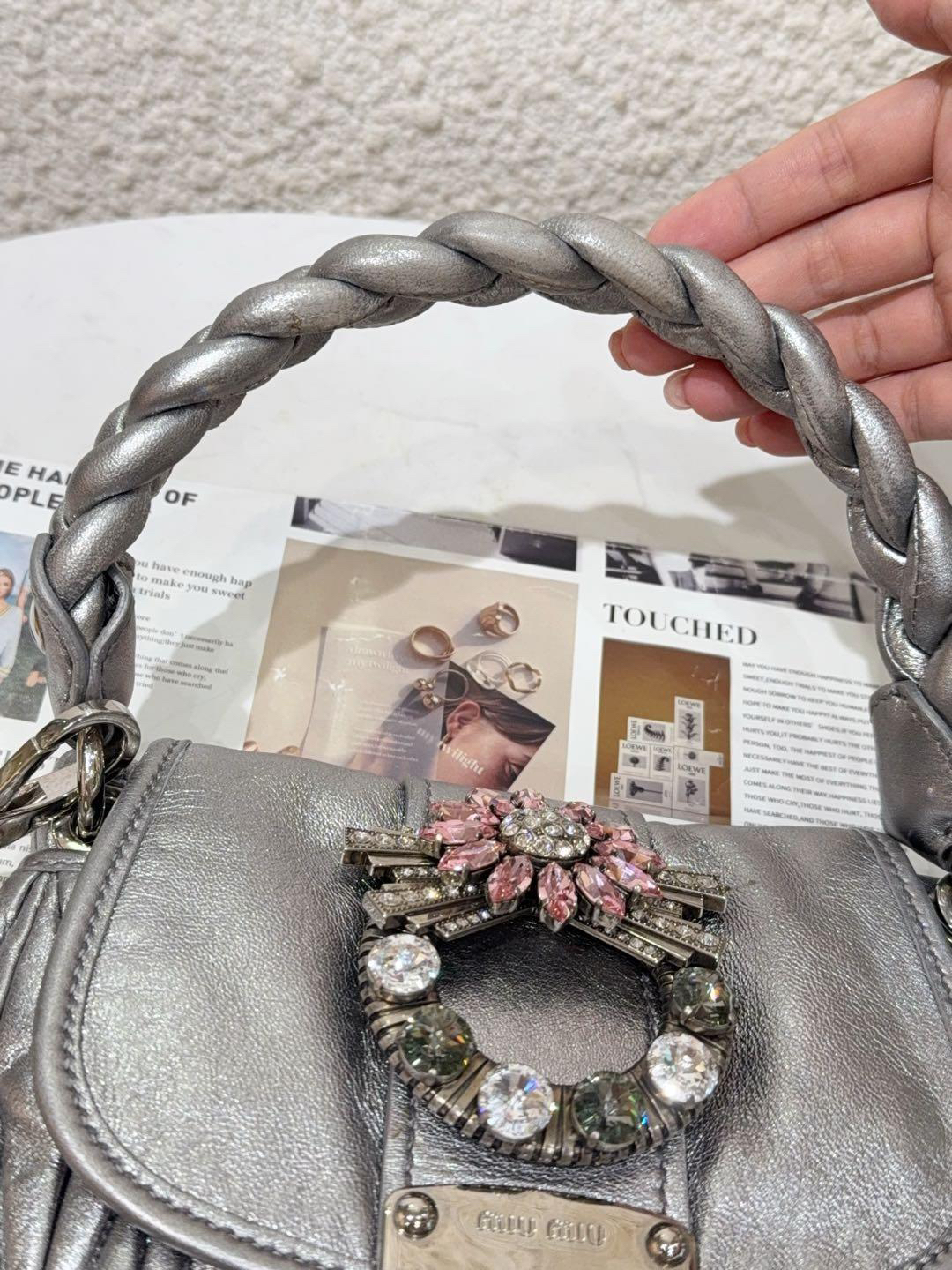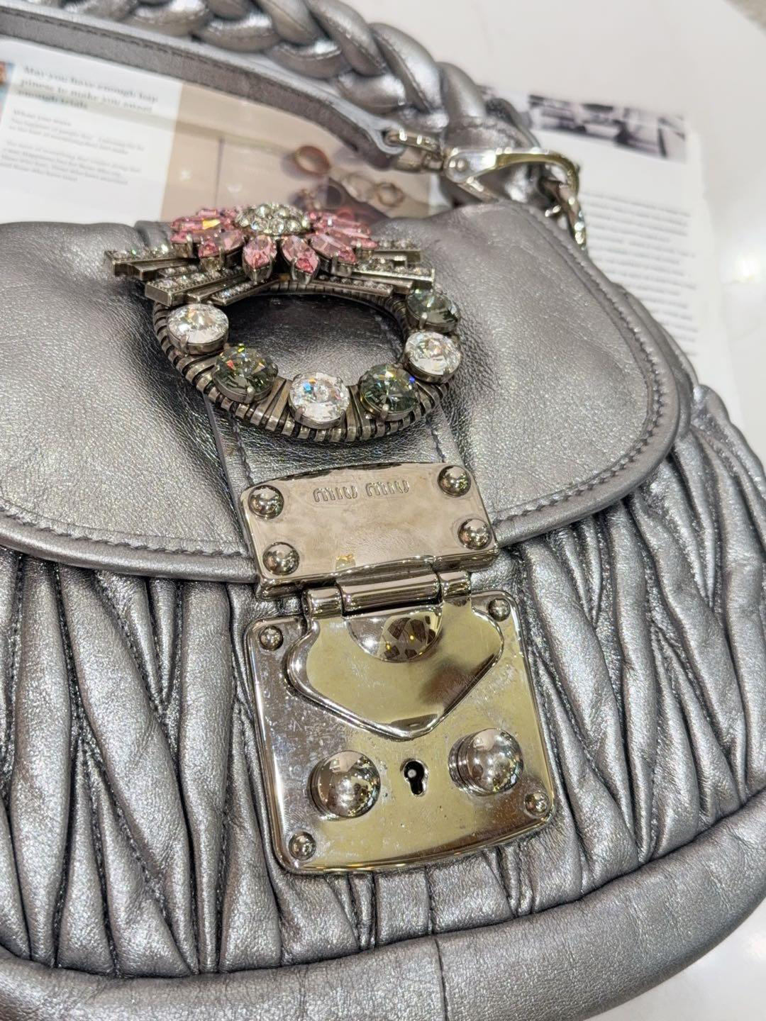 【商品詳情】正品二手 miumiu coffer 银色 水钻 羊皮 编织包🍁93新 23×18 配件:肩带。手柄和金属正常使用感。走秀款 重工超绝