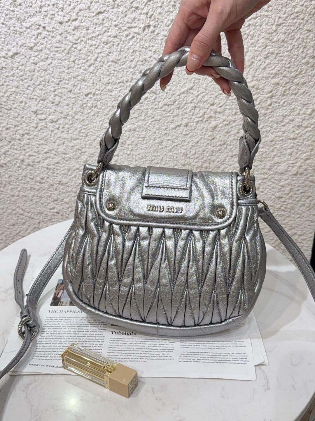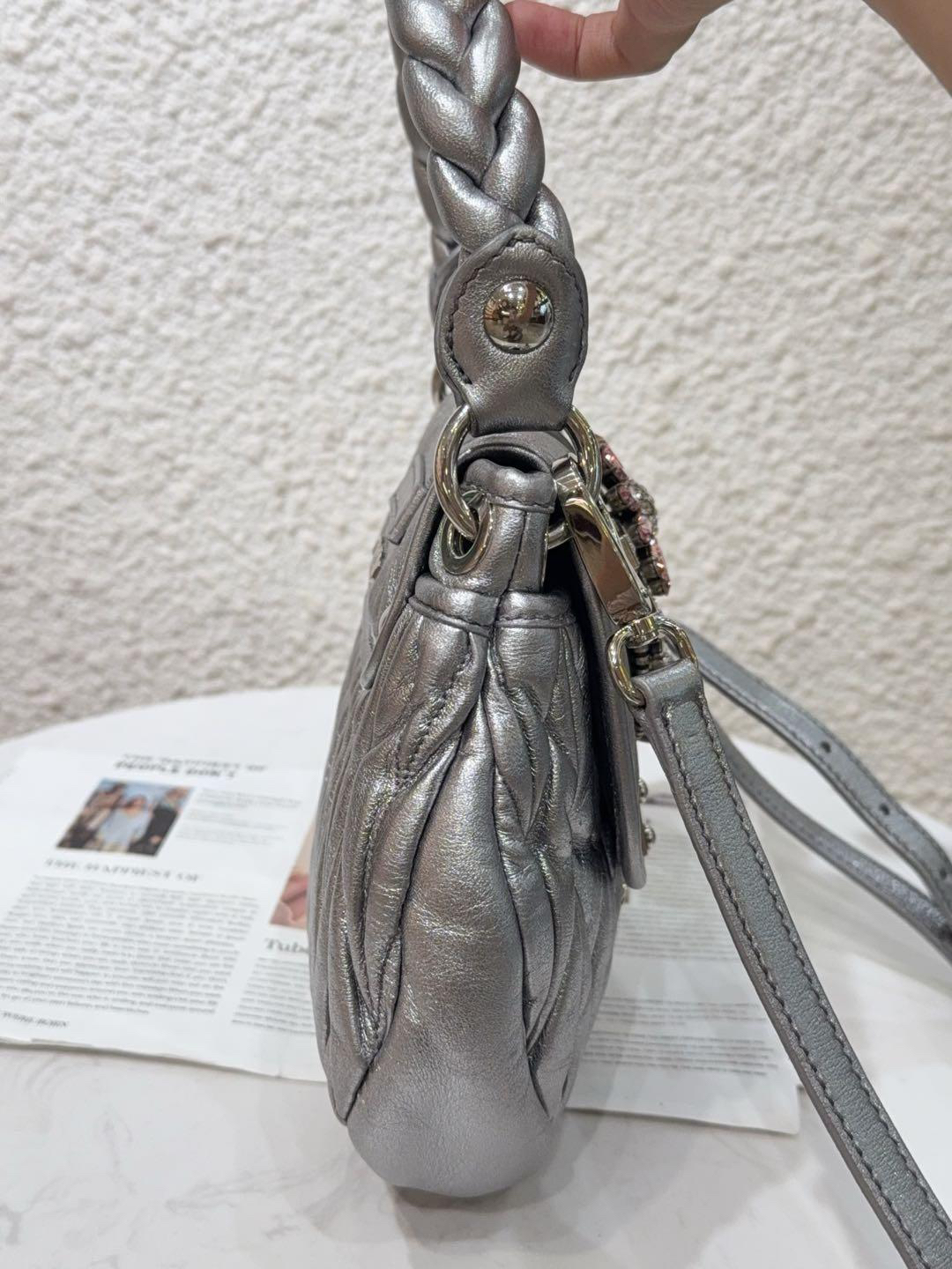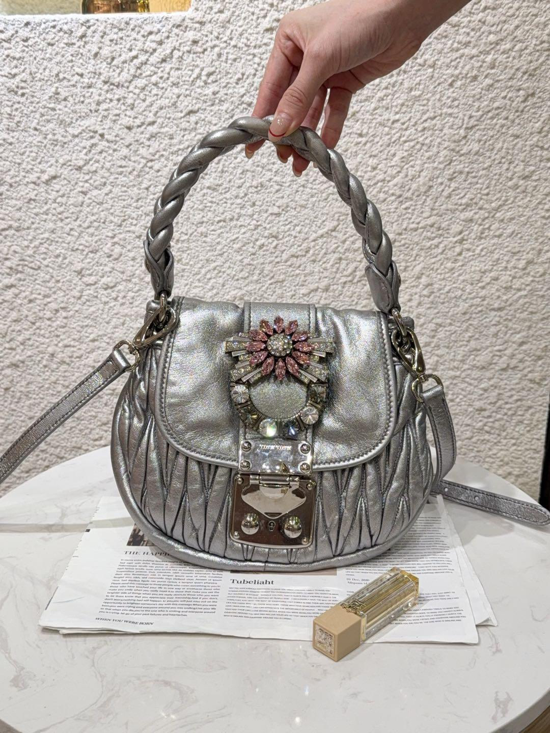【商品詳情】正品二手 miumiu coffer 银色 水钻 羊皮 编织包🍁93新 23×18 配件:肩带。手柄和金属正常使用感。走秀款 重工超绝