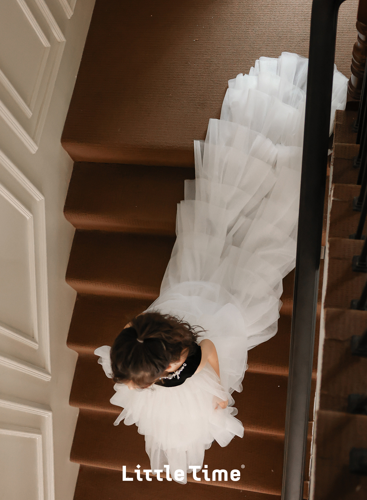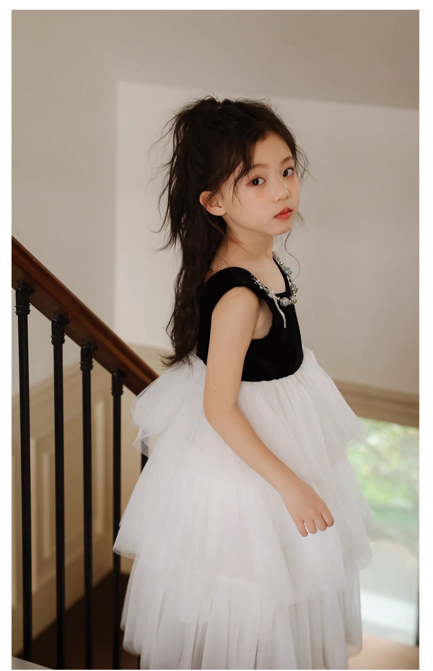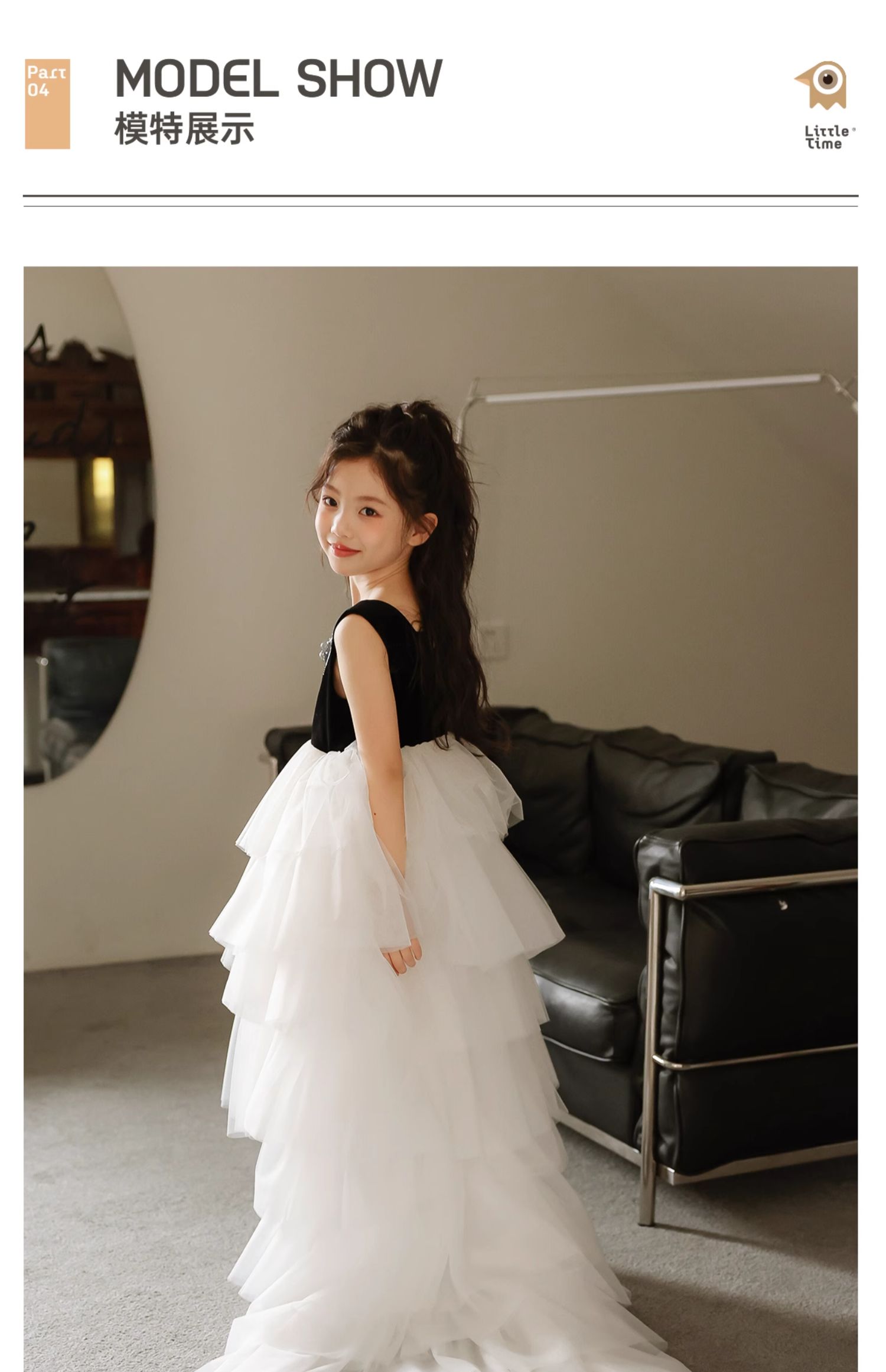 Littletime女童黑色长拖尾礼服套装裙2025新款夏装女孩赫本魔术珠