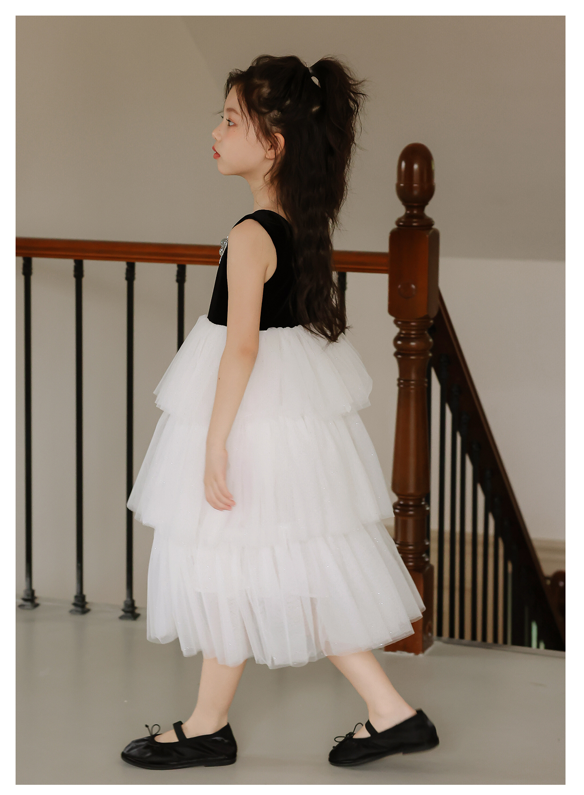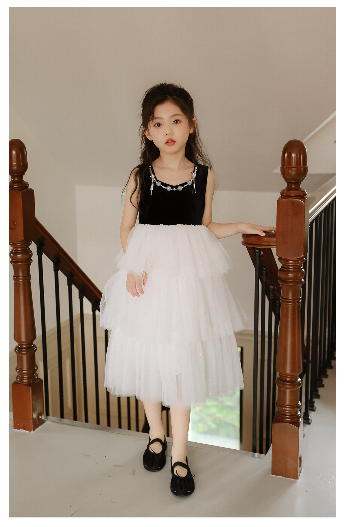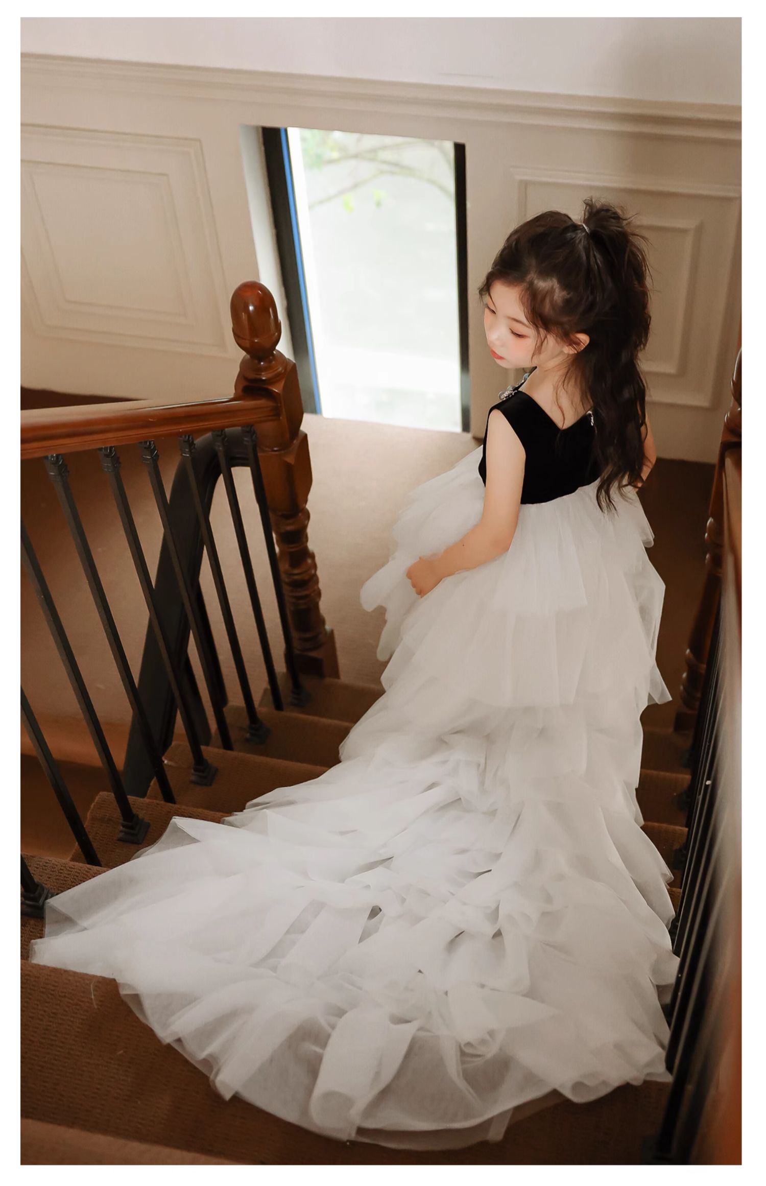 Littletime女童黑色长拖尾礼服套装裙2025新款夏装女孩赫本魔术珠