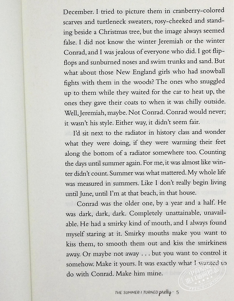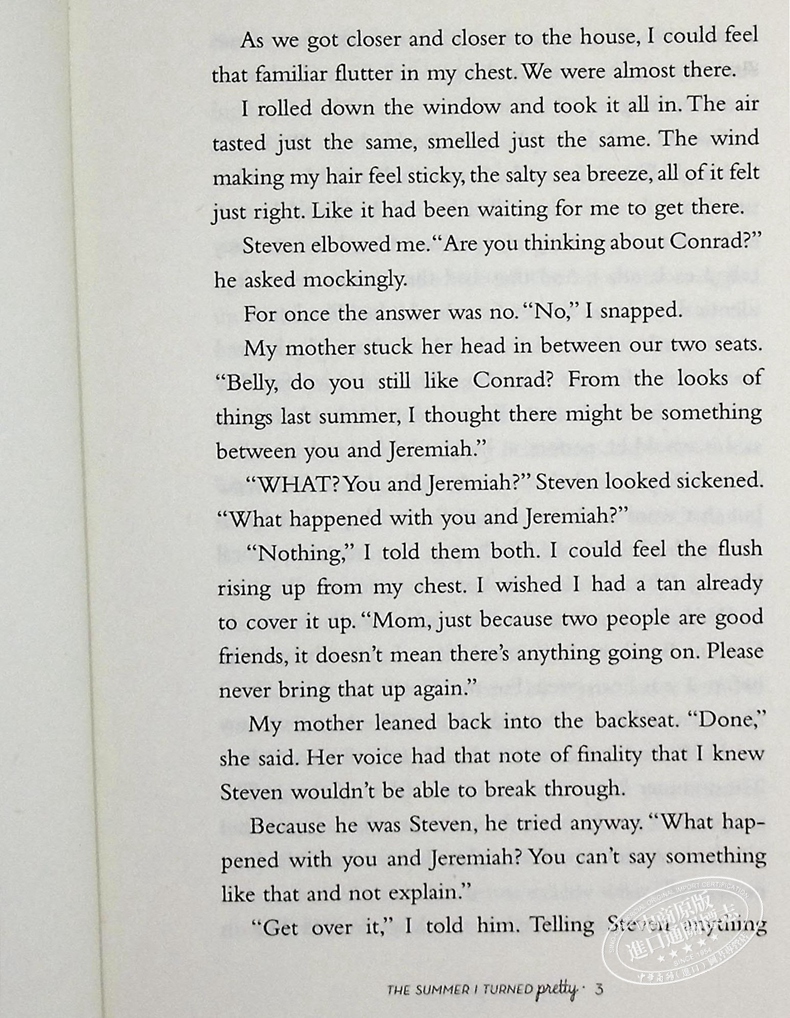 贝利用夏天来衡量她的生活。一切美好的事物,一切神奇的事物都发生在六月和八月之间。冬天只是一个数着周数直到下一个夏天的时间,一个远离海滨别墅、远离苏珊娜的地方,Z重要的是,远离耶利米和康拉德。他们是贝利从第Yi个夏天起就认识的男孩--他们是她的兄弟形象,她的暗恋对象,以及两者之间的一切。但是,在一个夏天,一个美妙而又可怕的夏天,一切都发生了变化,一切都结束了,就像一直以来应该有的那样。