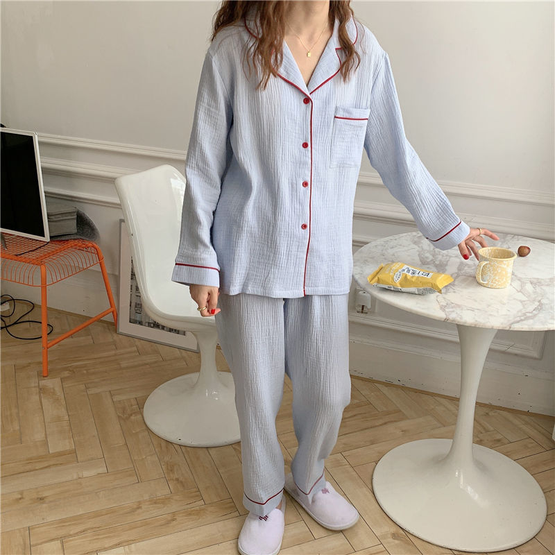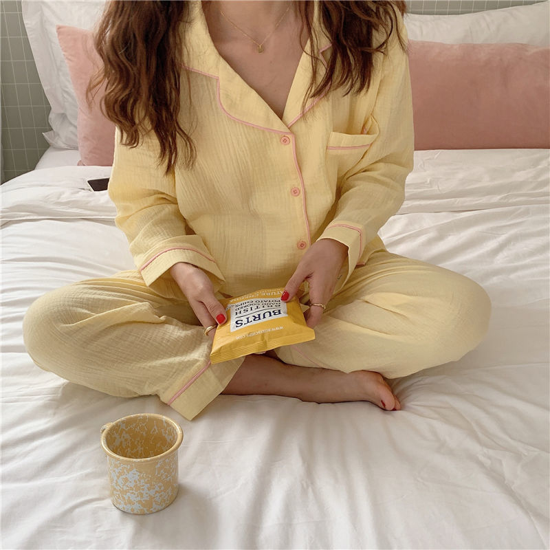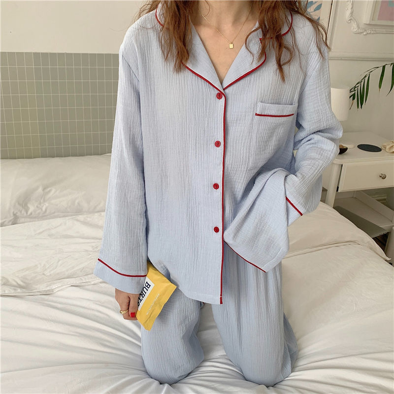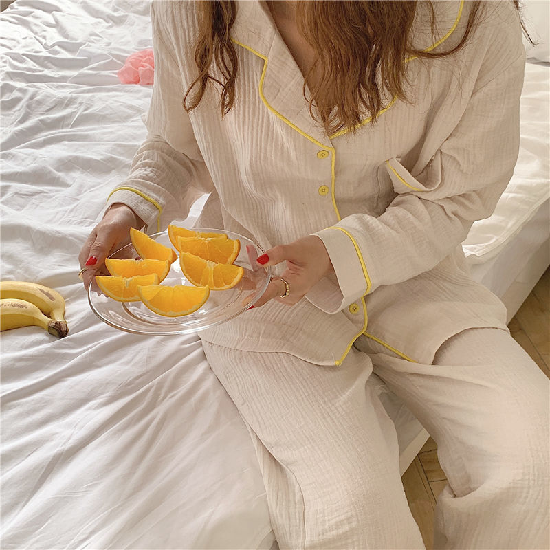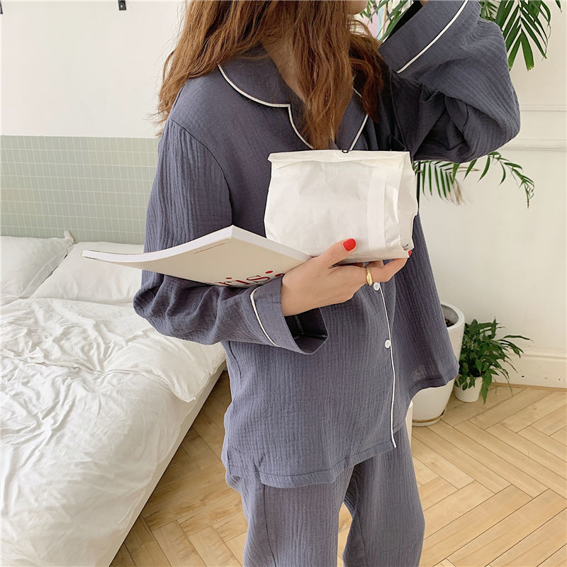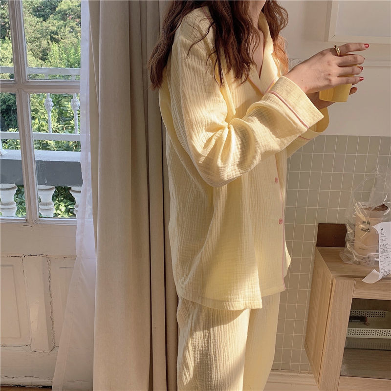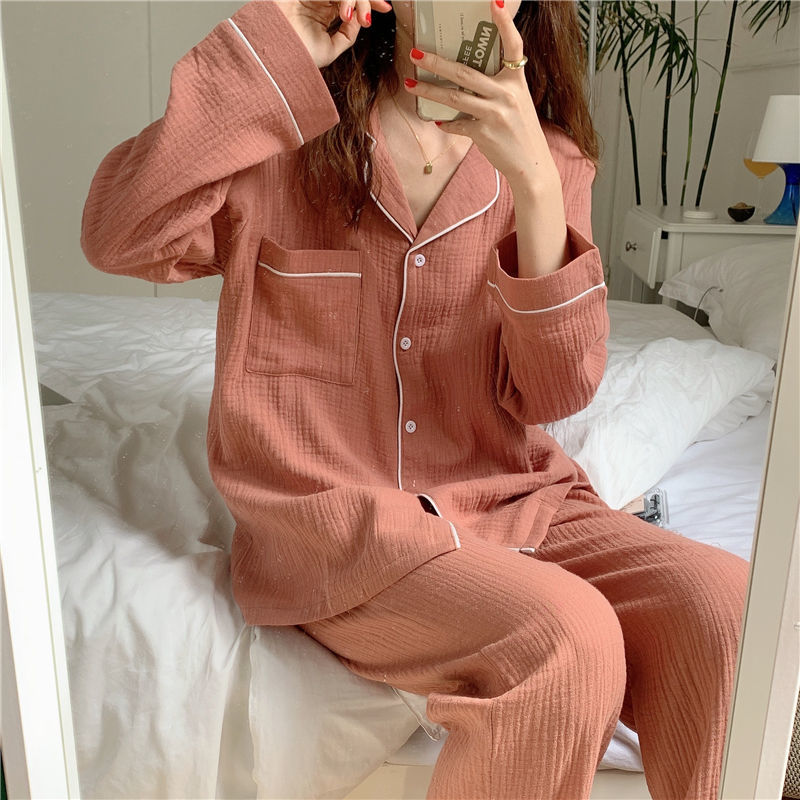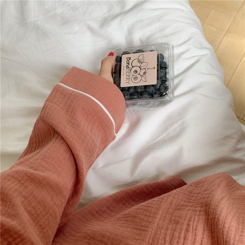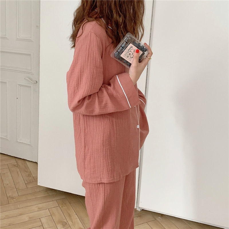 纯棉纱布长袖睡衣女秋季套装学生ins风宽松纯色家居服长裤两件套