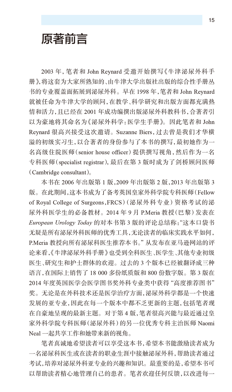 第4版在以往基础上做了全面更新,以反映近年来医学和外科领域的重大进展,包括盆腔腹腔镜和机器人手术、治疗尿失禁和男性性健康的新药,以及用于前列腺手术的新型激光设备;还讨论了近期泌尿科的争议,如阴道网片的使用。来自欧洲泌尿外科协会(EAU)、美国泌尿外科协会(AAU)、英国泌尿外科协会(BAU)以及英国国立临床规范研究所(NICE)的指南均已更新,以反映z佳循证临床实践。