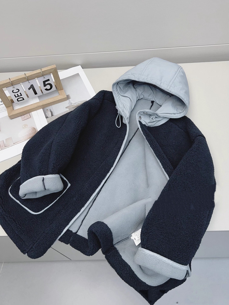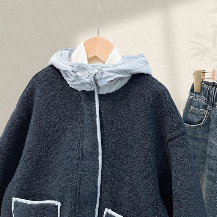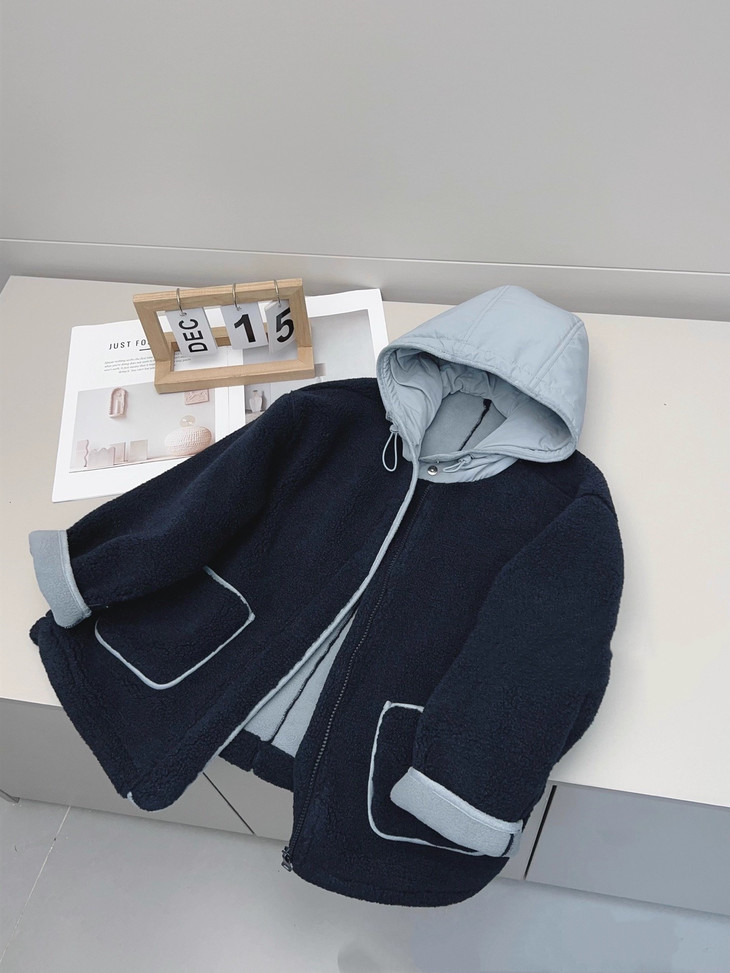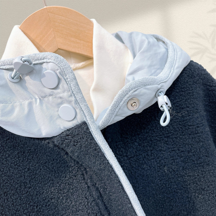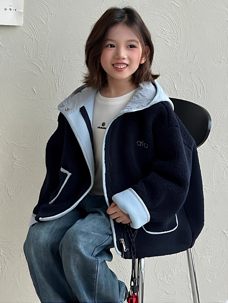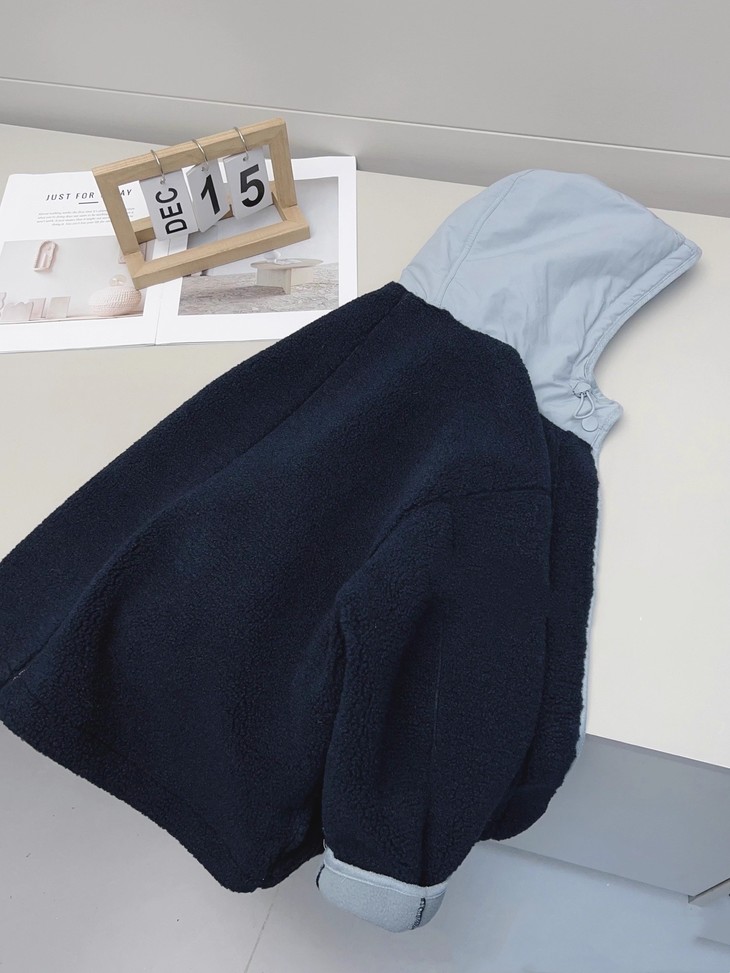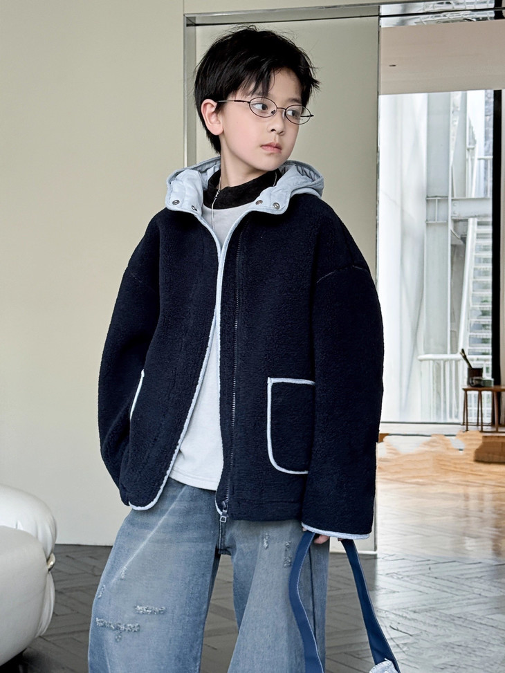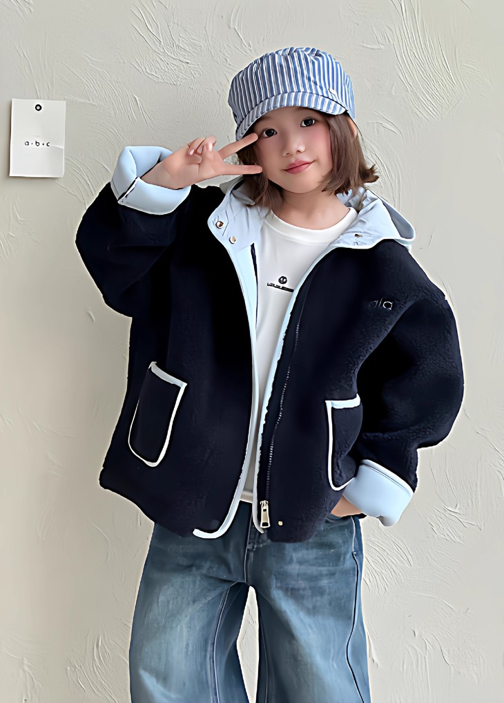 2.撞色设计 - 主体毛绒面料(藏青色)搭配浅蓝色包边, 覆盖领口、袖口、口袋边缘及门襟,视觉上清新柔和,同时强化款式层次感。