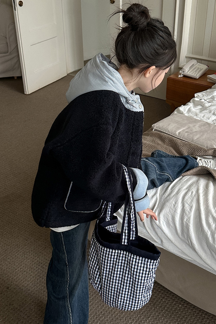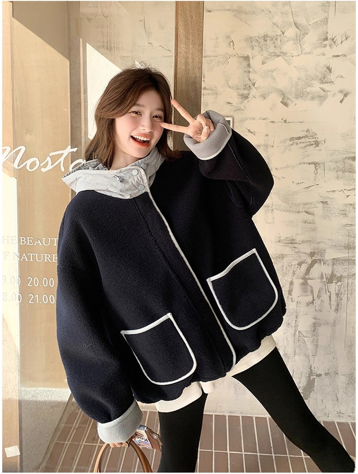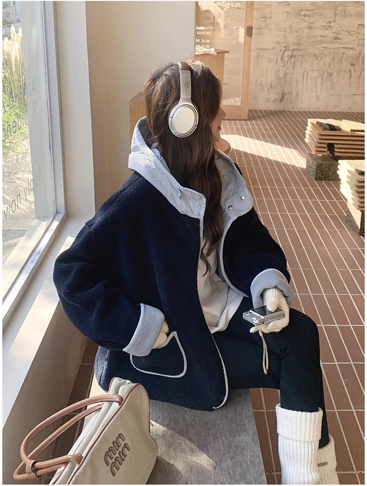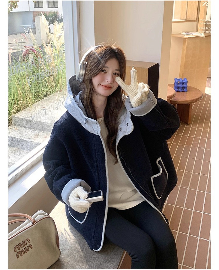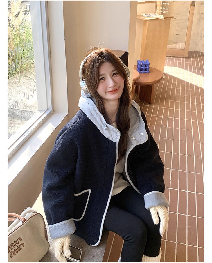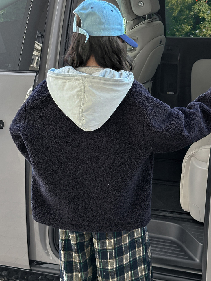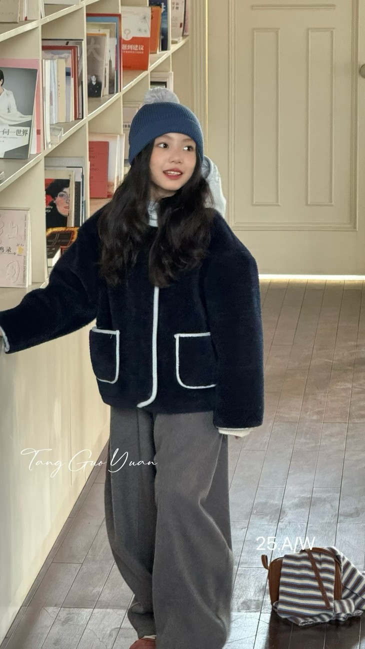 2.撞色设计 - 主体毛绒面料(藏青色)搭配浅蓝色包边, 覆盖领口、袖口、口袋边缘及门襟,视觉上清新柔和,同时强化款式层次感。
