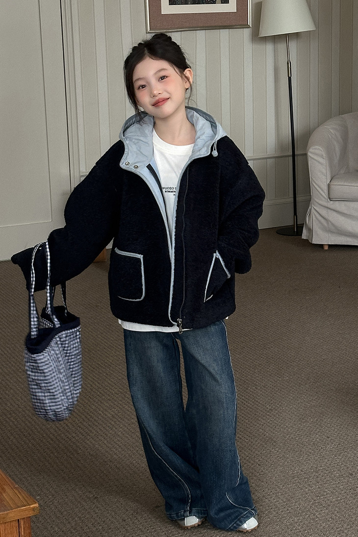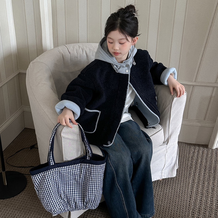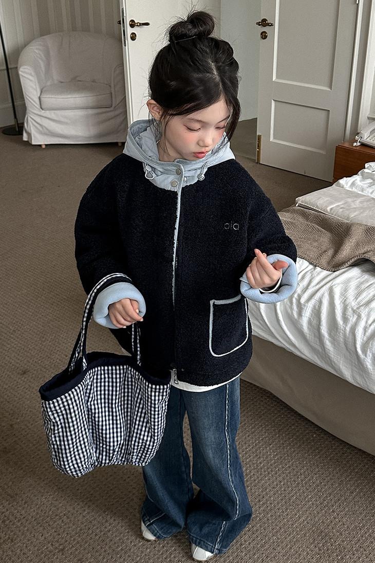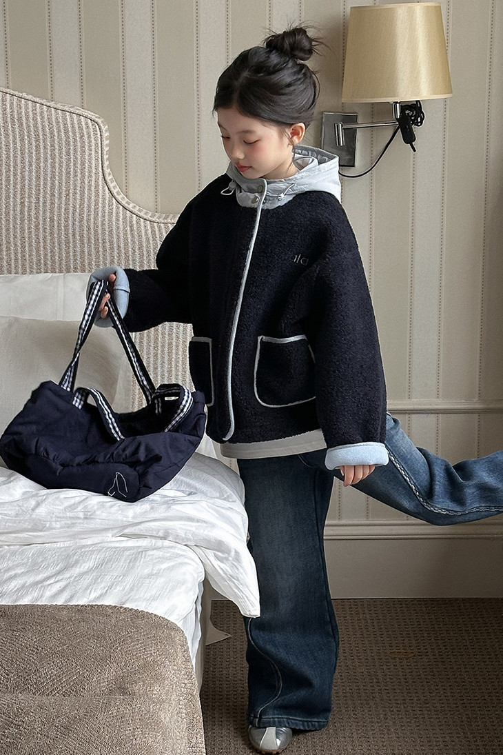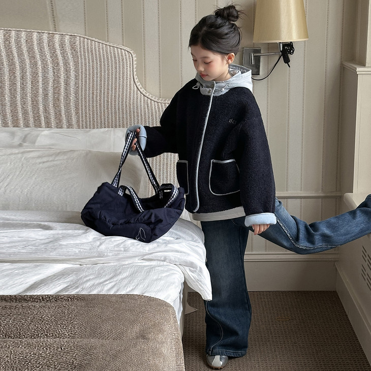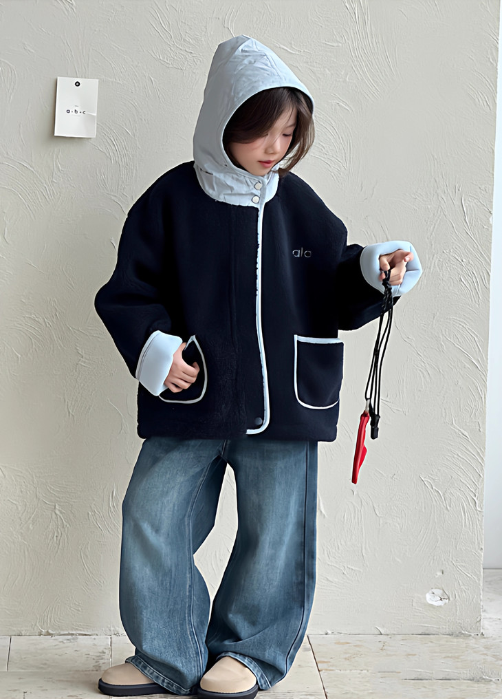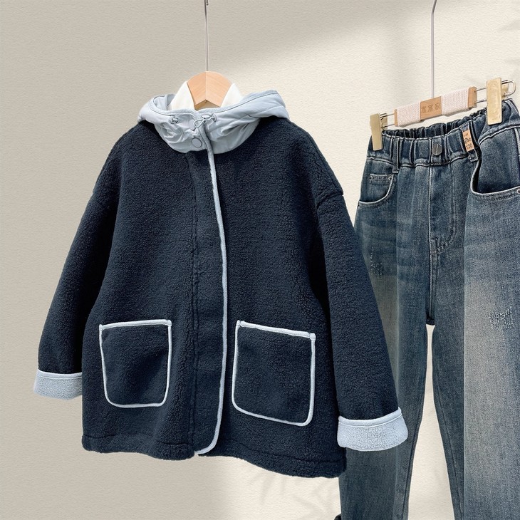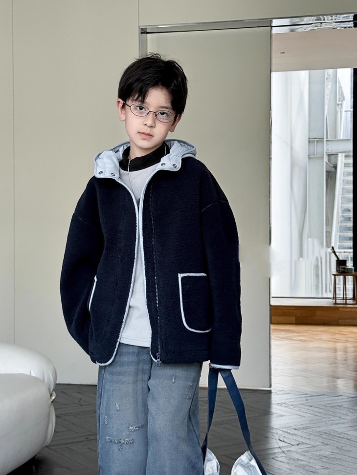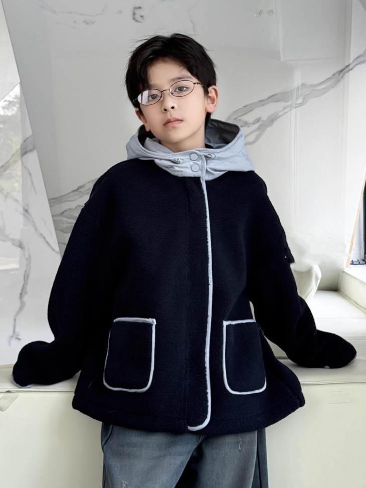 3.实用细节 - 大尺寸贴袋:袋口做了加宽浅蓝色包边,既加固袋身,又增加装饰性, 能轻松放下孩子的小物件; - 按扣门襟:避免拉链剐蹭毛绒,穿脱更顺畅,对低龄儿童更友好; - 宽松版型:不限制内搭厚度,可叠加毛衣/卫衣,适配秋冬不同穿搭需求。