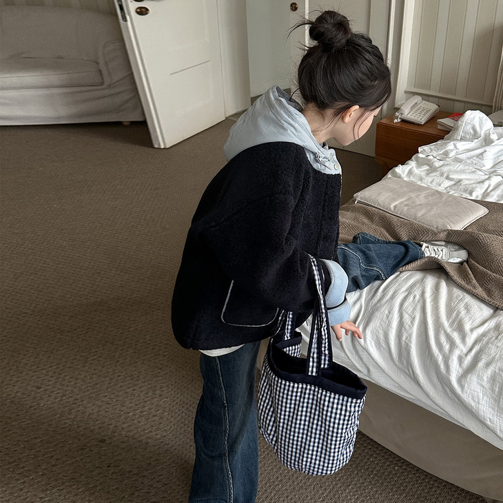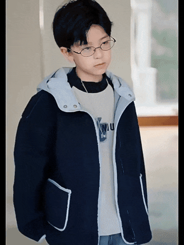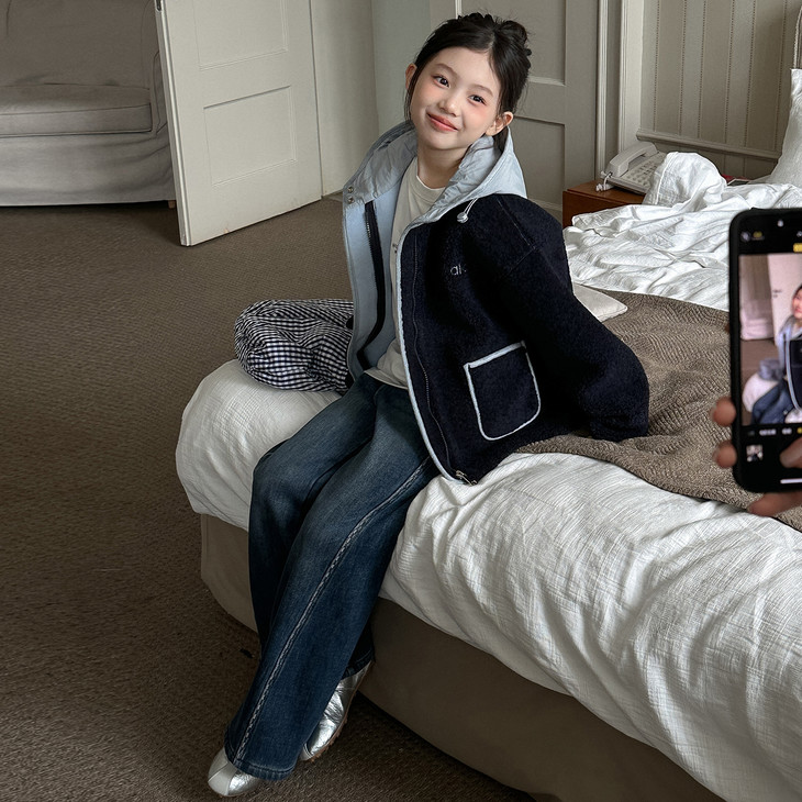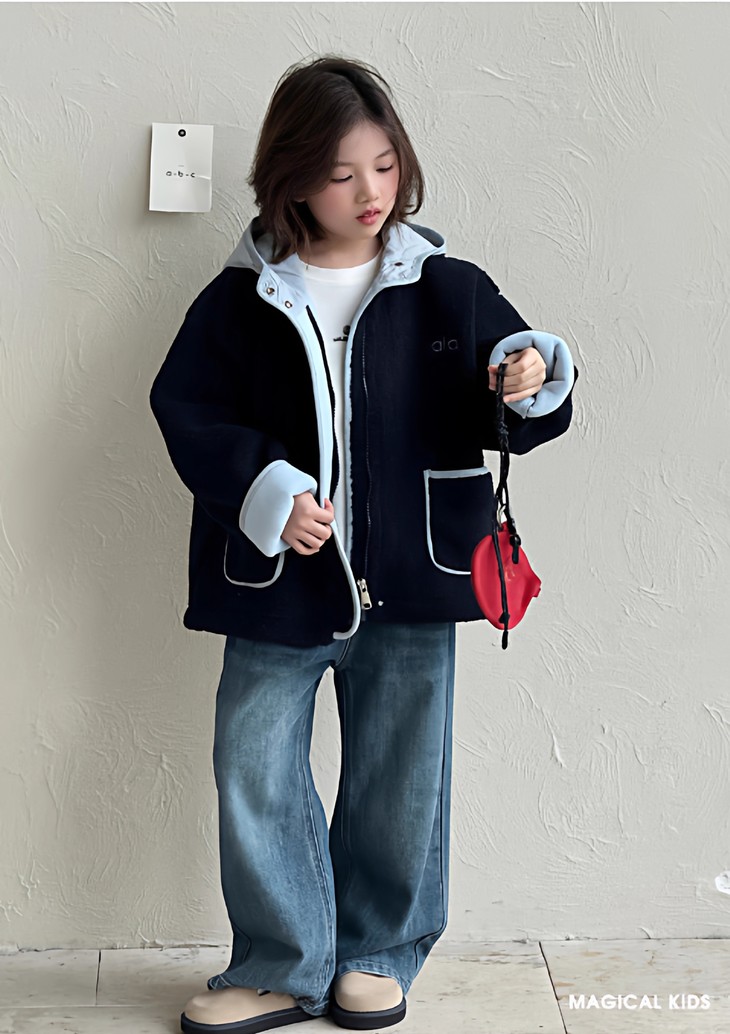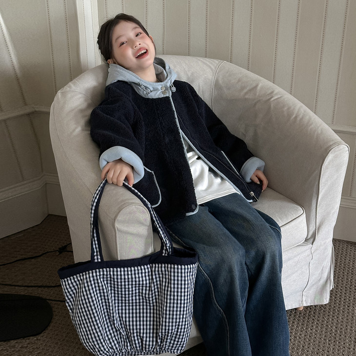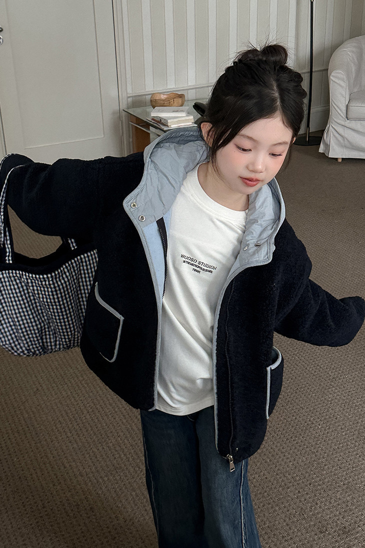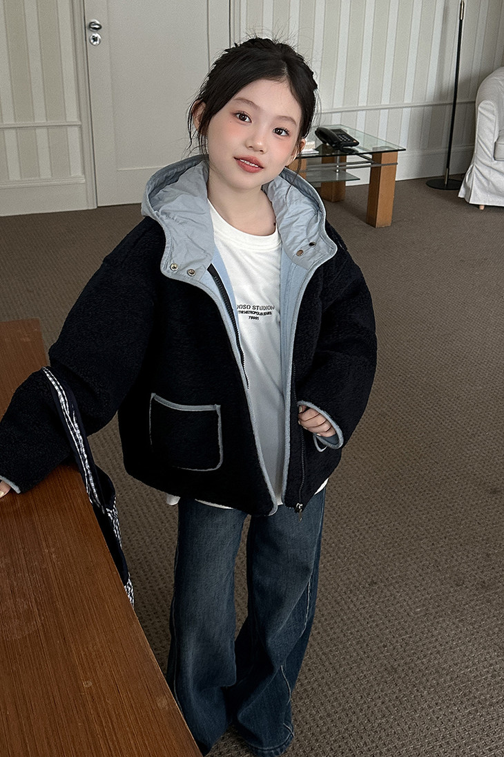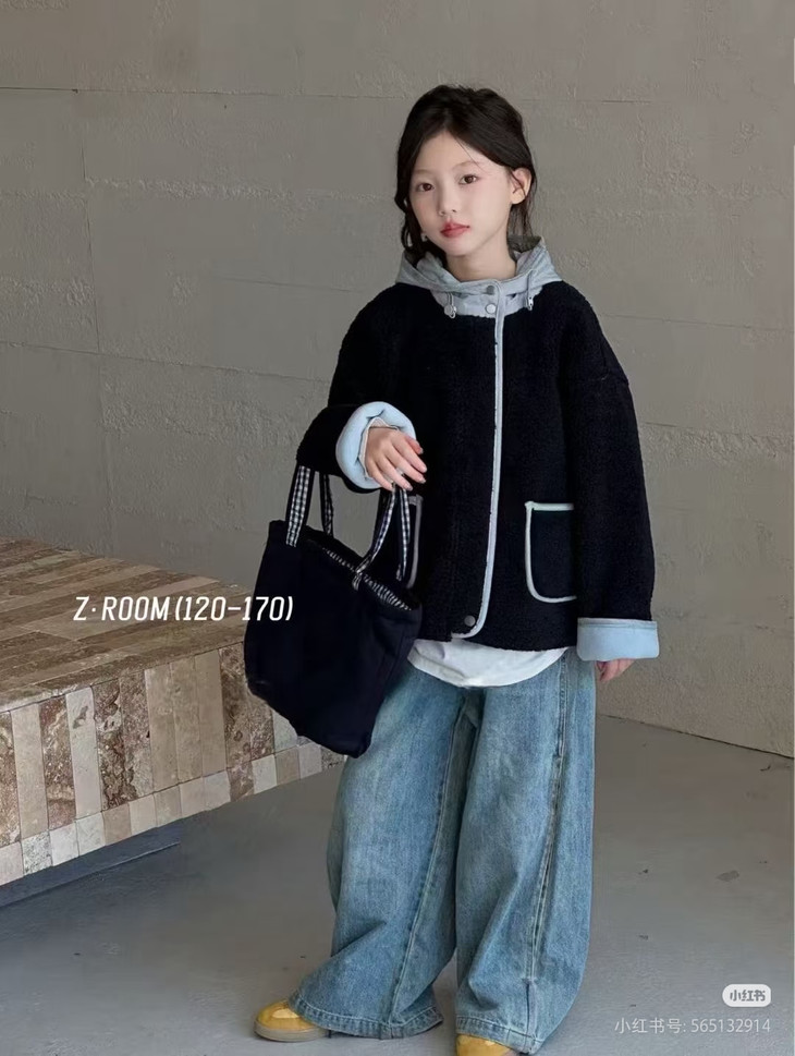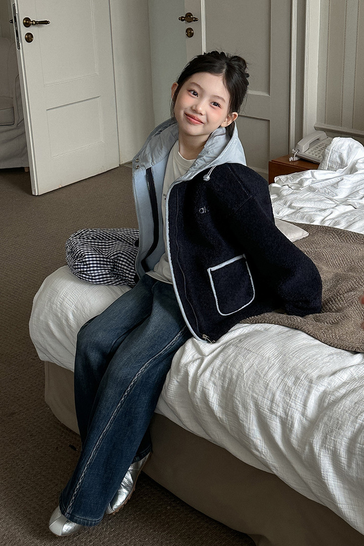 3.实用细节 - 大尺寸贴袋:袋口做了加宽浅蓝色包边,既加固袋身,又增加装饰性, 能轻松放下孩子的小物件; - 按扣门襟:避免拉链剐蹭毛绒,穿脱更顺畅,对低龄儿童更友好; - 宽松版型:不限制内搭厚度,可叠加毛衣/卫衣,适配秋冬不同穿搭需求。