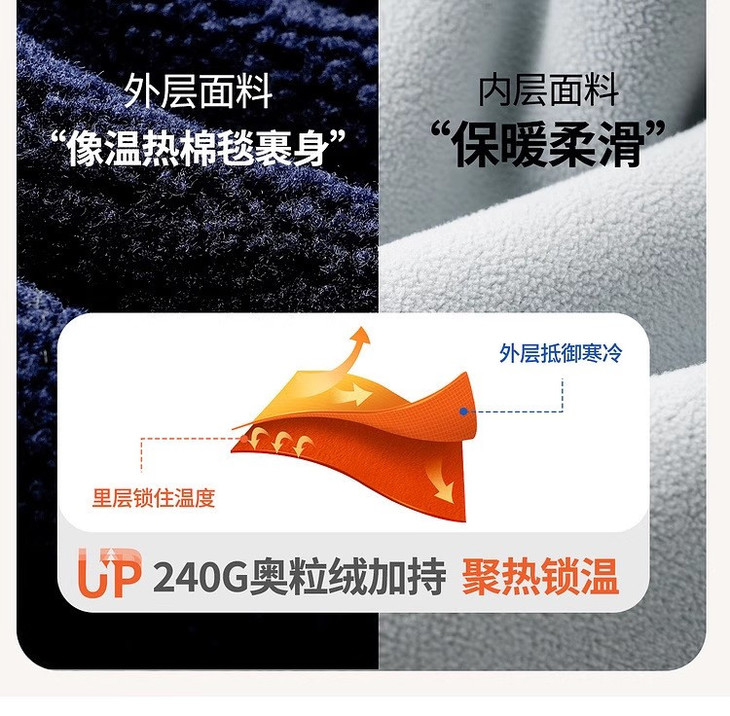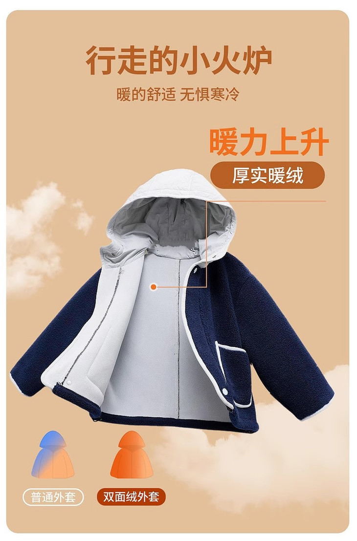 1.保暖结构 - 采用双绒复合工艺,外层是柔软亲肤的长绒毛毛面料, 内层加衬摇粒绒,双重锁温,适配0-15℃低温环境。