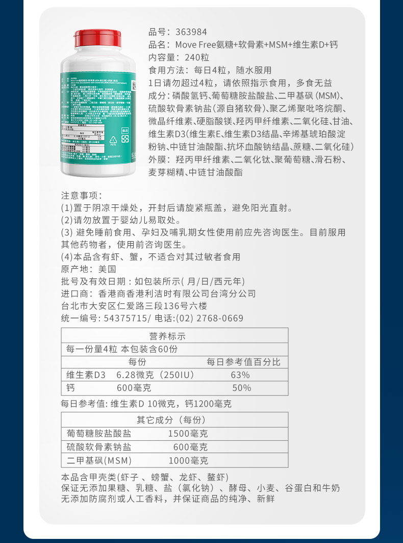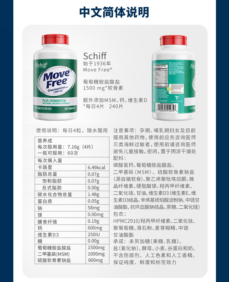 Move Free维骨力氨糖软骨素 高钙氨糖240粒