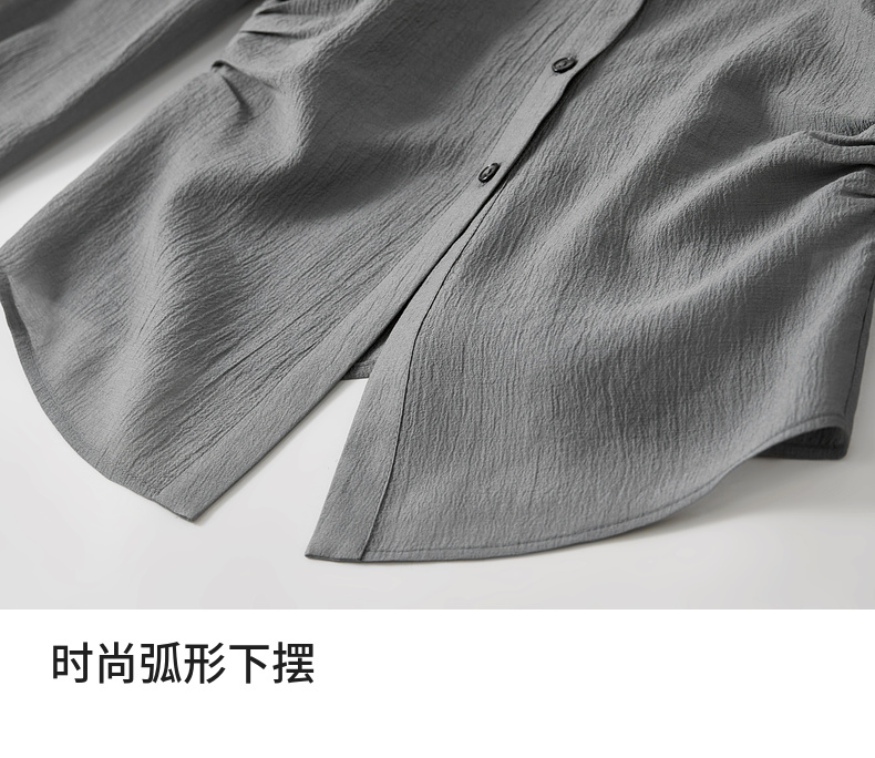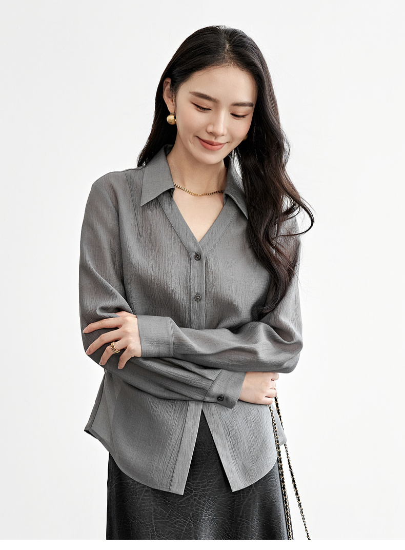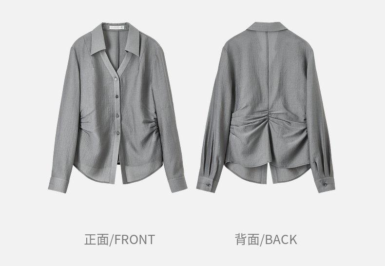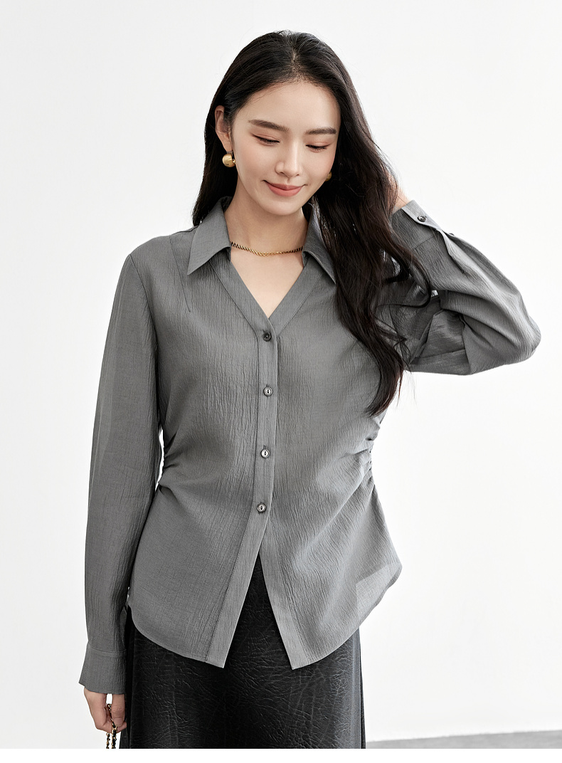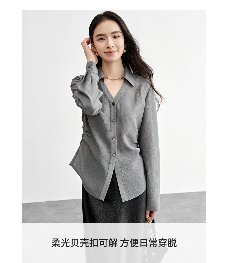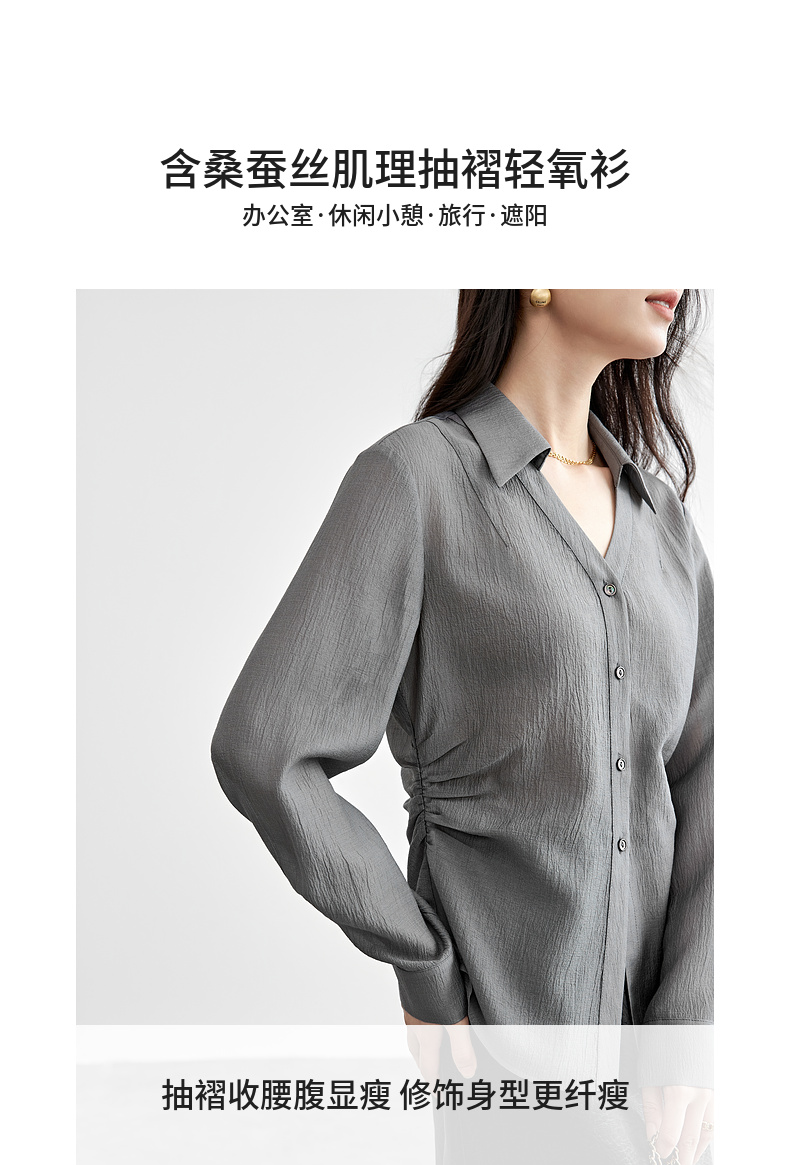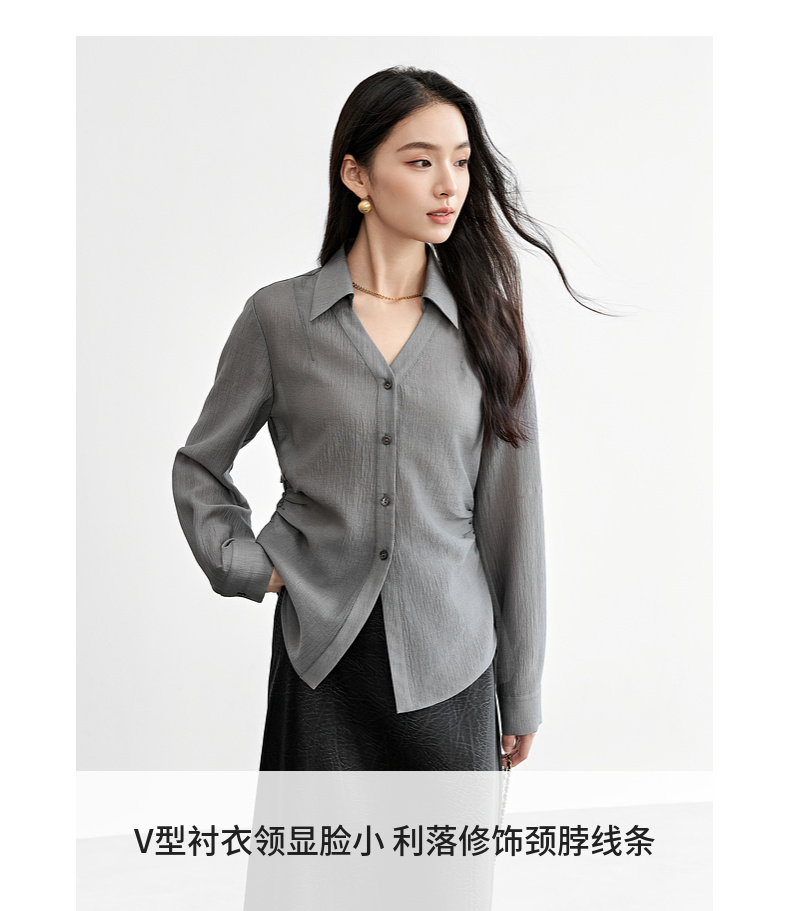 【内购】格雷系通勤V型翻领抽褶收腰显瘦遮阳空调轻氧衬衫-151C58132