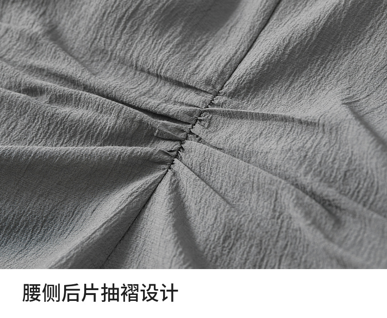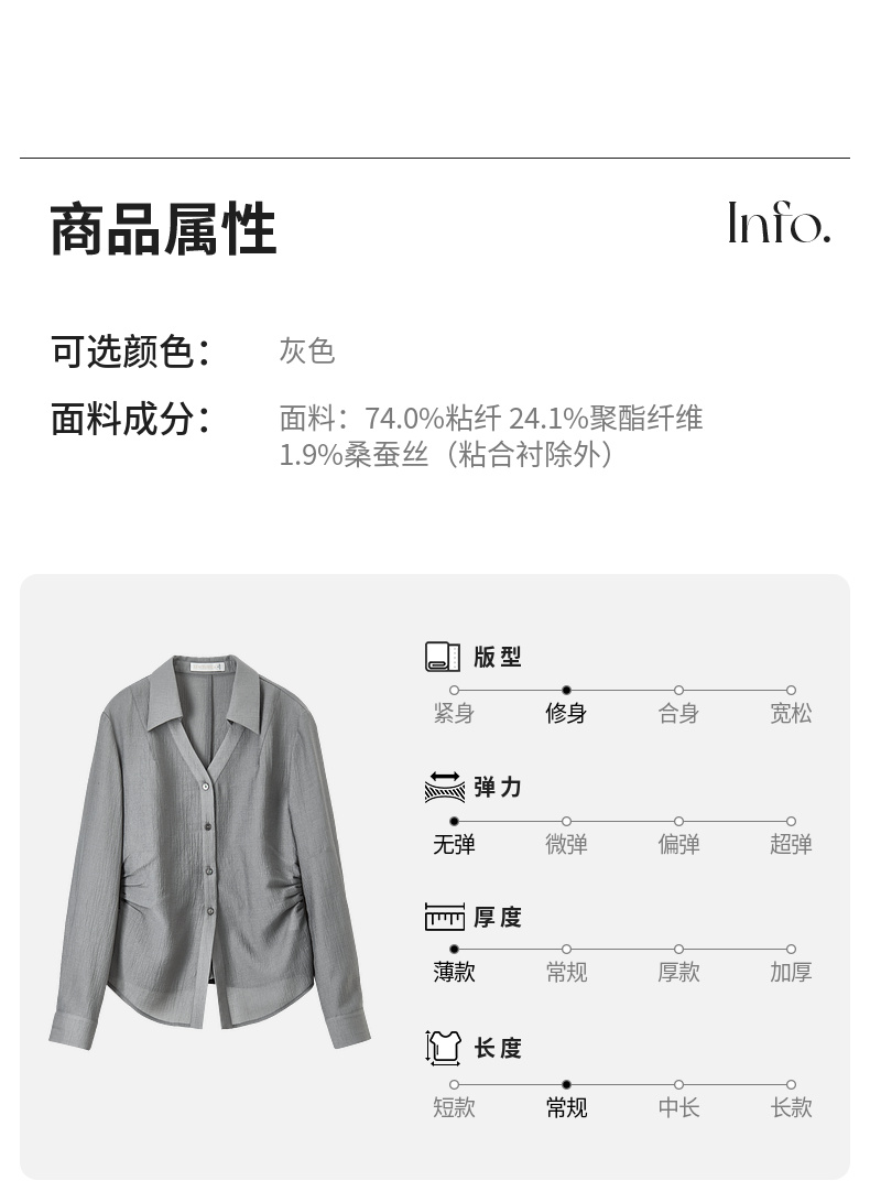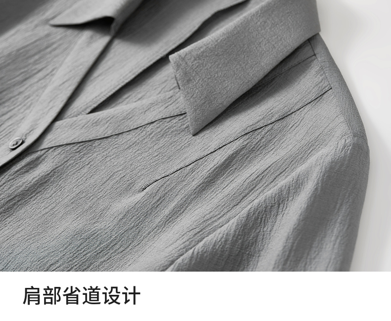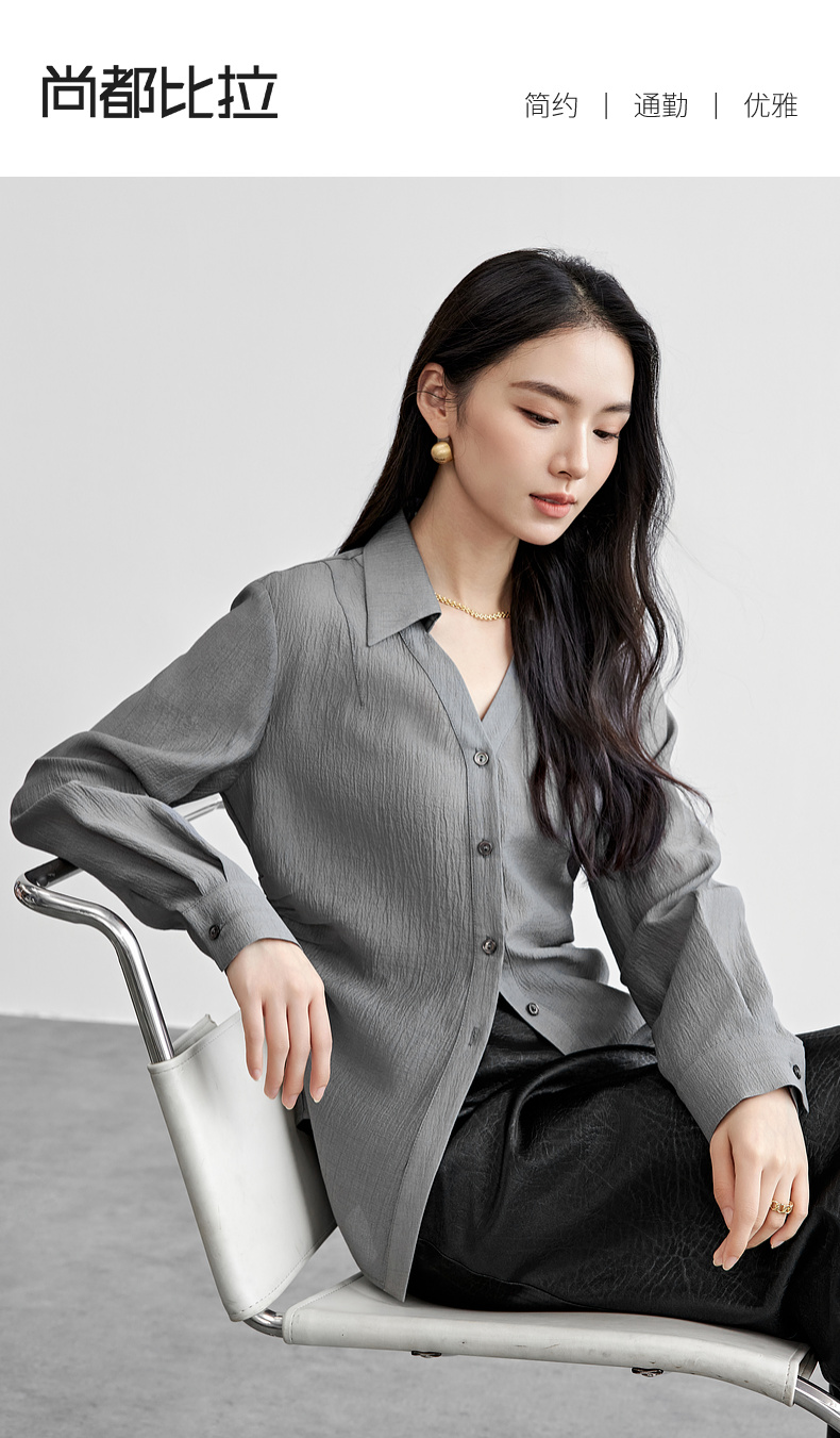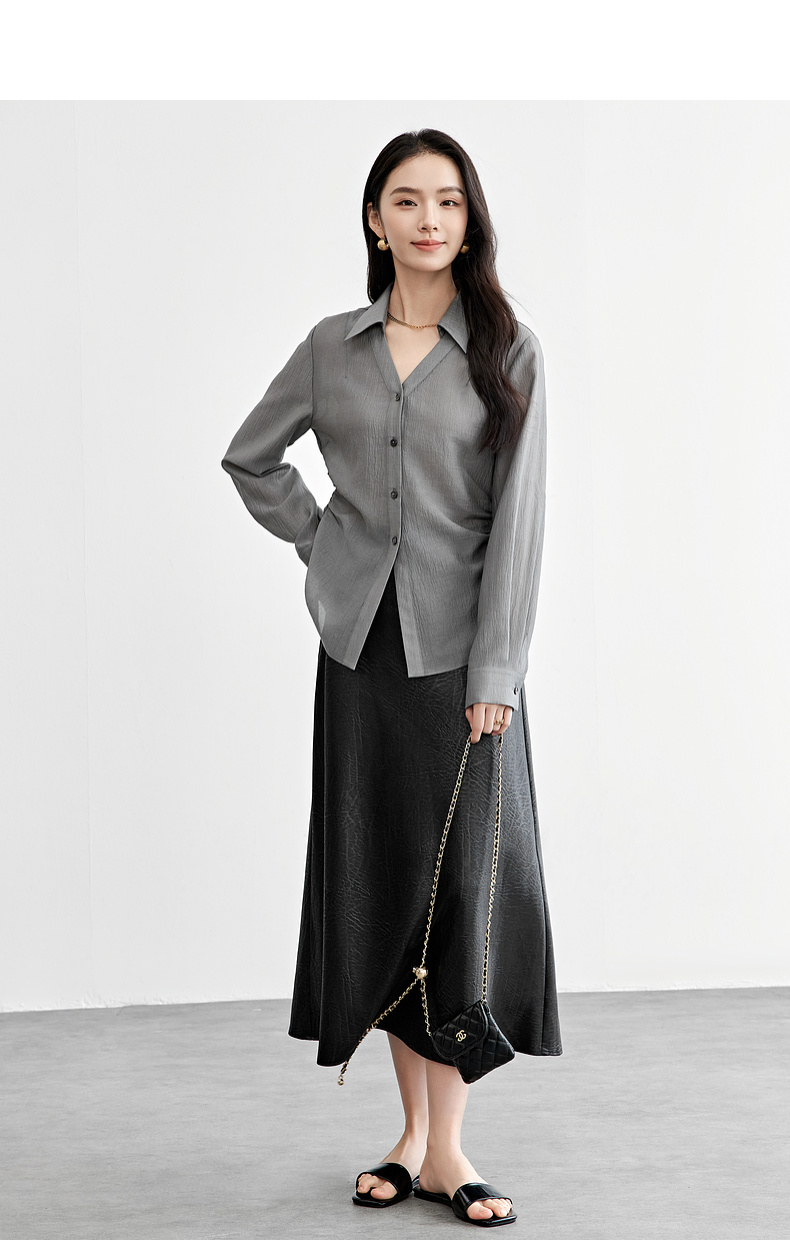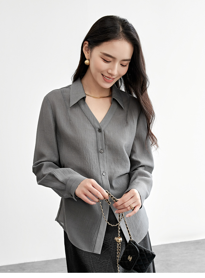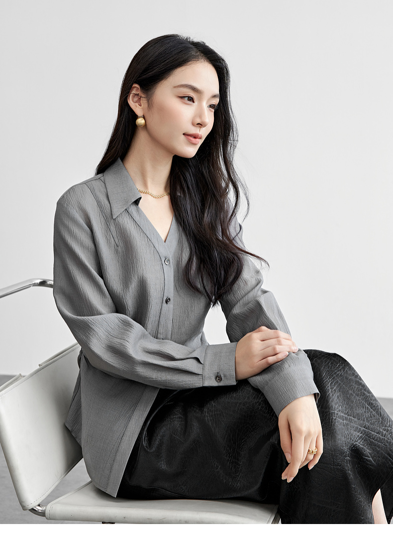 【内购】格雷系通勤V型翻领抽褶收腰显瘦遮阳空调轻氧衬衫-151C58132