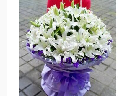 花材:99朵(约33支多头百合)精选多头西伯利亚 香水百合,勿忘我,满天星点缀