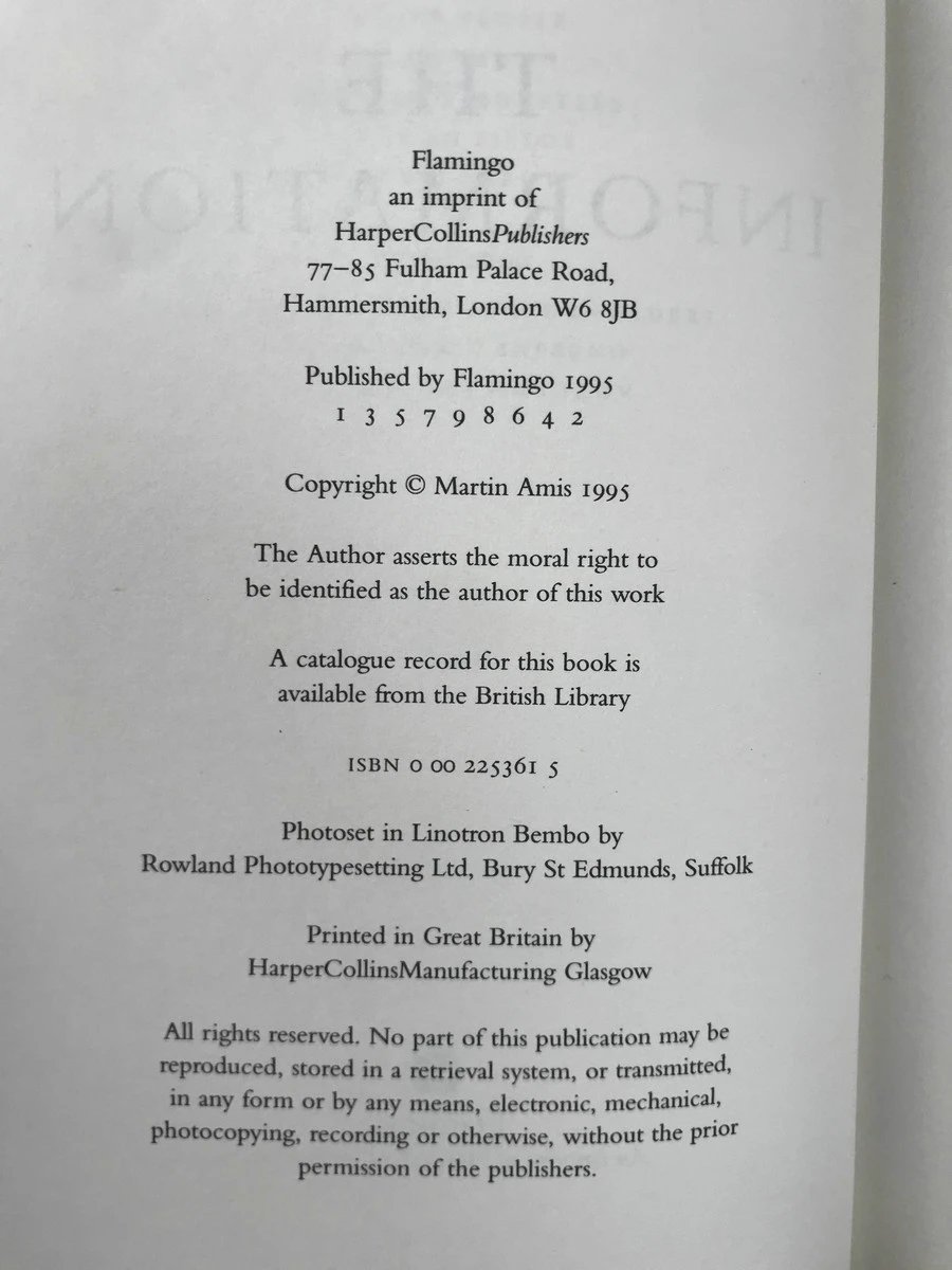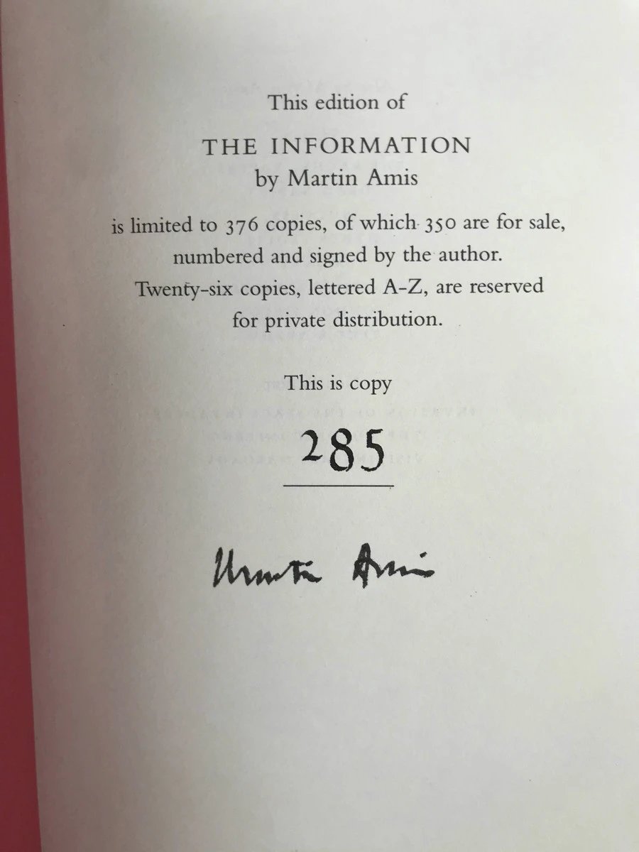 本书为仅发行376册的限量版图书,编号285,卷首有限量标示,以及作者马丁·艾米斯的亲笔签名!