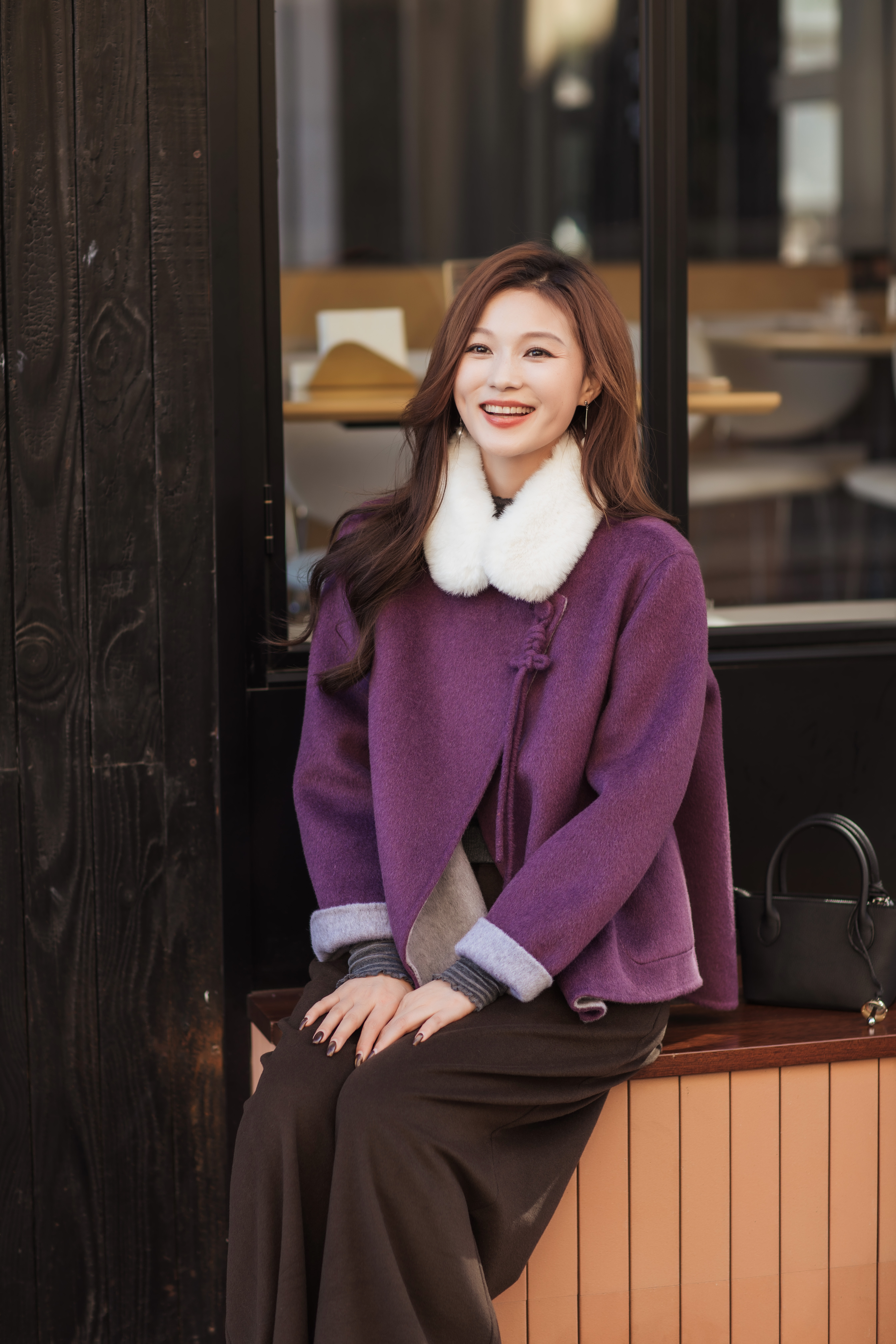 【林栖设计小店】(现货紧俏)绵羊毛双面呢紫色粉色国风新中式显瘦2025秋冬新款短款外套女T1954261