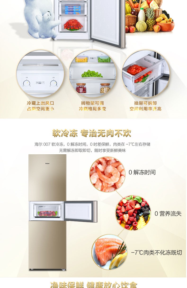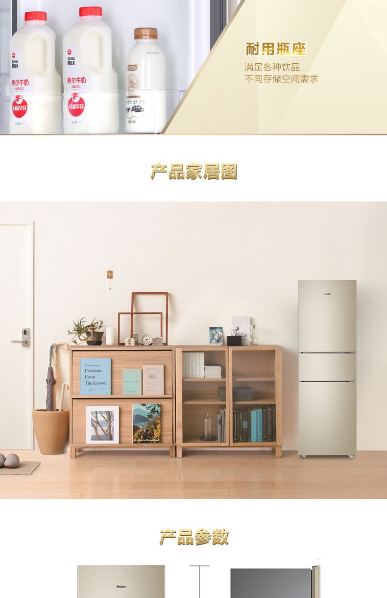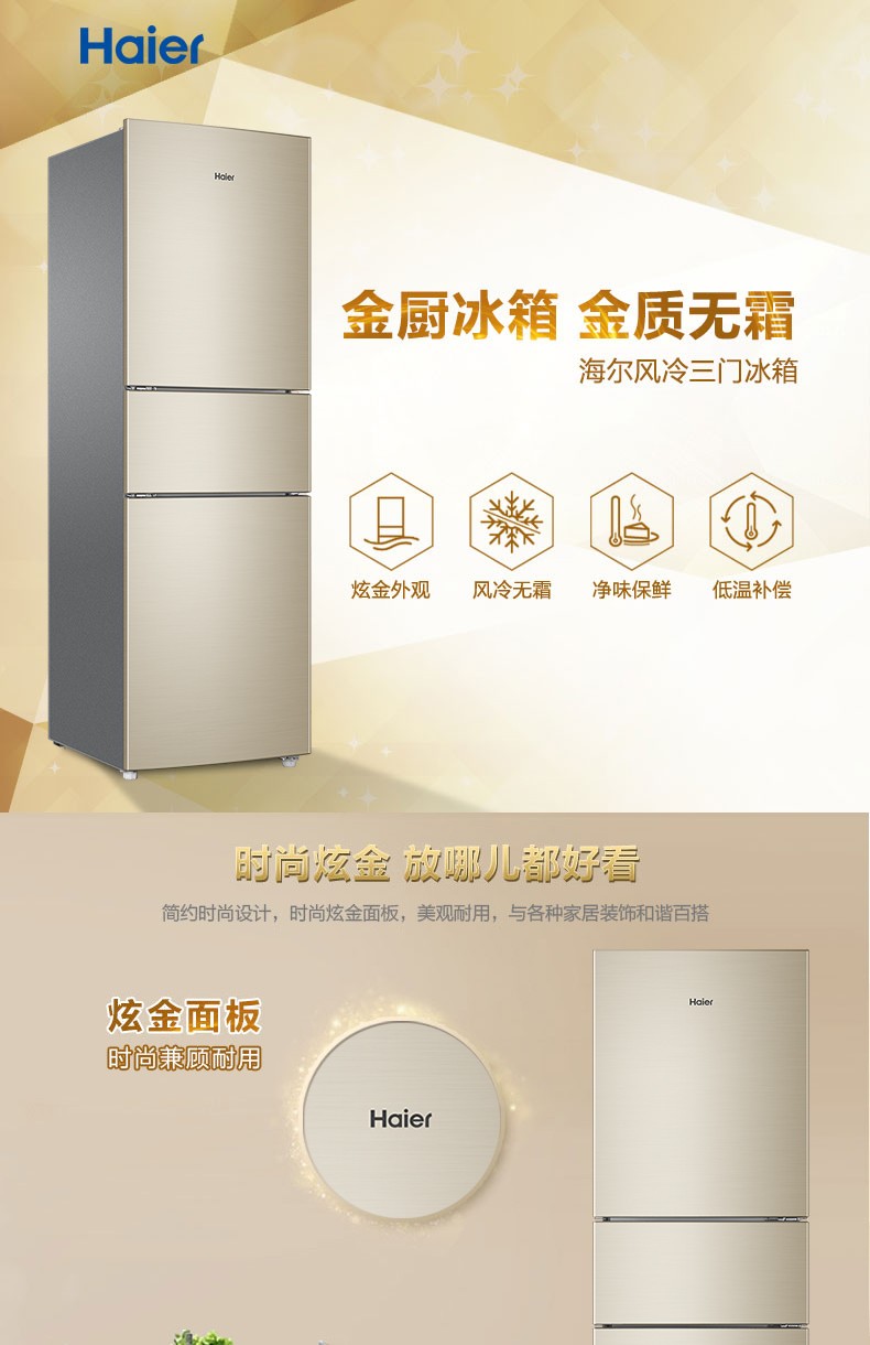 海尔(Haier) 213升 风冷无霜 大容量 家用电冰箱 三开门小型宿舍租房 炫金拉丝