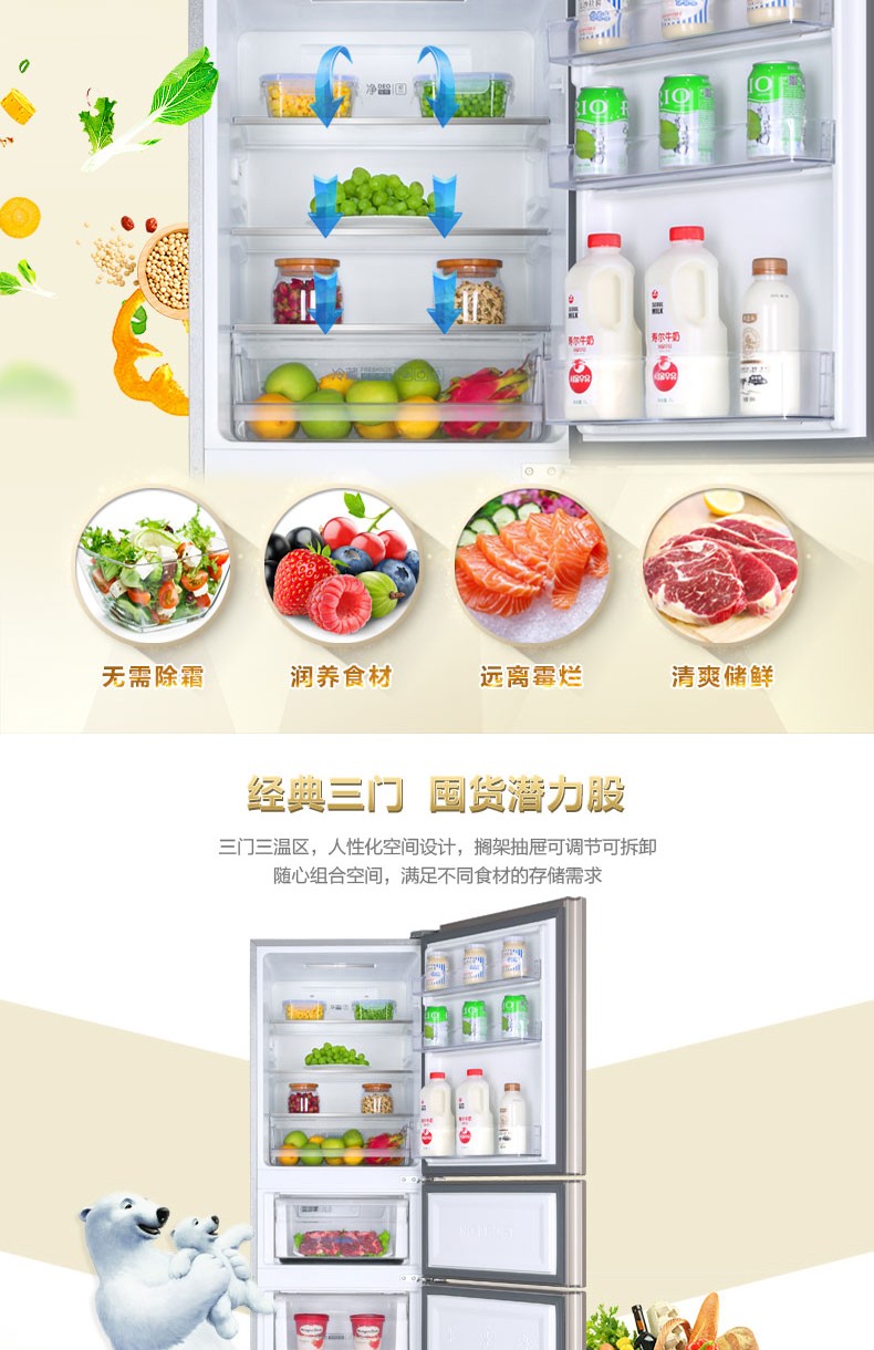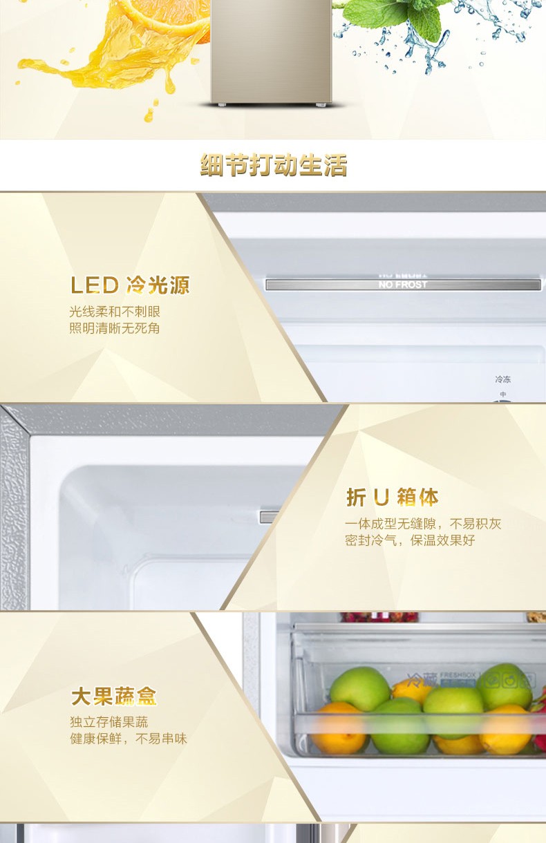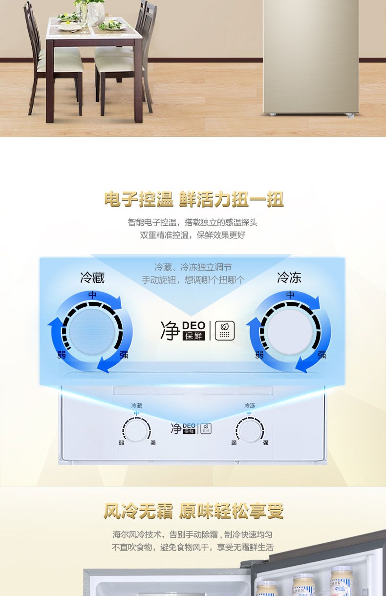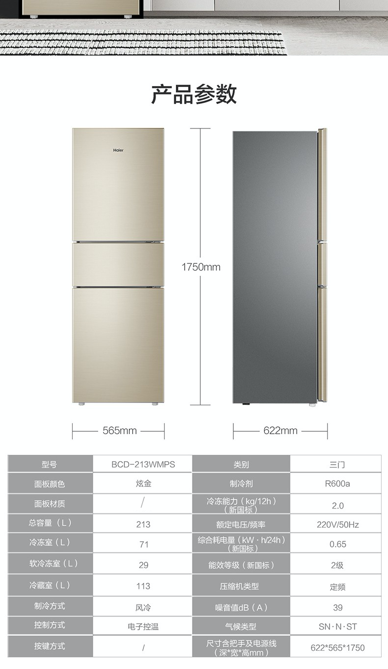 海尔(Haier) 213升 风冷无霜 大容量 家用电冰箱 三开门小型宿舍租房 炫金拉丝